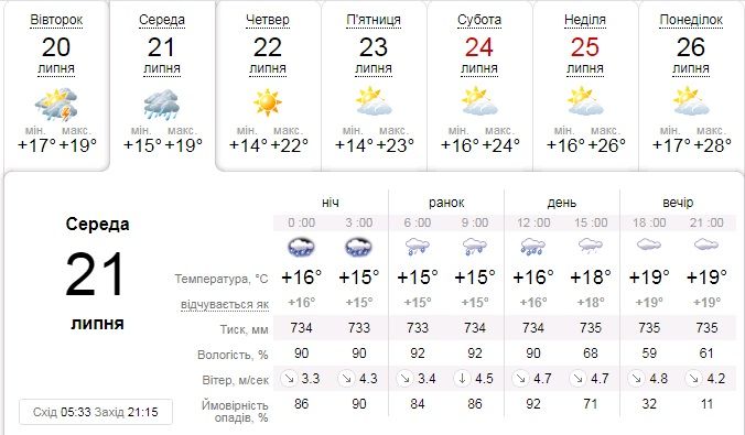 Місто: Хмарно. Вночі значний дощ. Вдень часом дощ. Гроза. Вітер північно-західний, 7 – 12 м/с, пориви 15 – 20 м/с. Температура вночі 15 – 17°, вдень 20 – 22° тепла.