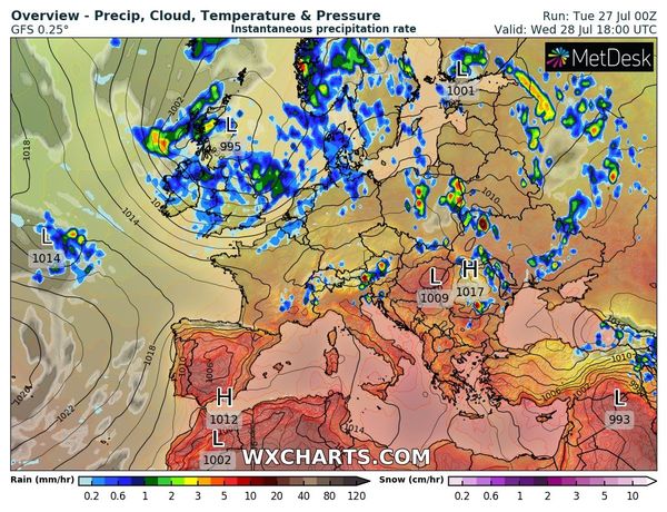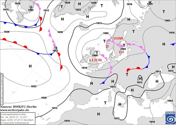 Північні циклон Elior та Dirk (карта 1) 28-го липня на своїх атмосферних фронтах носитимуть відрами дощі з грозами на значну частину Європи.