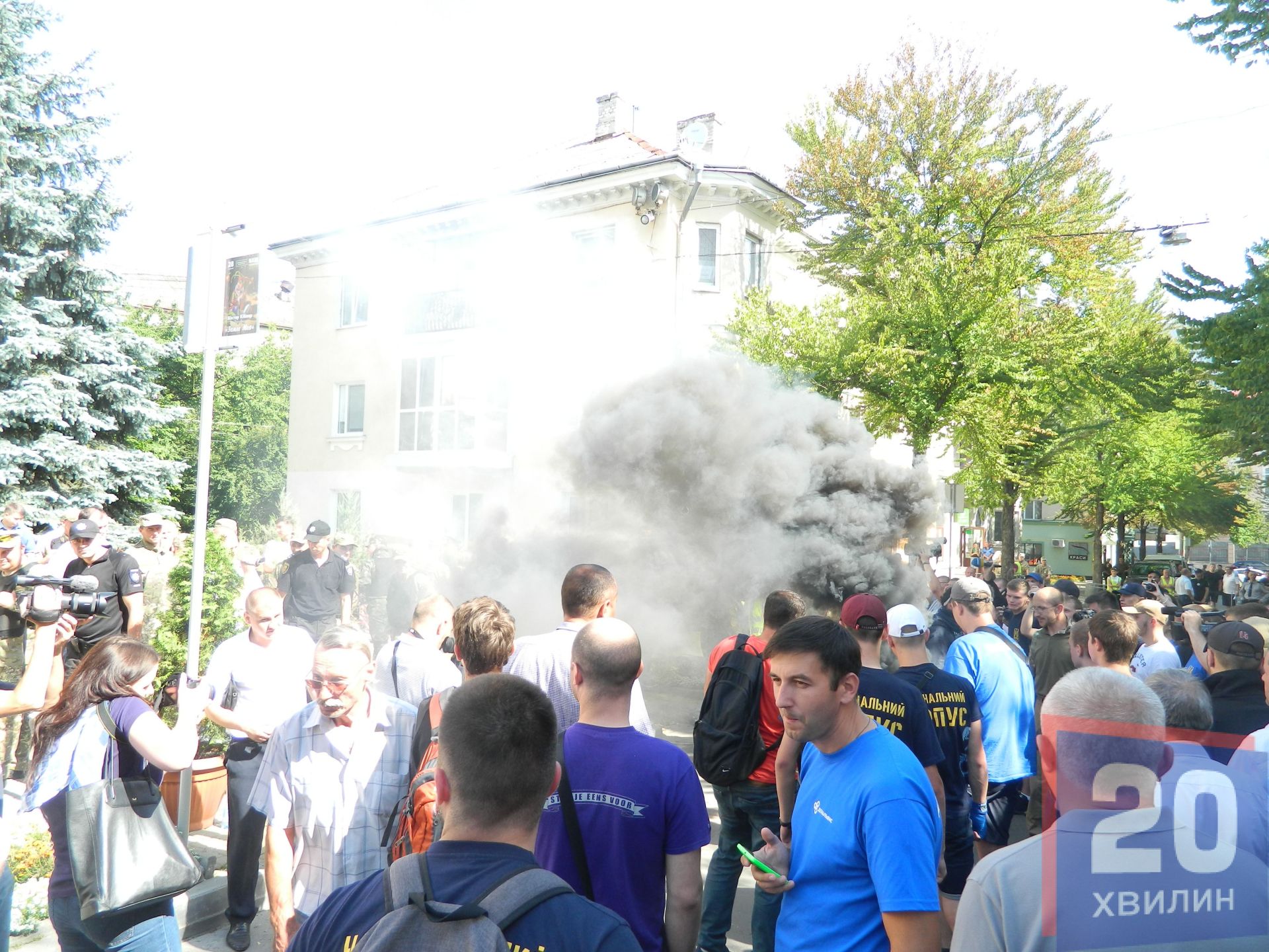 Активістам після декількох спроб, таки вдалося підпалити бочки з торфом. Їдкий чорний дим огорнув міськраду. Там же почали закривати вікна аби не отравитись. Також були запаленні декілька димових шашок, навіть запущена сигнальна ракета, з голубим димом, яка влучила тернополянці в голову - обійшлось без жертв.