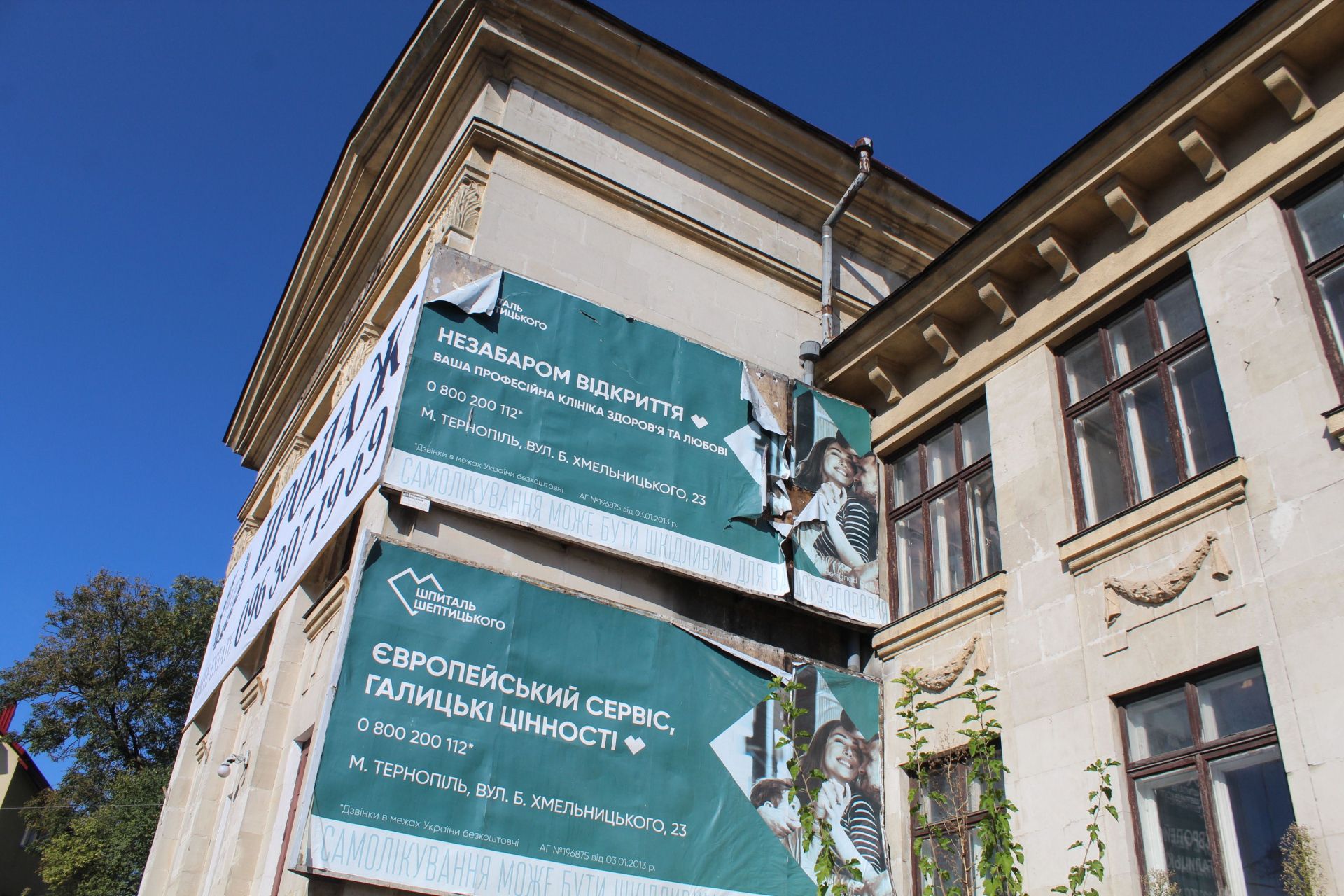 Журналістка «20 хвилин» 18 вересня побувала на проспекті Степана Бандери, аби поглянути, як зараз виглядає культовий БК «Залізничник». Перше, що кидається у вічі – це великий рекламний банер із контактами агенції нерухомості White Estate на передній стороні. Саме ця компанія займається продажем приміщення, вказано на сайті dom.ria. А ось з лівого боку реклама приватного медзакладу.