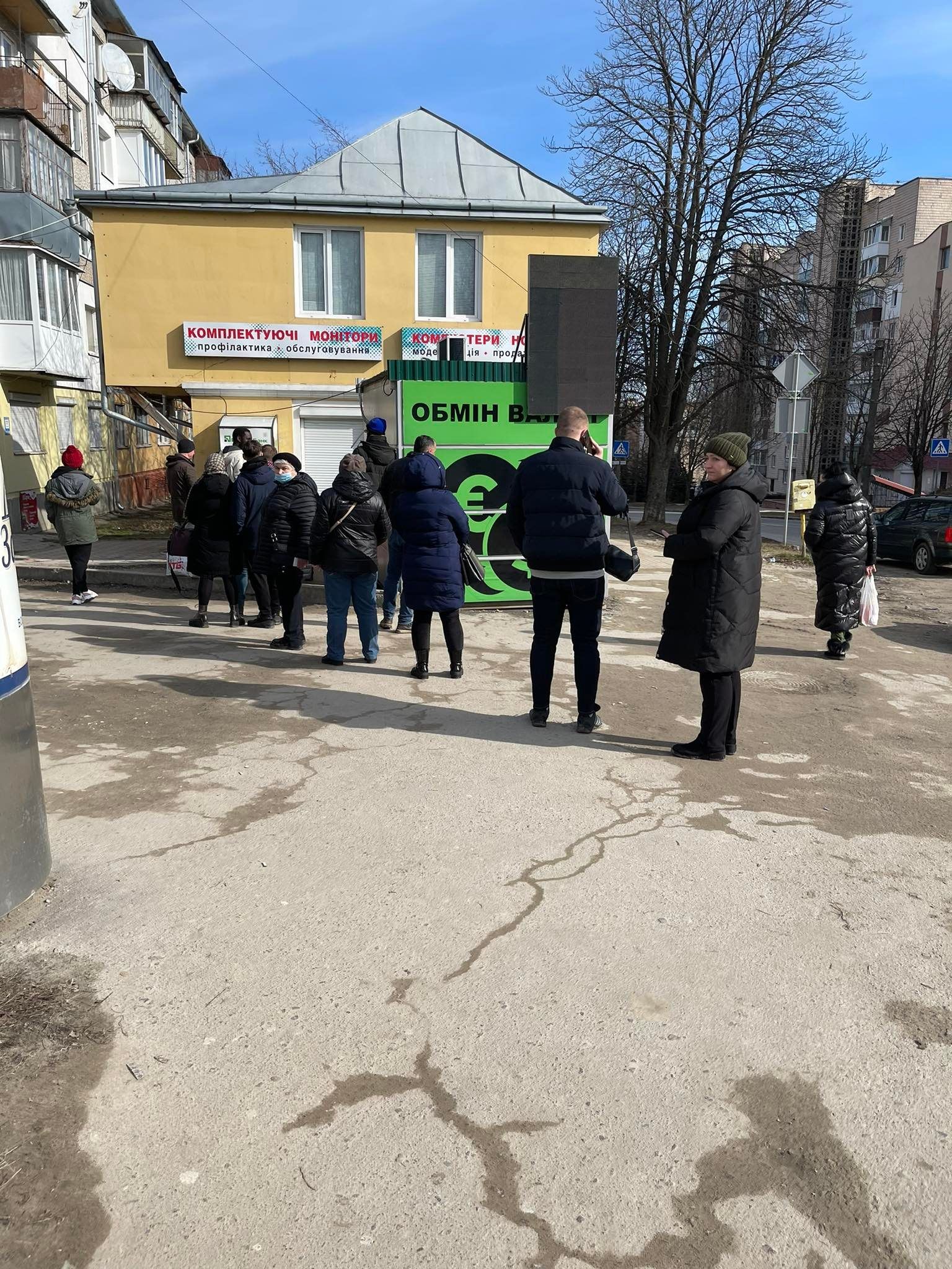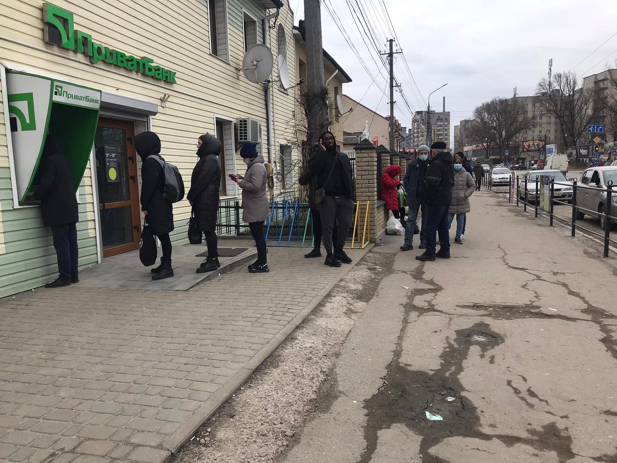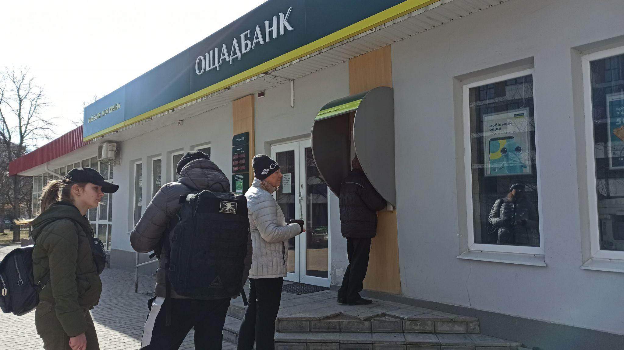 Біля відділення "Ощадбанку" (вулиця Миру, 4-а) не проводились транзакції із карток інших банків (зокрема, "Привату"), однак готівка спершу була. Згодом черга тут налічувала п'ятеро тернополян, що хотіли зняти гроші, але вони закінчилися. Містяни діляться - бігають від одного банкомату до іншого у надії встигнути отримати хоч трохи готівки.