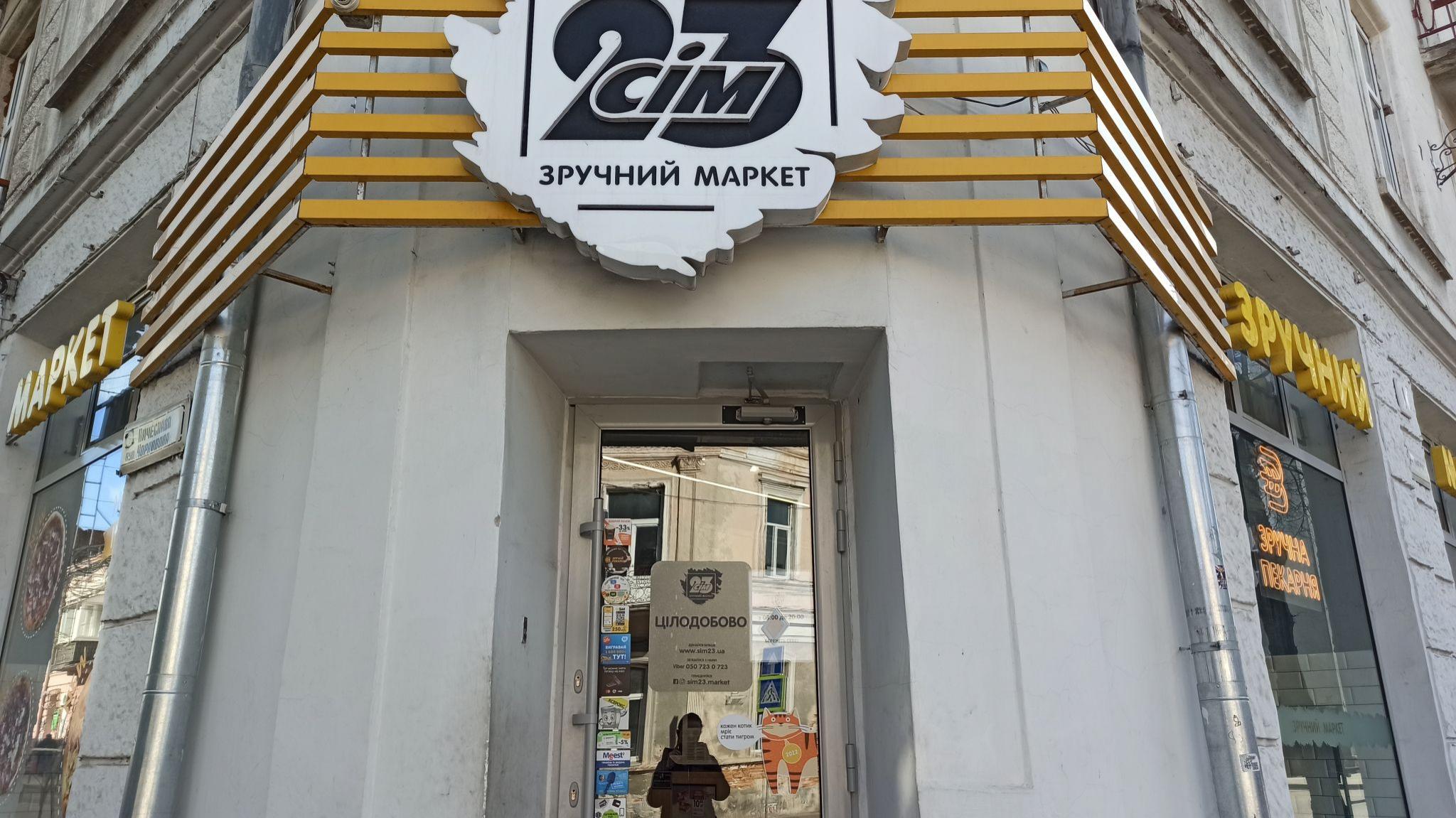 Маркет "Сім 23" (вулиця Миру, 5, біля ПК "Березіль") працює без перебоїв. Розрахуватися картою тут можна без проблем, поки є всі продукти, окрім хлібобулочних виробів.