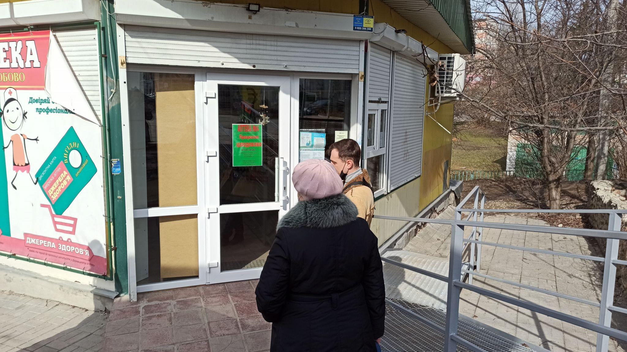 До аптеки "ЗІ", що по вулиці Миру, недалеко від маркету "АТБ", покупців прийшло дуже багато. Черга велика що надворі, що всередині приміщення - по четверо осіб. На дверях висить оголошення, написане від руки, про те, що аптека працює зараз за графіком вихідних - до 19:00. Багатьох медикаментів уже немає, тому фармацевтка підбирає для клієнтів ліки із тим же складом, що й у відсутніх. Жінка наголошує - поки є можливість розрахуватись картою. Невідомо, що буде потім.