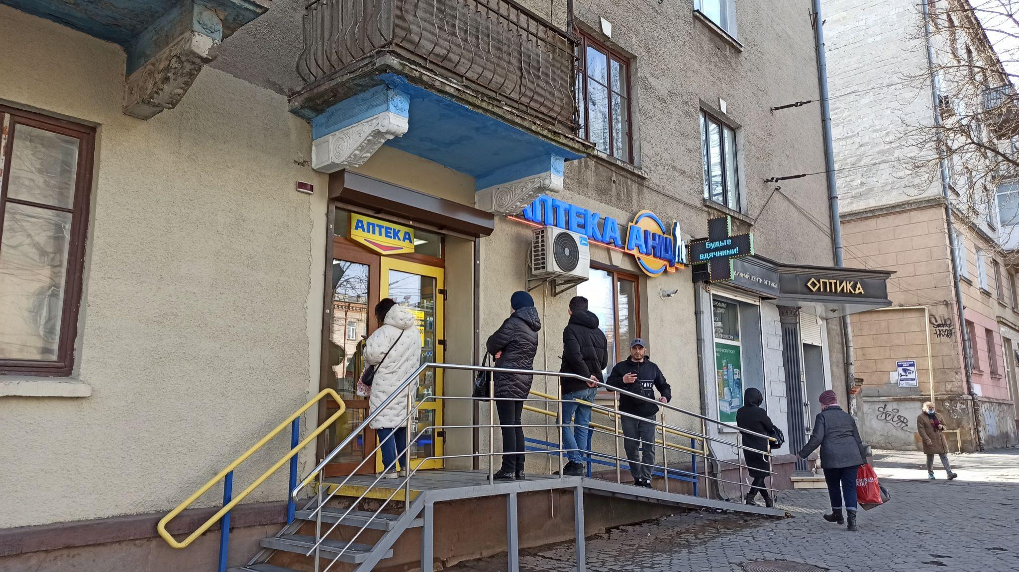 До аптеки "Анц" (вулиця Руська, 20, навпроти ТКФК) надворі стоїть черга із п'яти містян. Можна розрахуватись картою.