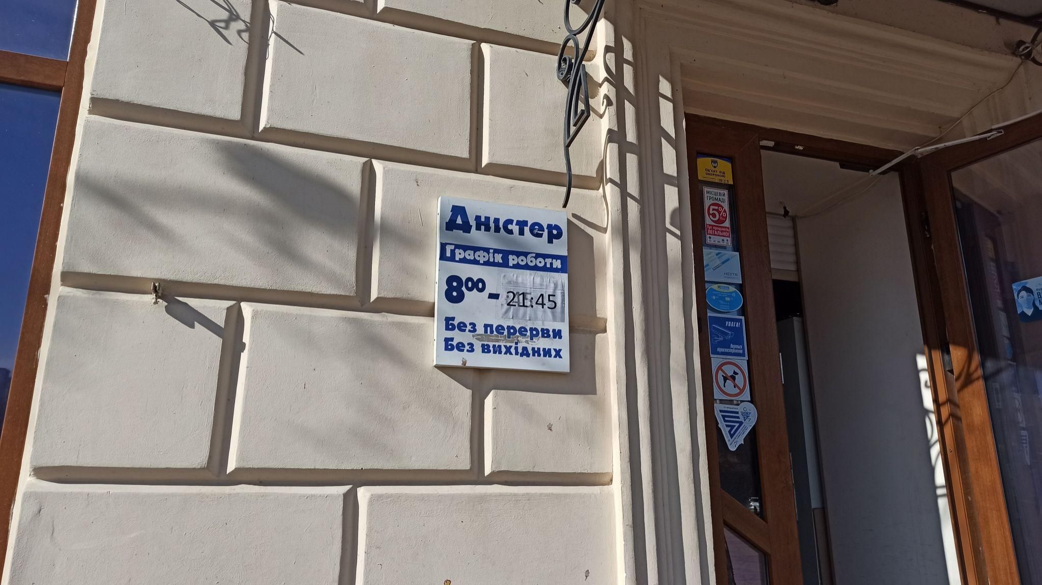 Продовольчий магазин "Дністер", що на бульварі Тараса Шевченка, 10, працює зараз лише до 20:00. Так зазначено на графіку, котрий висить просто на будівлі. У магазині залишилось мало круп, хліба і м'ясних виробів. Можна розрахуватись через термінал.