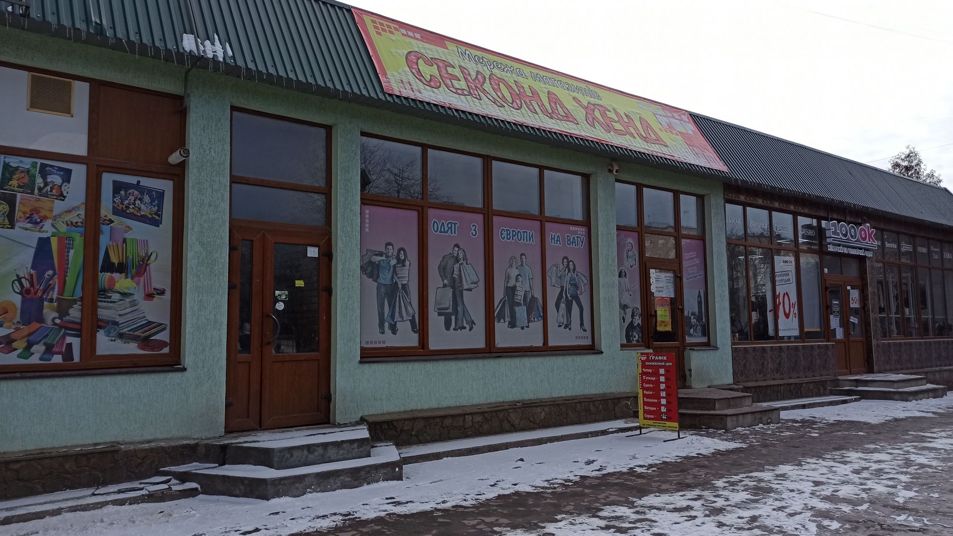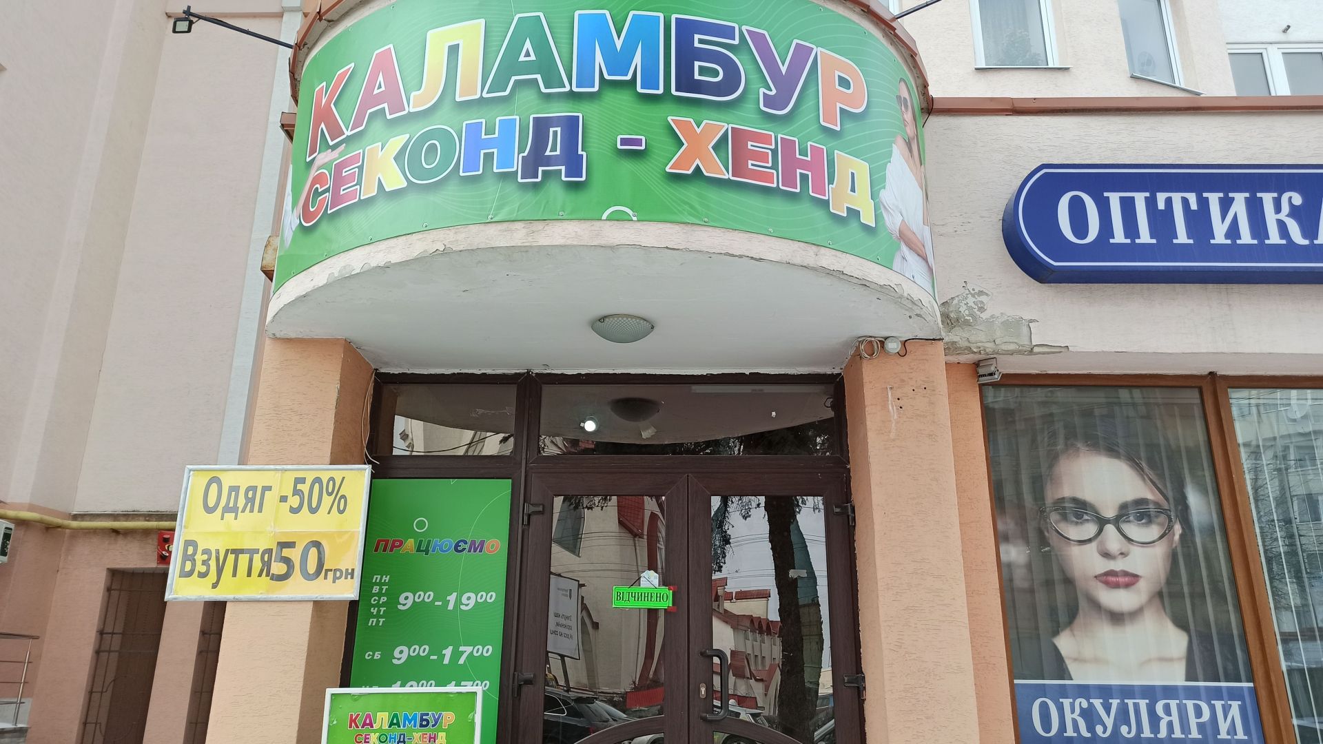 Секонд-хенд «Каламбур». Адреса: вулиця Слівенська, 70. Працюють повноцінно. У цьому магазині одягу наразі дуже багато.