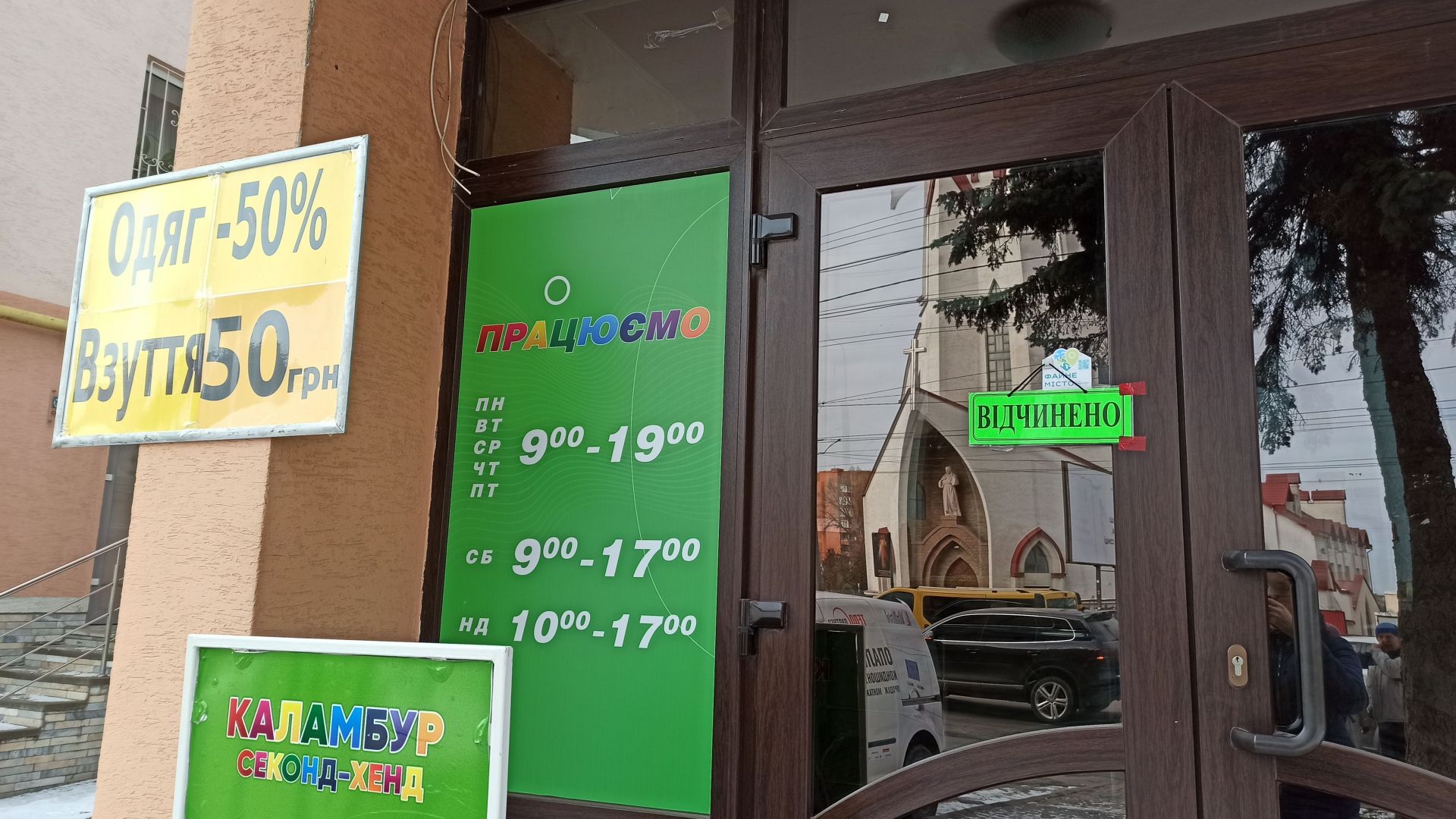 Адреса: бульвар Тараса Шевченка, 35. Цей секонд-хенд відчинений уже третій день. На дверях висить інформаційний аркуш – працюють з 9:00 до 17:00.
