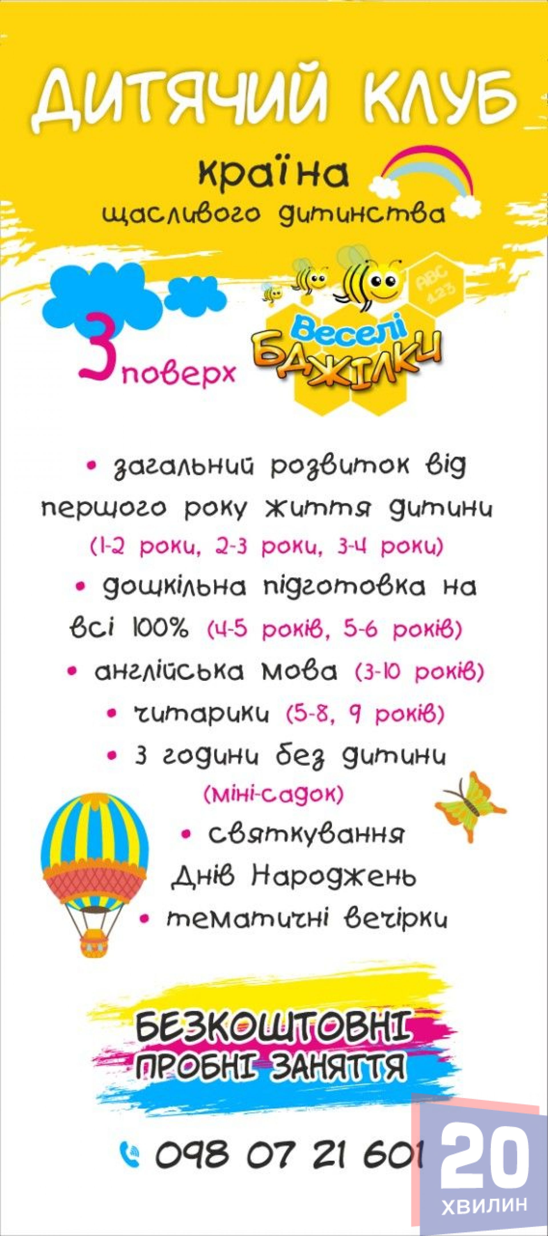 Дитячий Клуб "Веселі Бджілки" - розвиток дітей з перших років життя дитини за новітніми світовими методиками. Дитячий клуб «ВЕСЕЛІ БДЖІЛКИ» — ідеальний вибір як для дітей, так і для турботливих батьків, які піклуються про ранній розвиток своїх малюків. Дитячий клуб «ВЕСЕЛІ БДЖІЛКИ» подарує дітям та їхнім батькам цікаві та яскраві моменти в поєднанні з сучасними розвиваючими методиками.