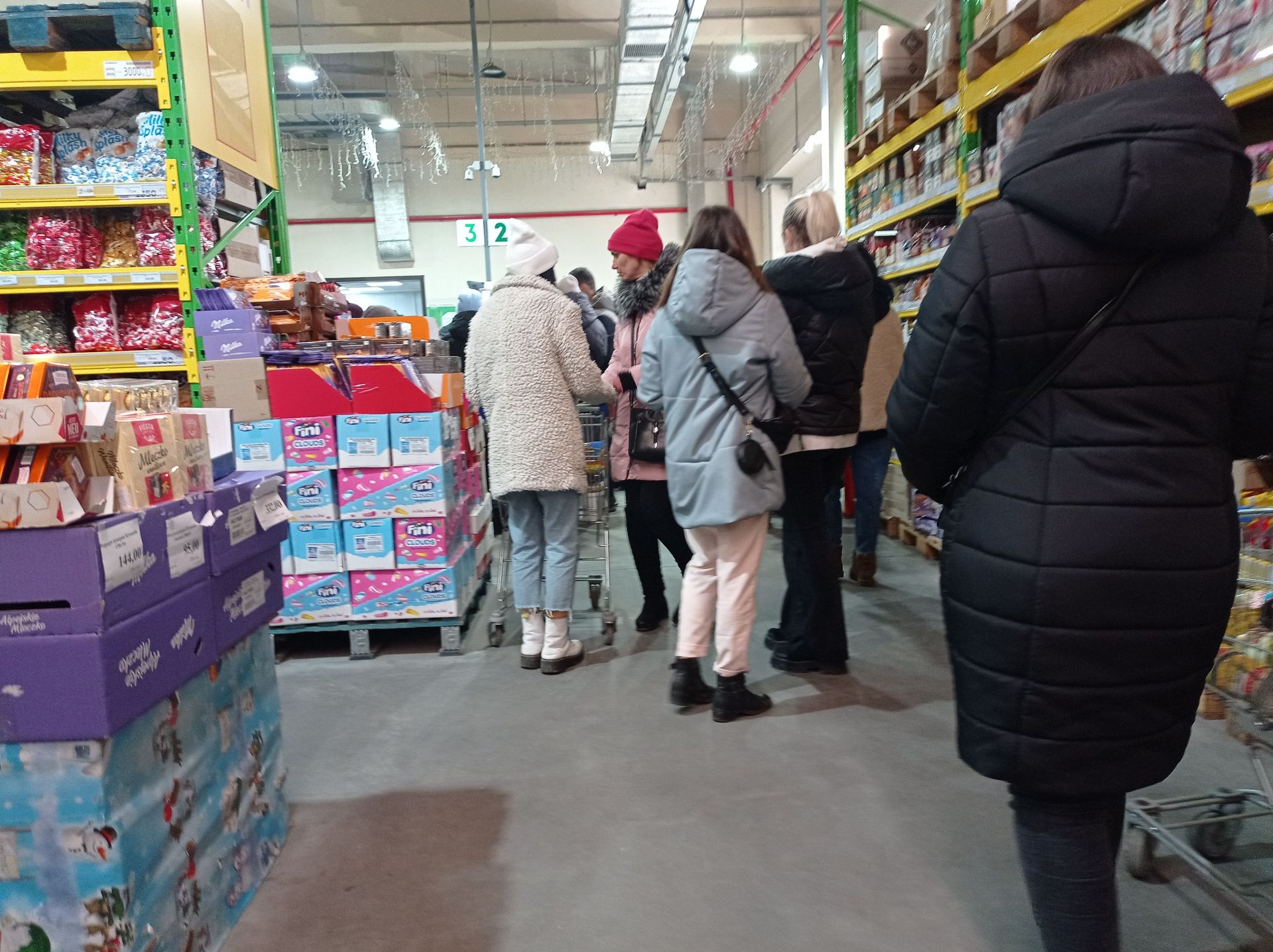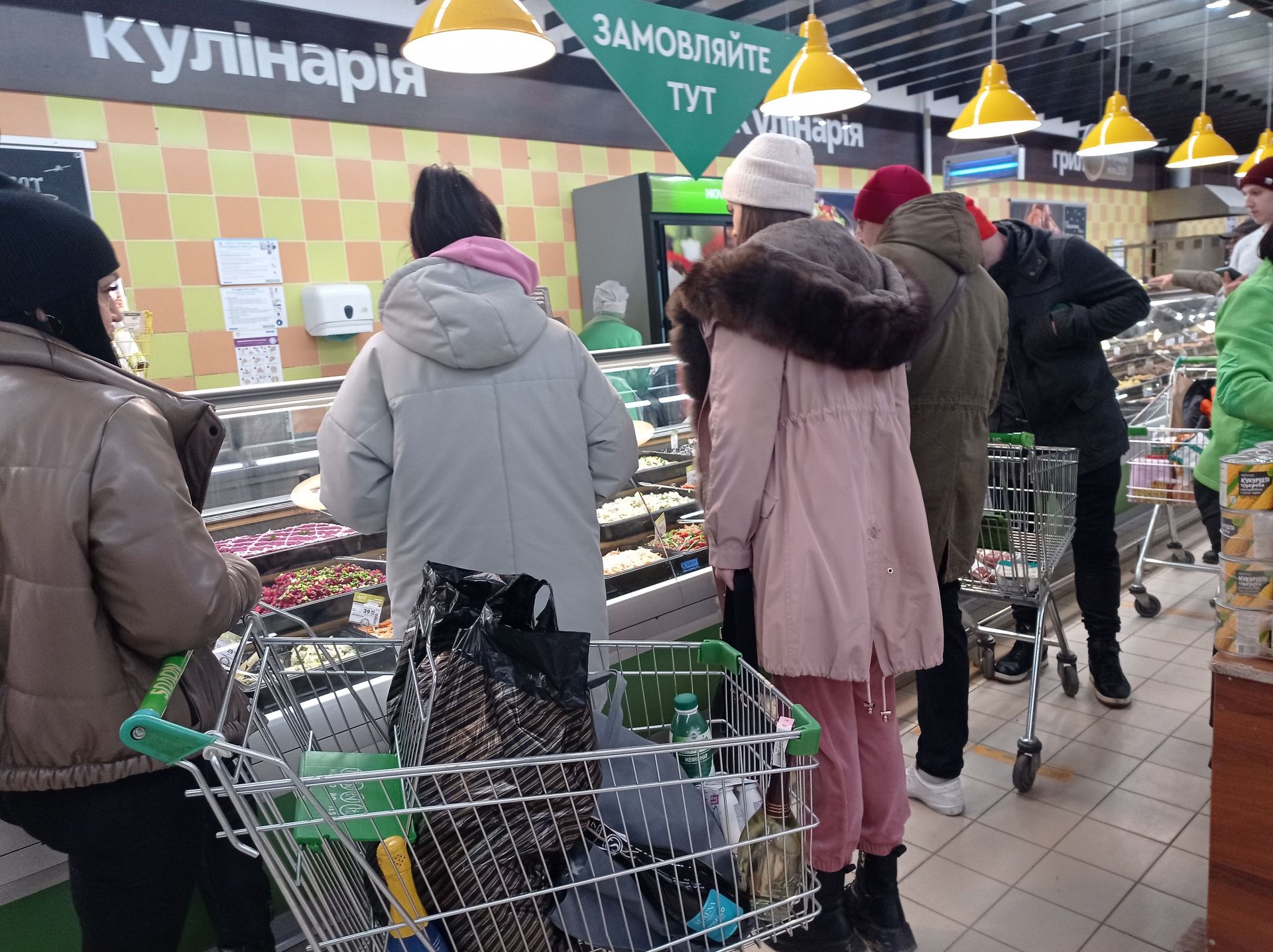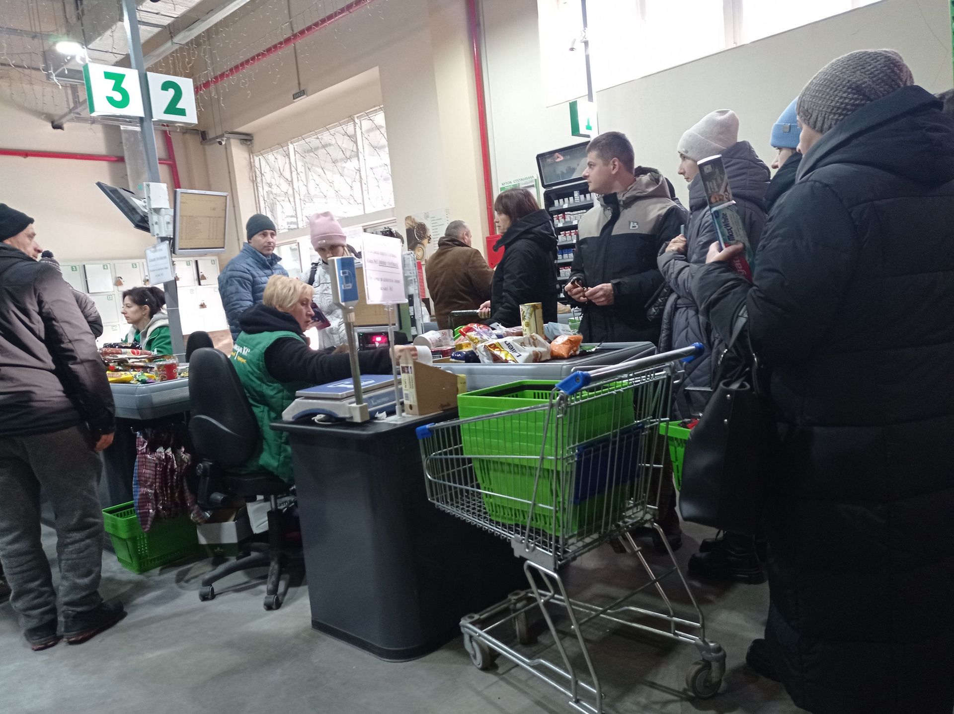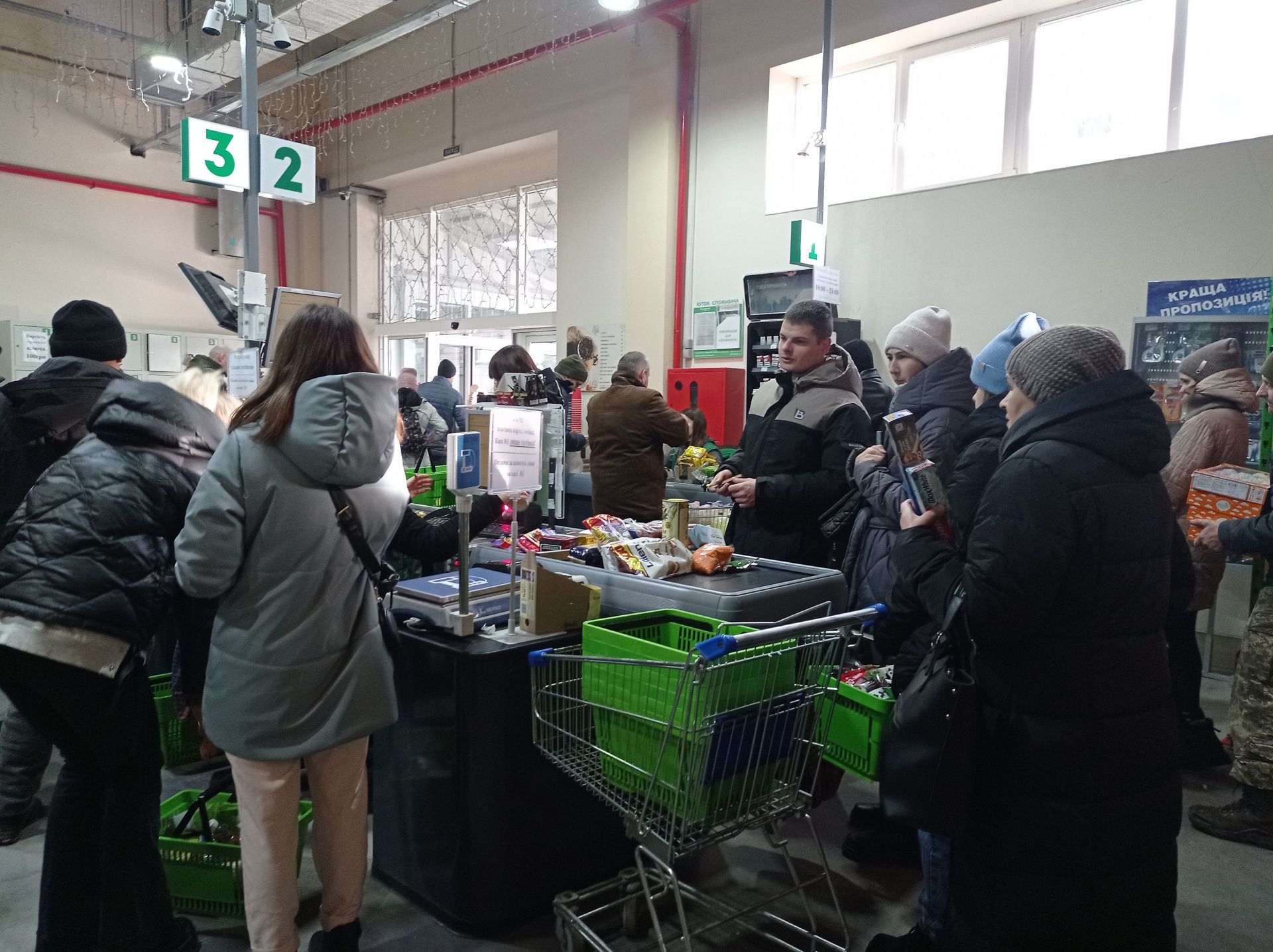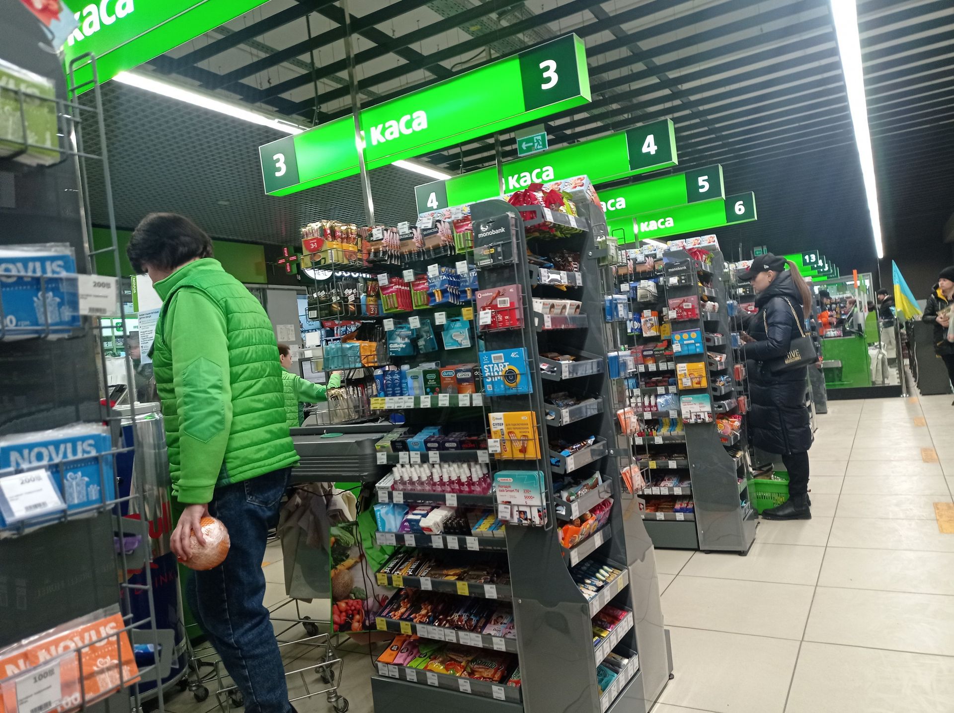 Тут дуже багато людей. Працює три каси з чотирьох, а до кожної з них стоять по кілька десятків покупців. Черги тягнуться від половини торгового залу. Хоча касири намагаються швидше впоратись з роботою, процес видачі продуктів затягується, бо містяни купують велику кількість товарів.