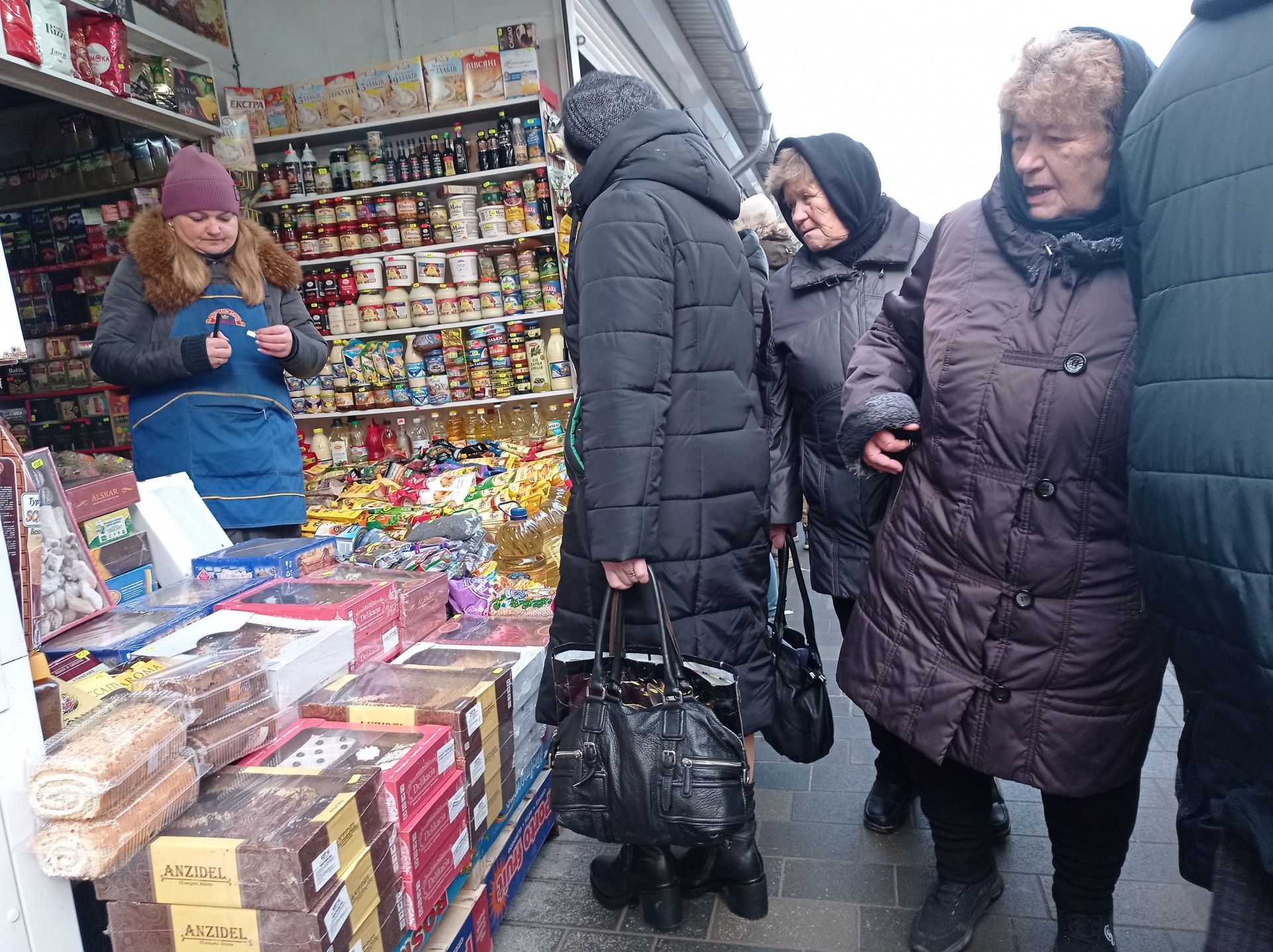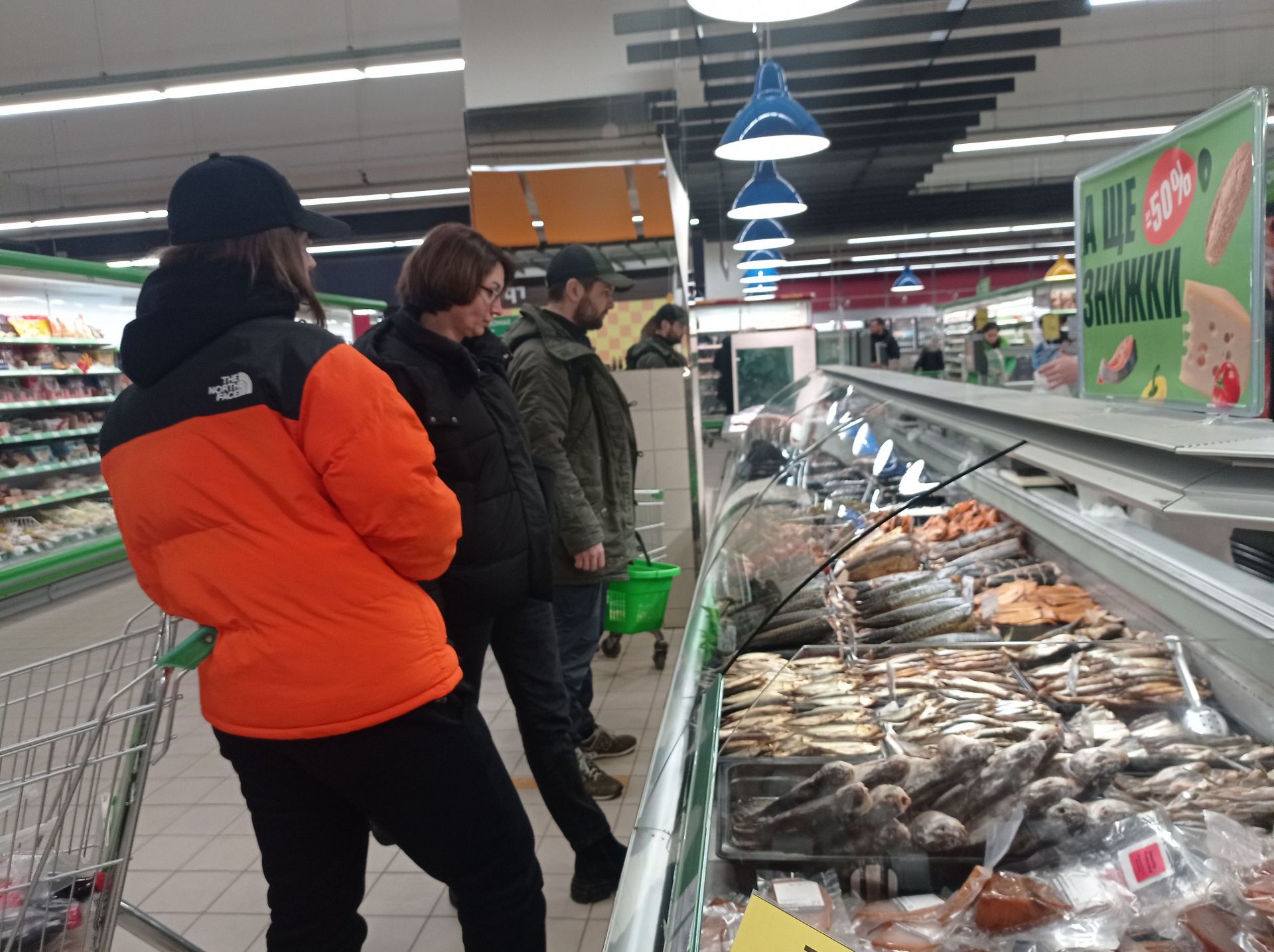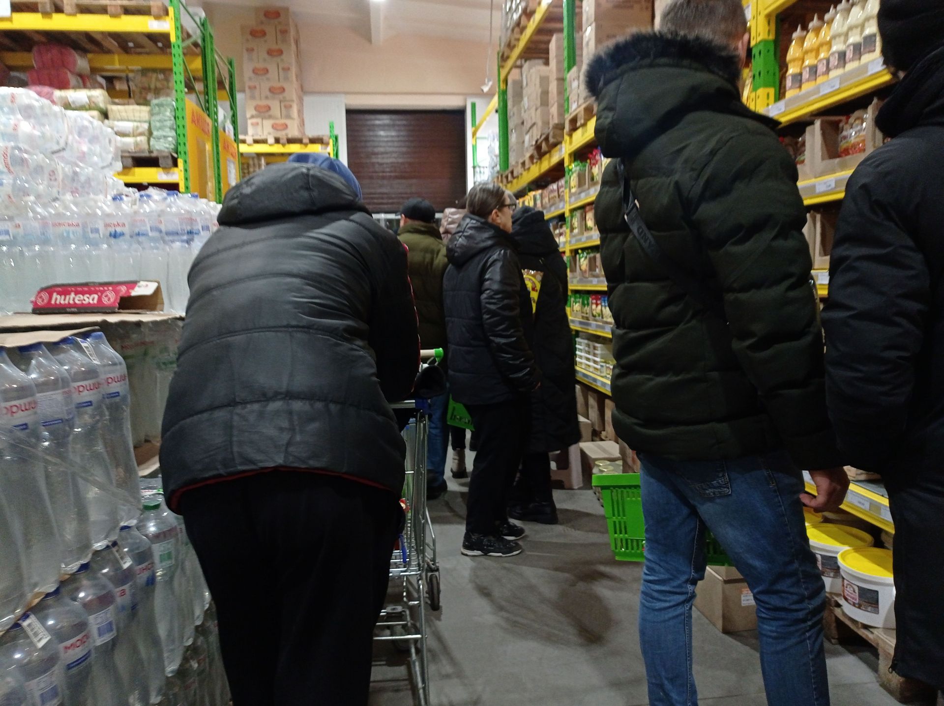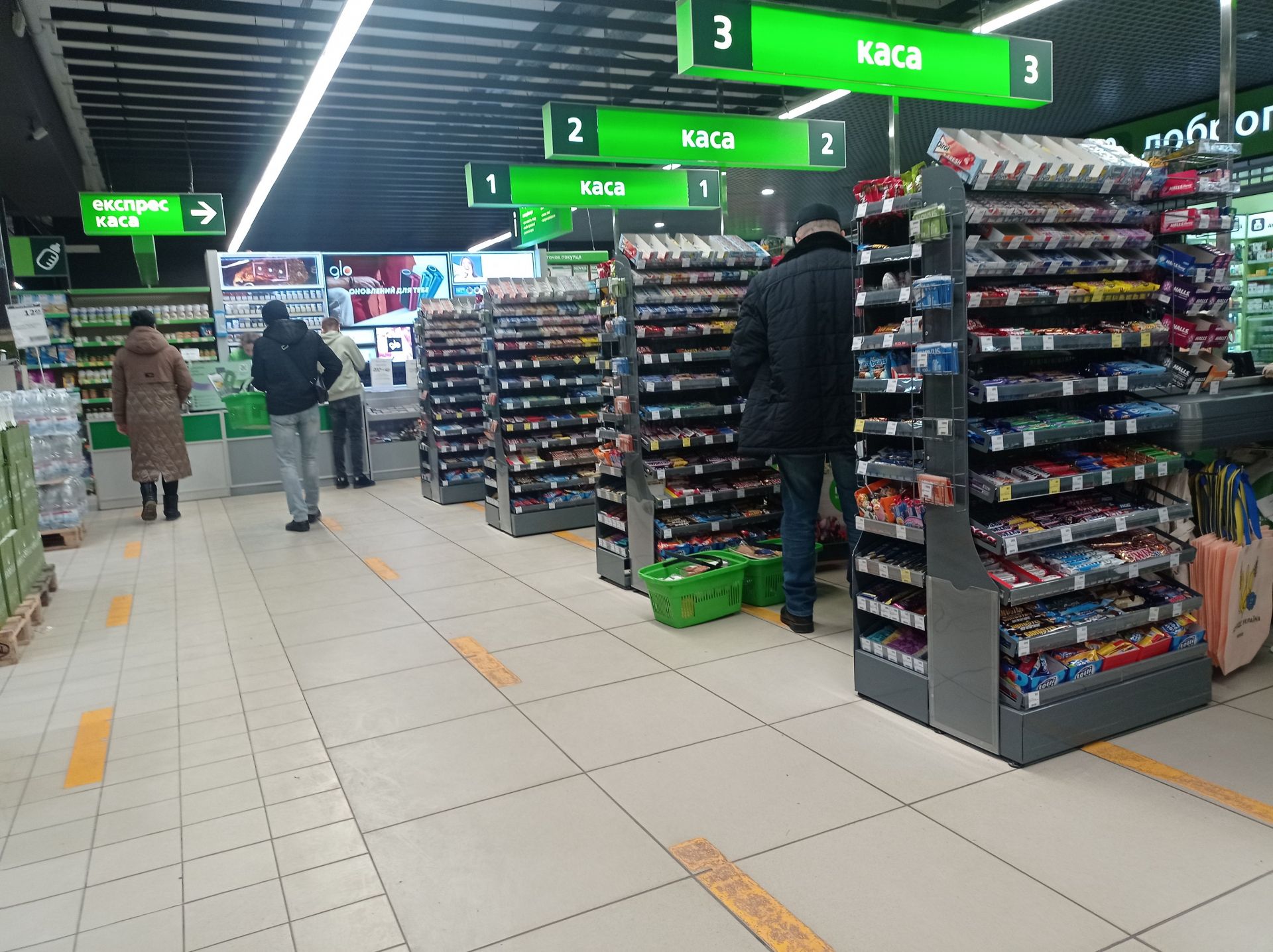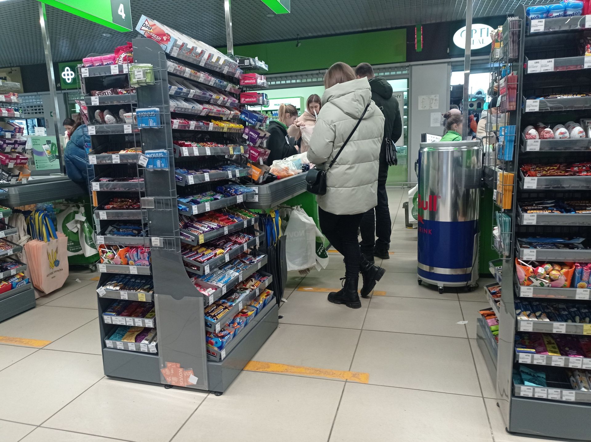 Тут дуже багато людей. Працює три каси з чотирьох, а до кожної з них стоять по кілька десятків покупців. Черги тягнуться від половини торгового залу. Хоча касири намагаються швидше впоратись з роботою, процес видачі продуктів затягується, бо містяни купують велику кількість товарів.