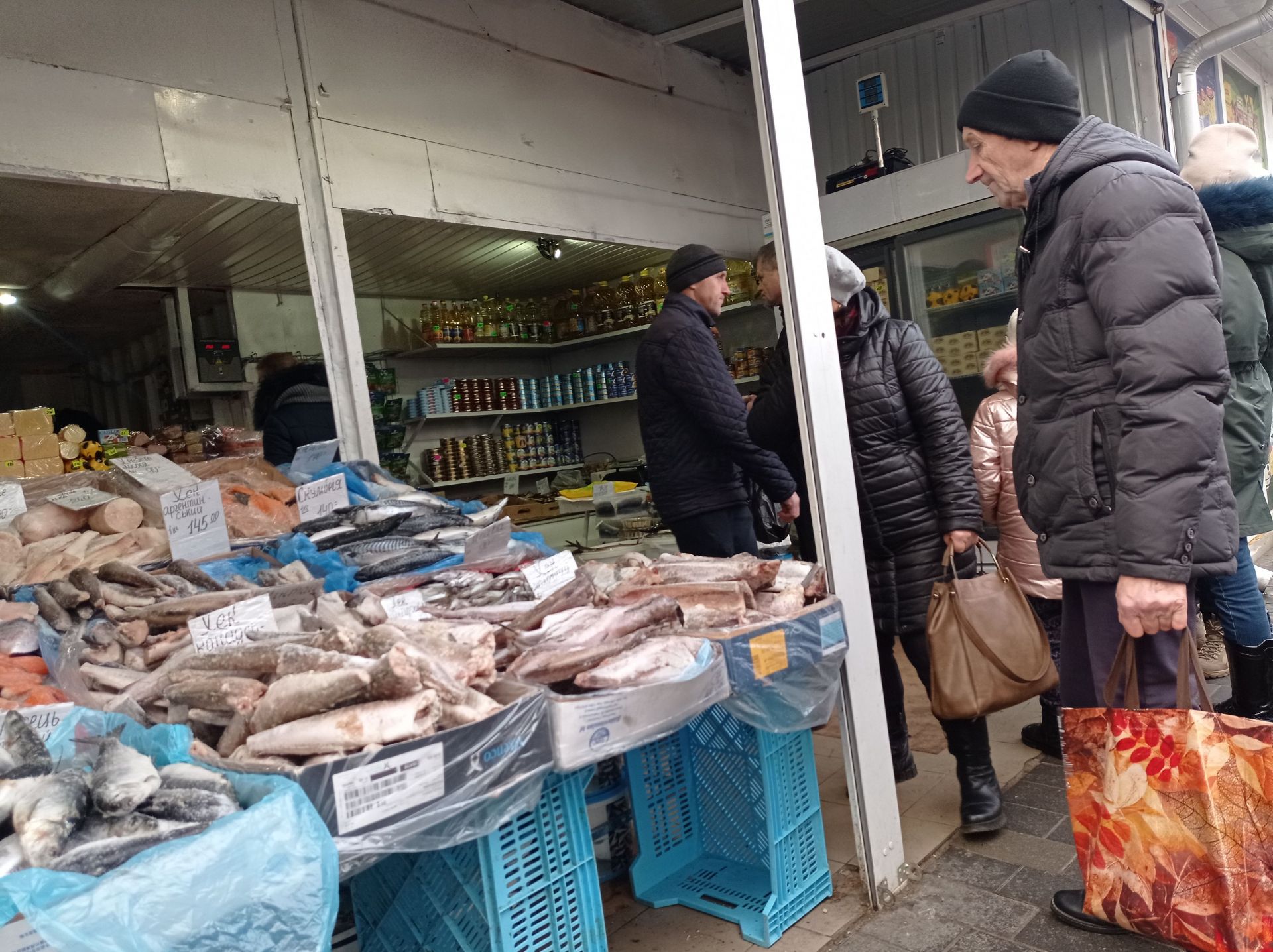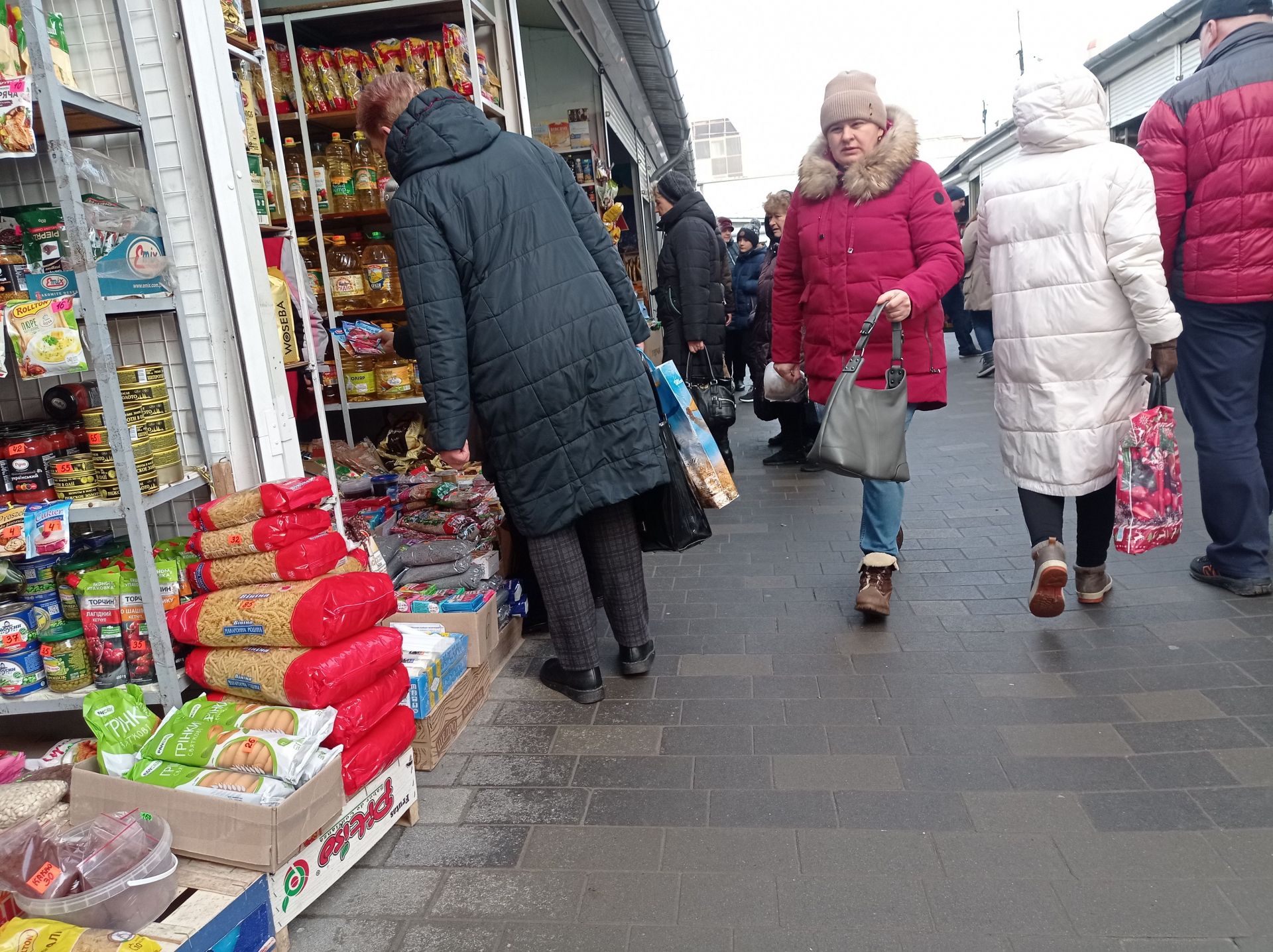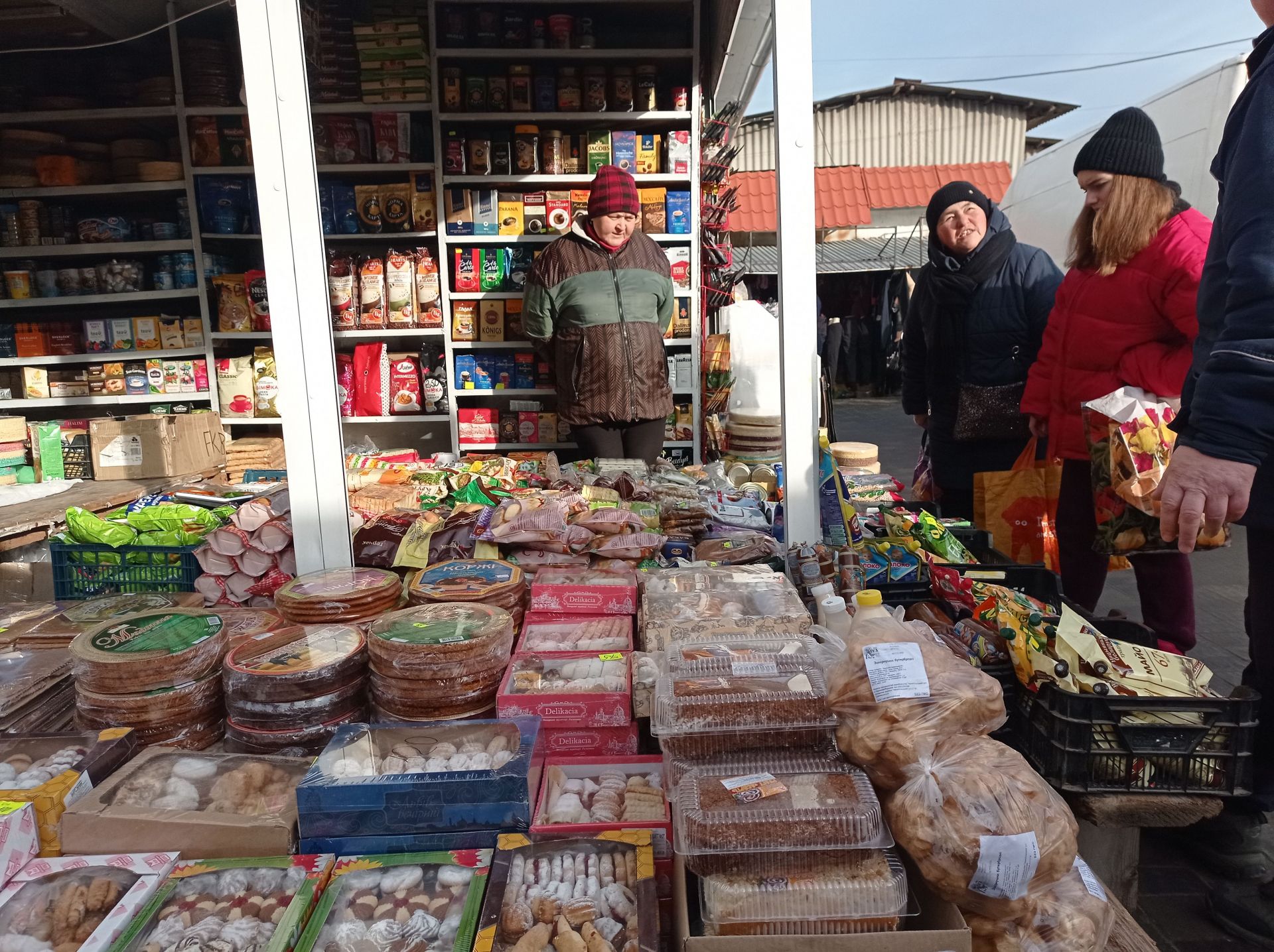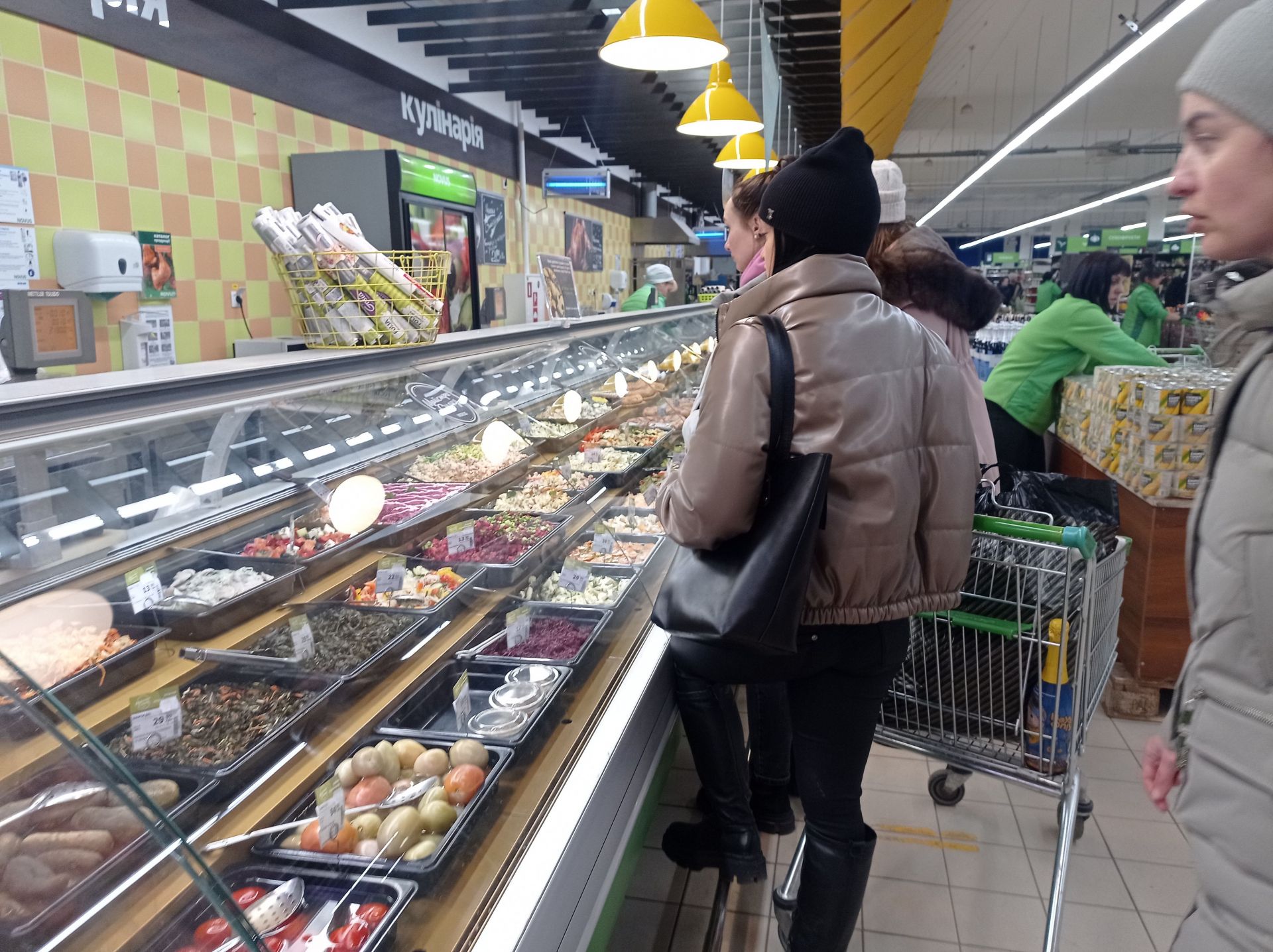 Деякі люди прийшли купити готову продукцію: салати, різні страви, кондитерські вироби. Біля вітрин, де їх продають, зібрались десятки охочих. Також як завше у корзинах містян хліб, м’ясо, солодощі, продукти на салати та інше.