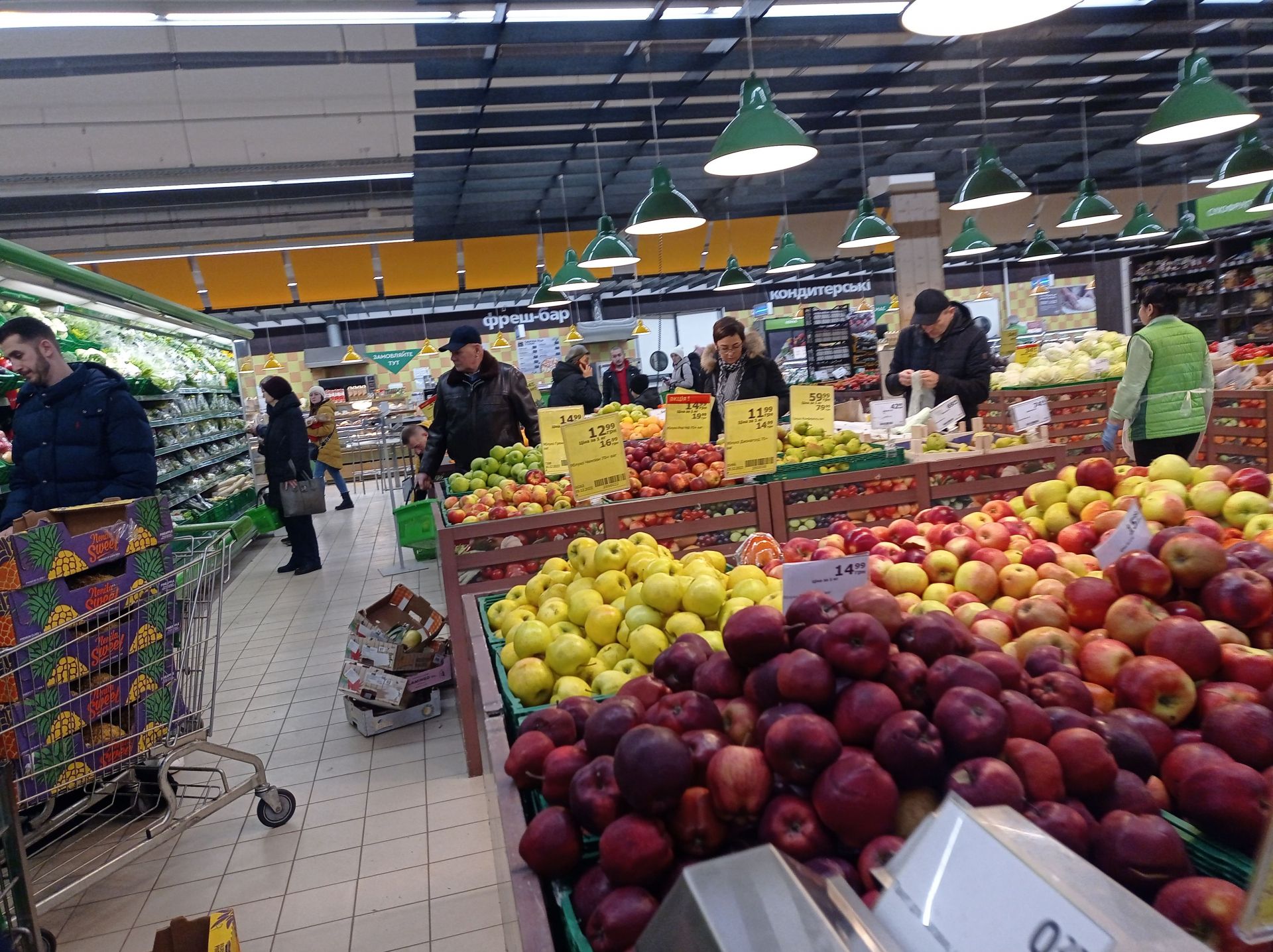 Як і в багатьох інших магазинах міста, сюди завезли багато хліба – у відділі стоять кілька повних кошиків та ще одна ятка. Також у супермаркеті виставили ящики з мандаринами. Загалом, найпопулярніших товарів завезли й виклали у торговому залі побільше.
