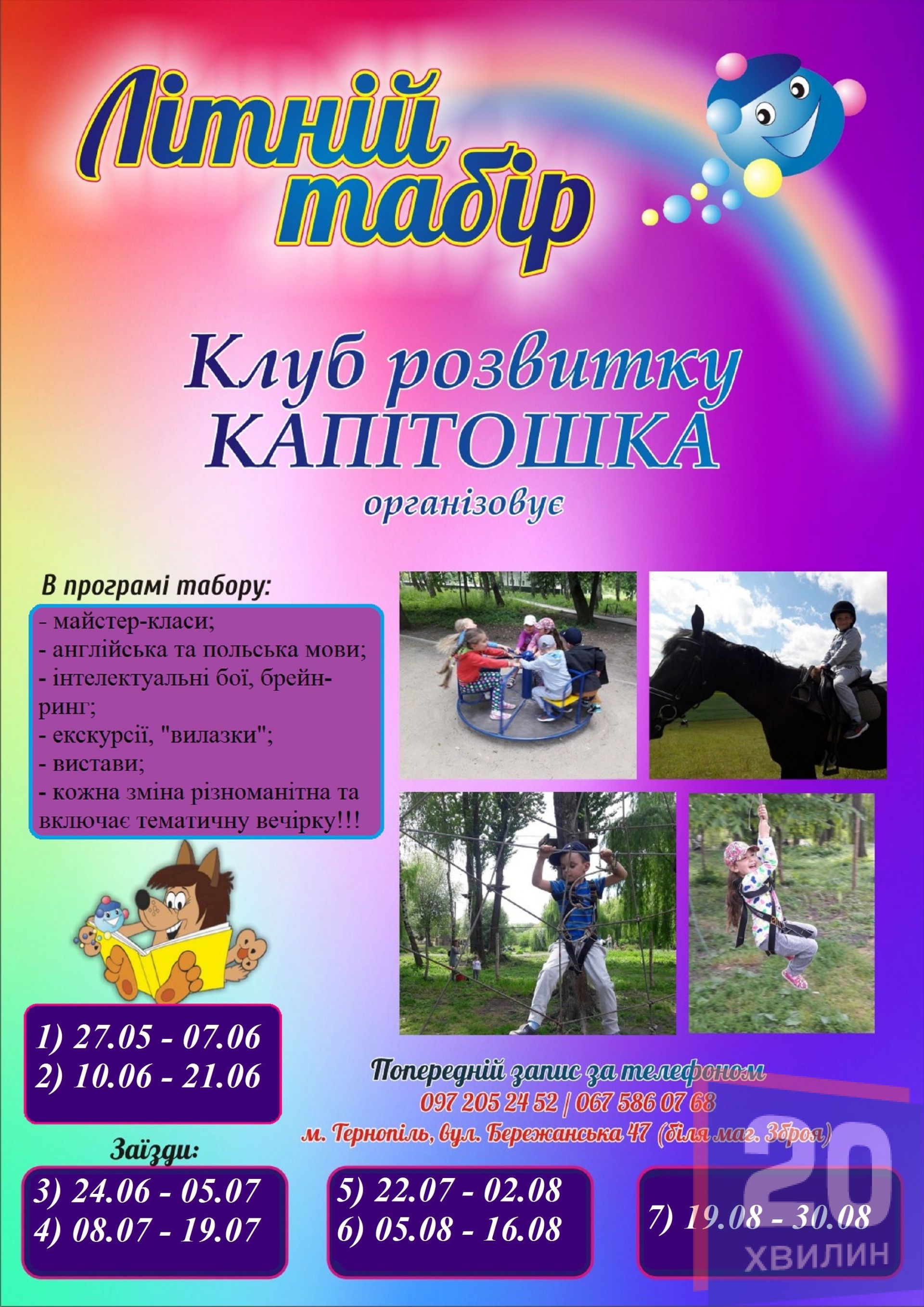 Розваги за межами клубу: катання на катері, кінні прогулянки, центр науки, фітнес батути, флорбоол, мотузковий парк, пікнік, танцювальний клуб, мультфільм, екскурсія Тернополем, майстерня-карамелі, Пікасоо, кулінарні майстер-класи.