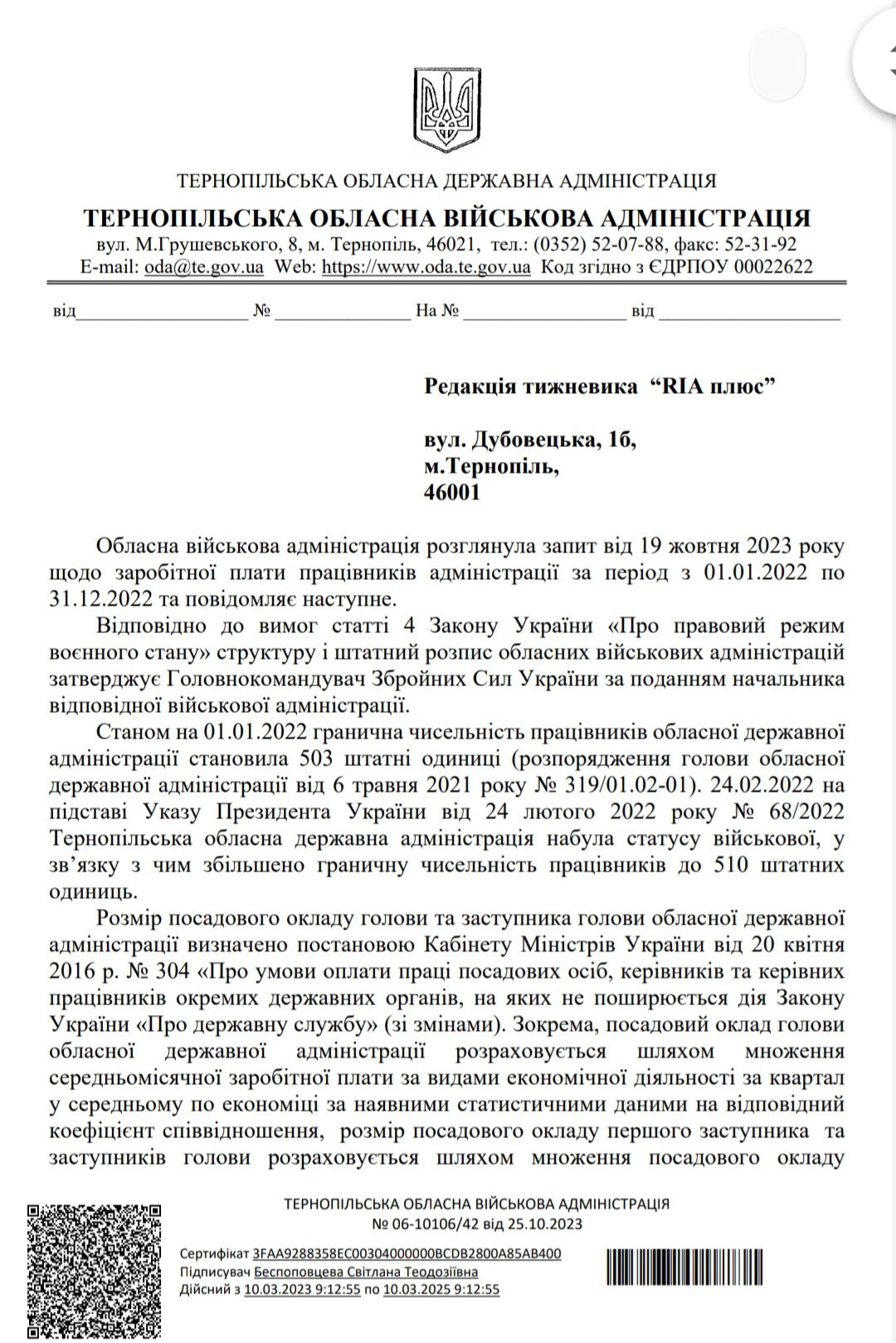 Натомість офіційна відповідь від Тернопільської обласної військової адміністрації вже надходила 12 жовтня. У листі наше прохання про надання інформації, вважаємо, проігнорували! Ми отримали формальну відписку про те, якими документами, відповідно до законодавства, встановлені розміри посадових окладів працівників адміністрації, а також звідки фінансуються видатки на оплату їх праці.
