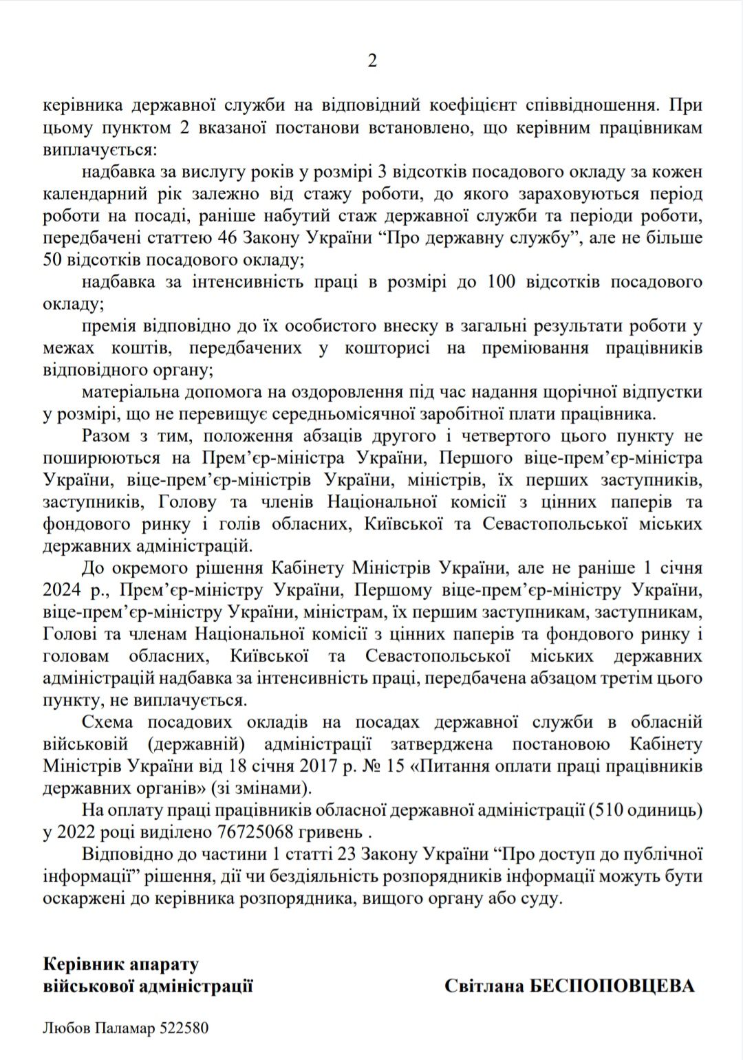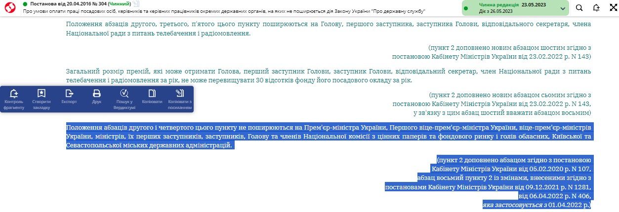 Від адміністрації пишуть, що відповідно до пункту 2 постанови «Про умови оплати праці посадових осіб, керівників та керівних працівників окремих державних органів, на яких не поширюється дія Закону України «Про державну службу», керівним працівникам виплачують:
