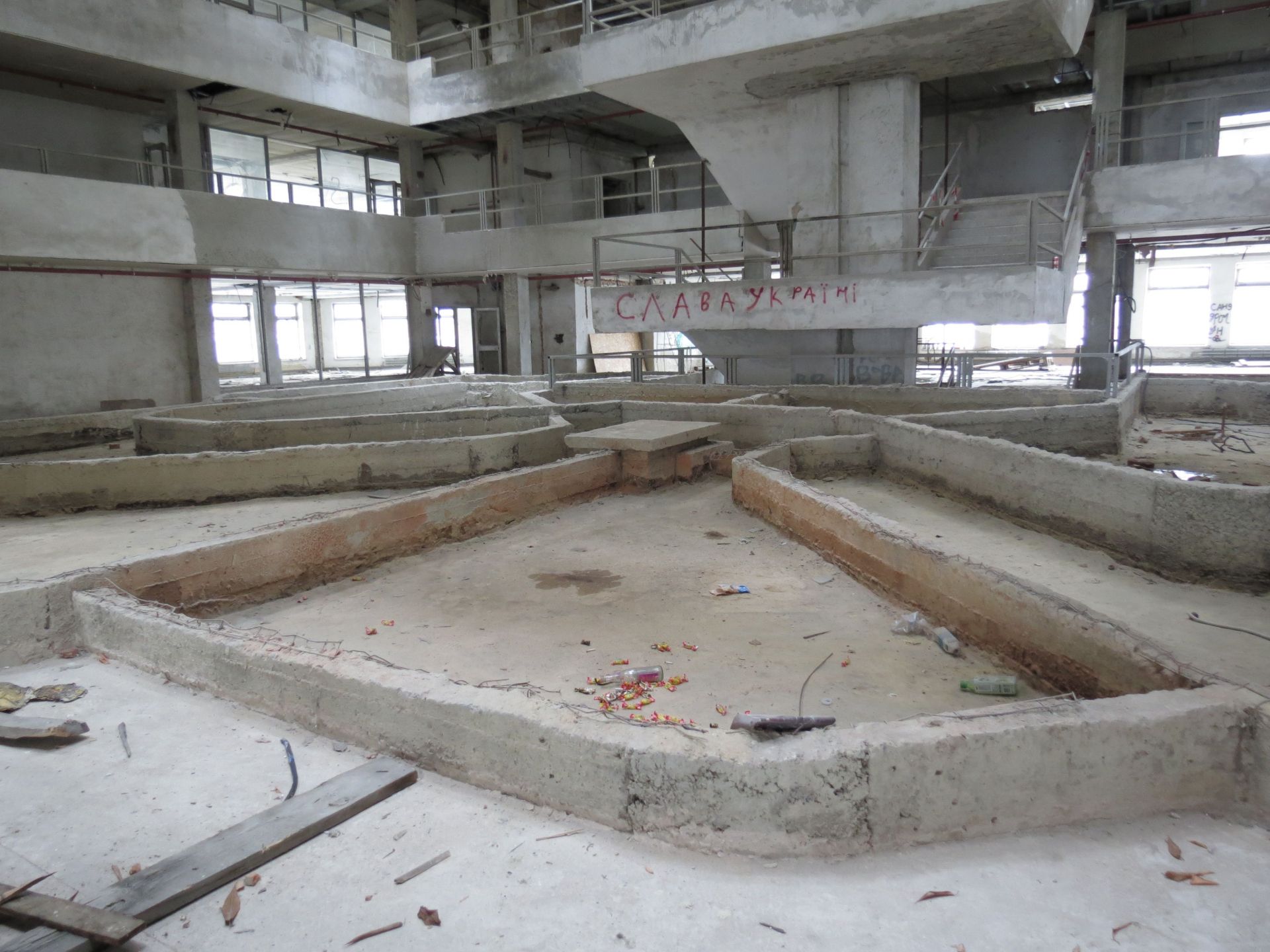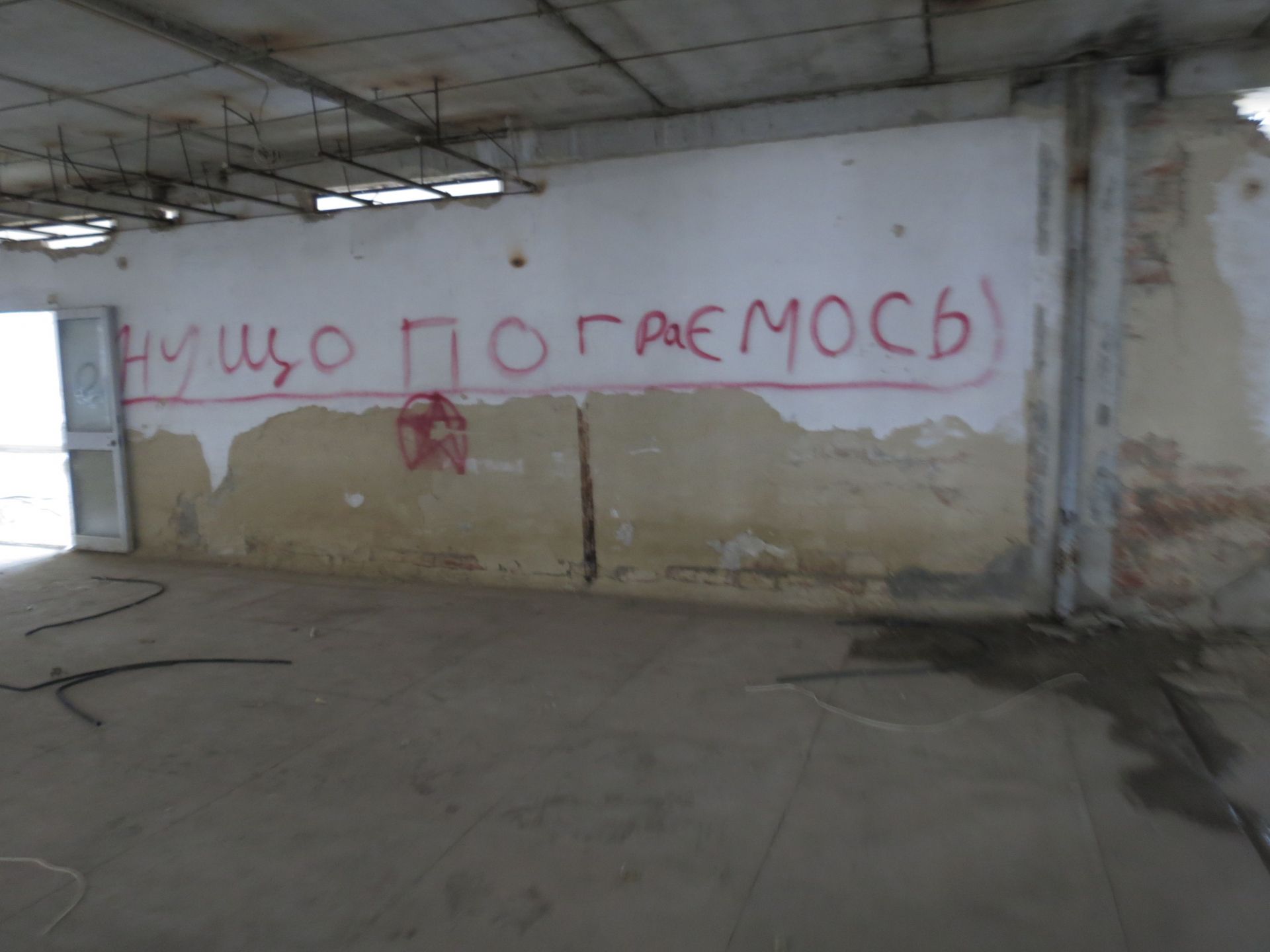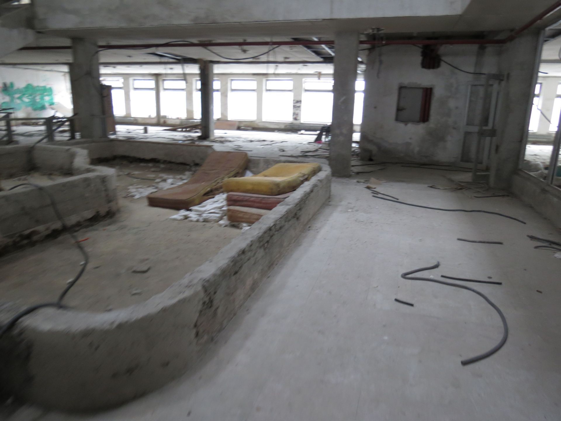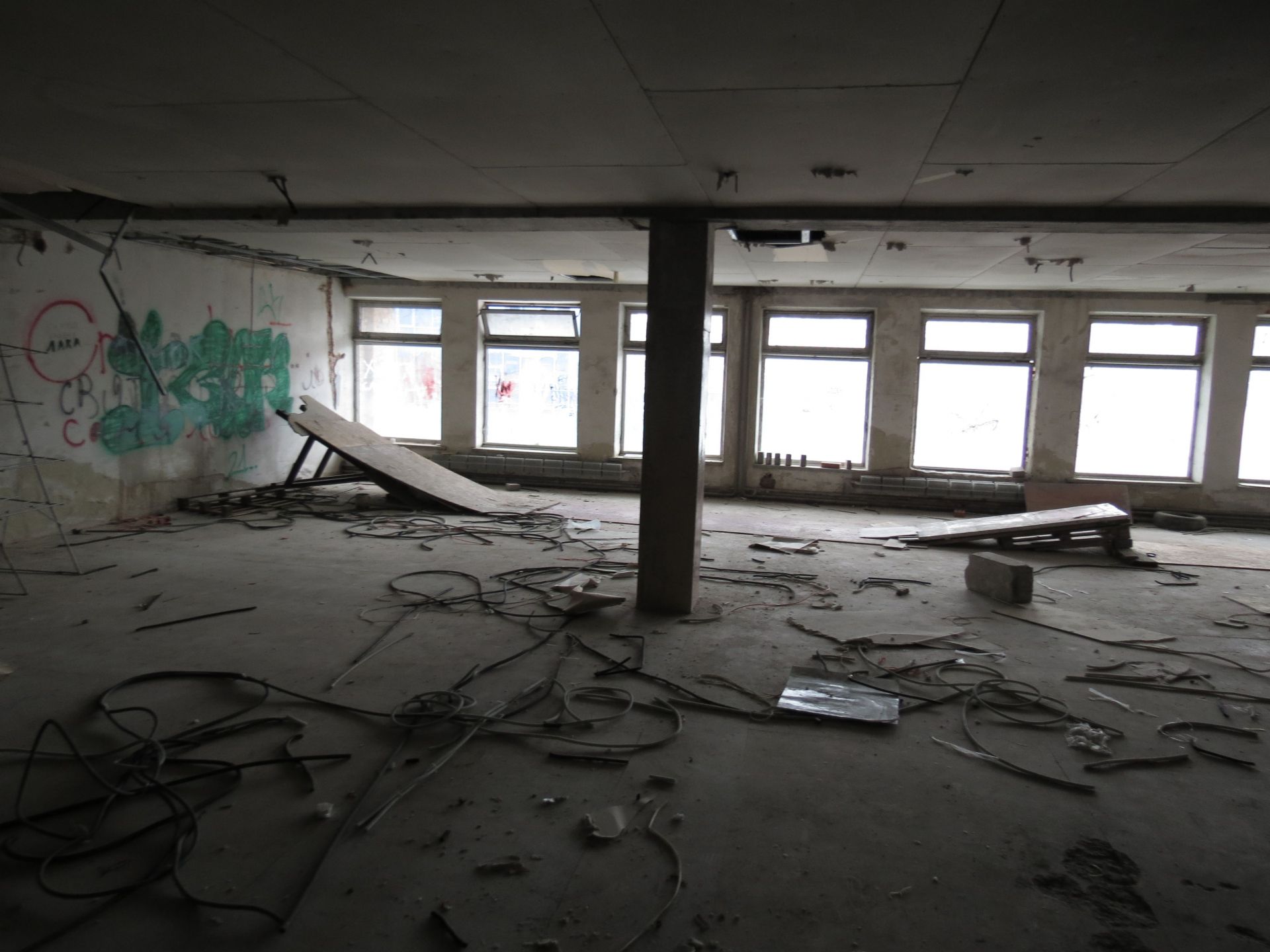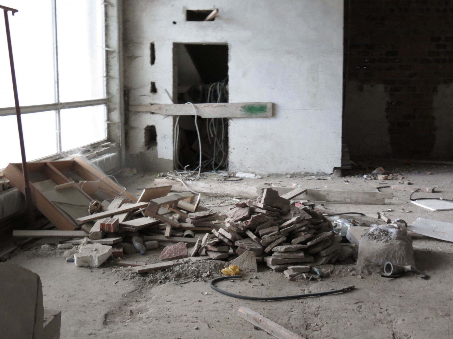 Всередині дуже просторо і дуже брудно, багато будівельного і не тільки сміття, розбиті вікна та пусті пляшки з-під алкоголю. А ще – дроти, що звисають зі стелі.