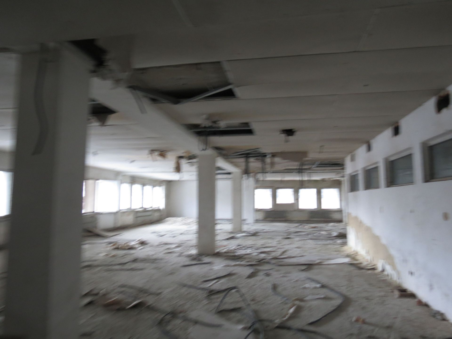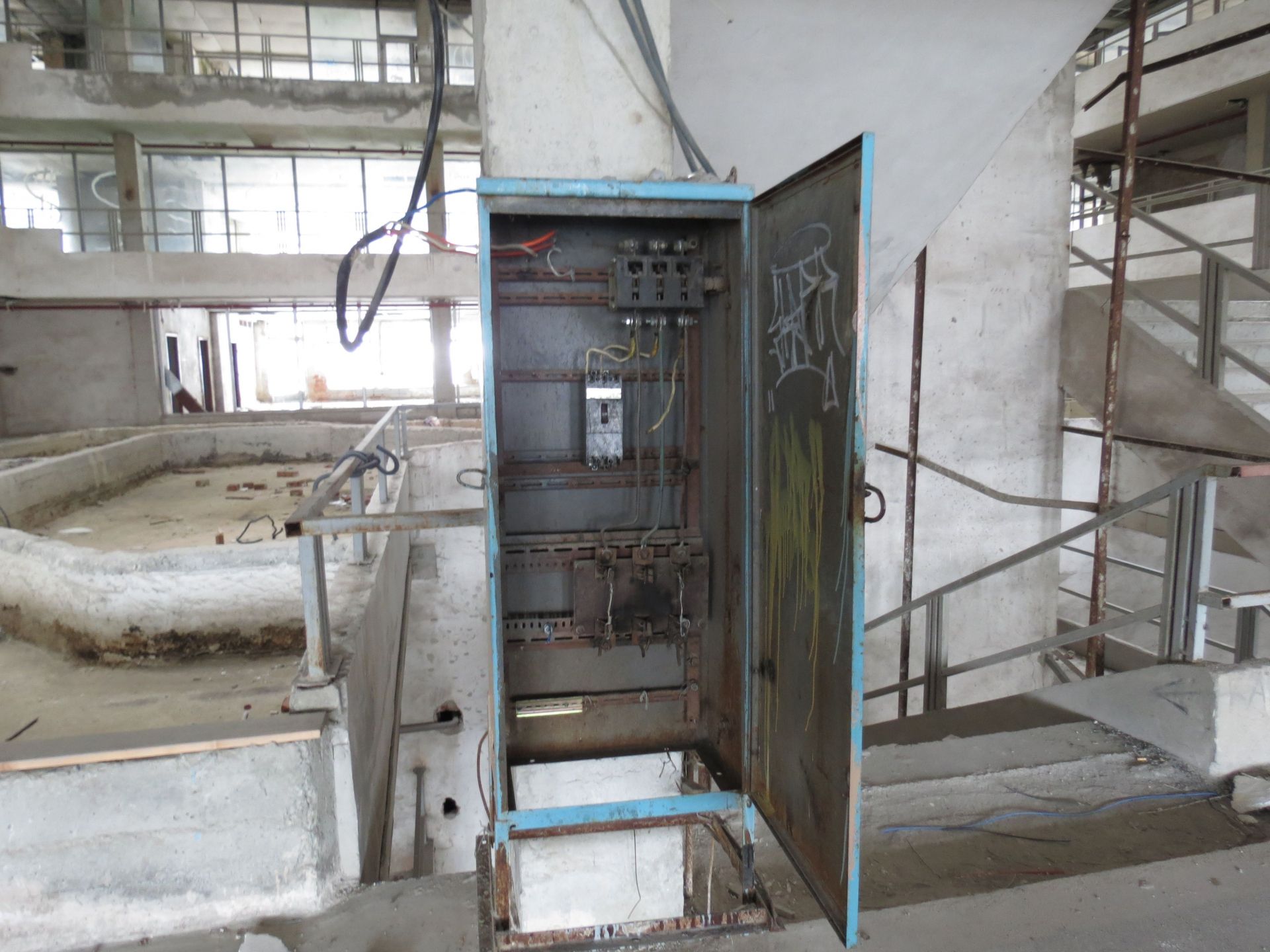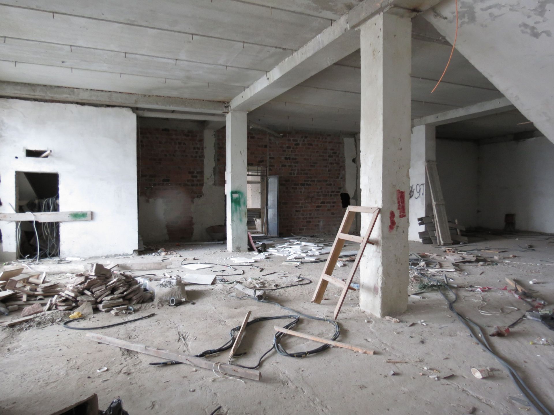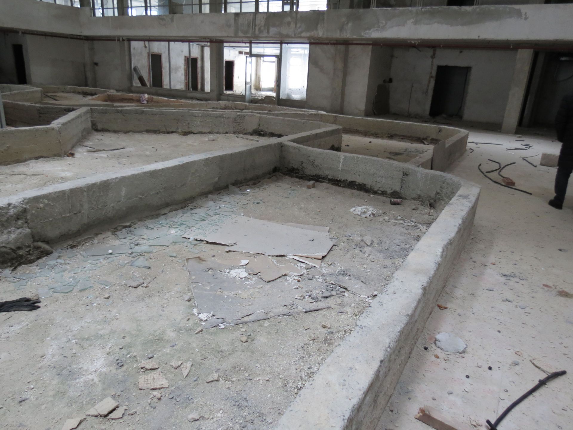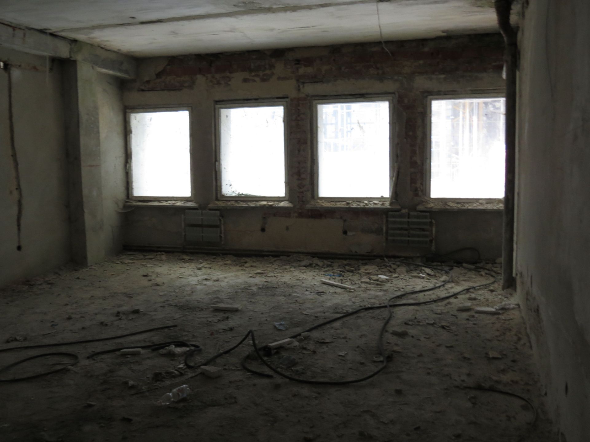 Всередині дуже просторо і дуже брудно, багато будівельного і не тільки сміття, розбиті вікна та пусті пляшки з-під алкоголю. А ще – дроти, що звисають зі стелі.