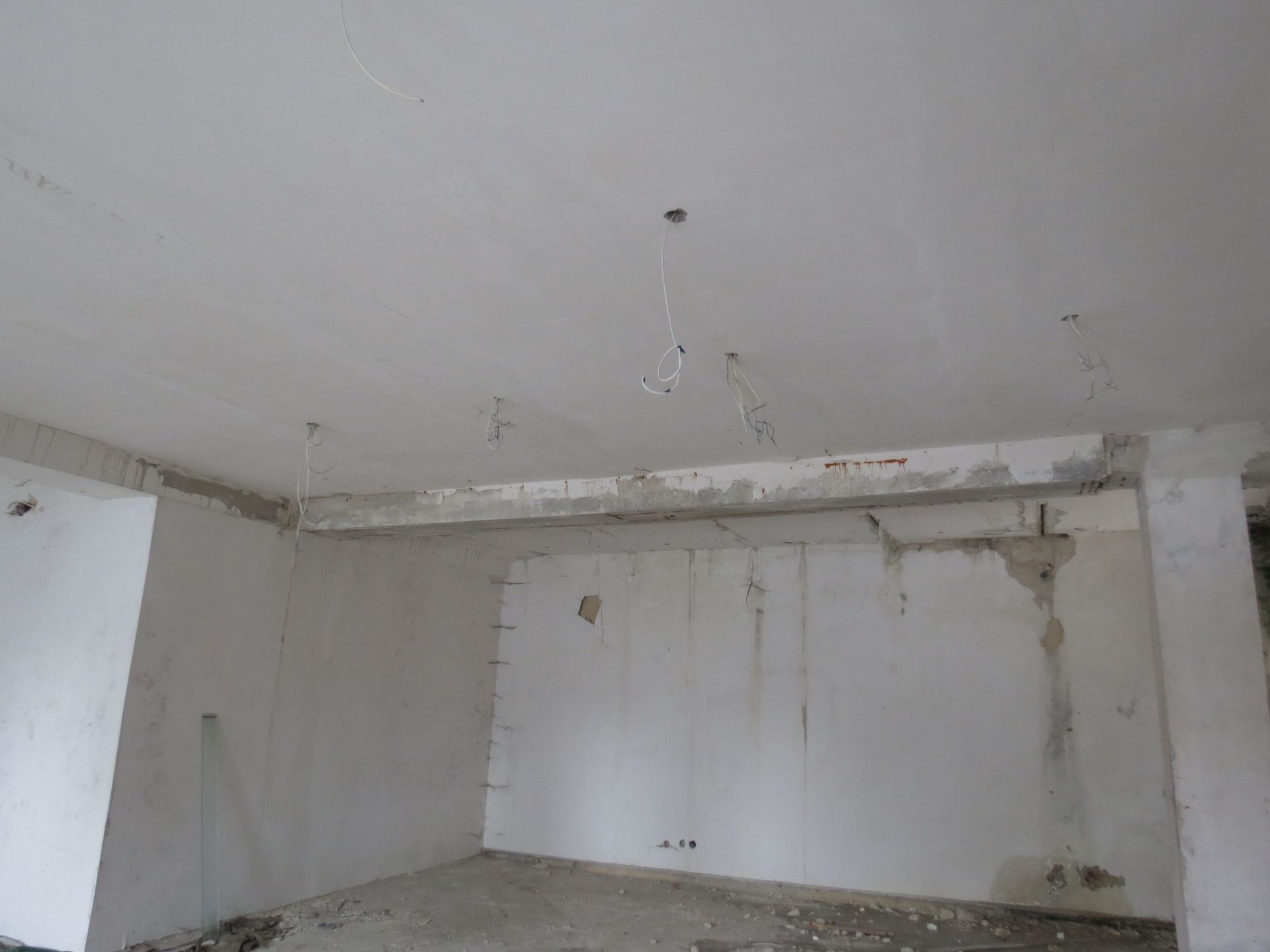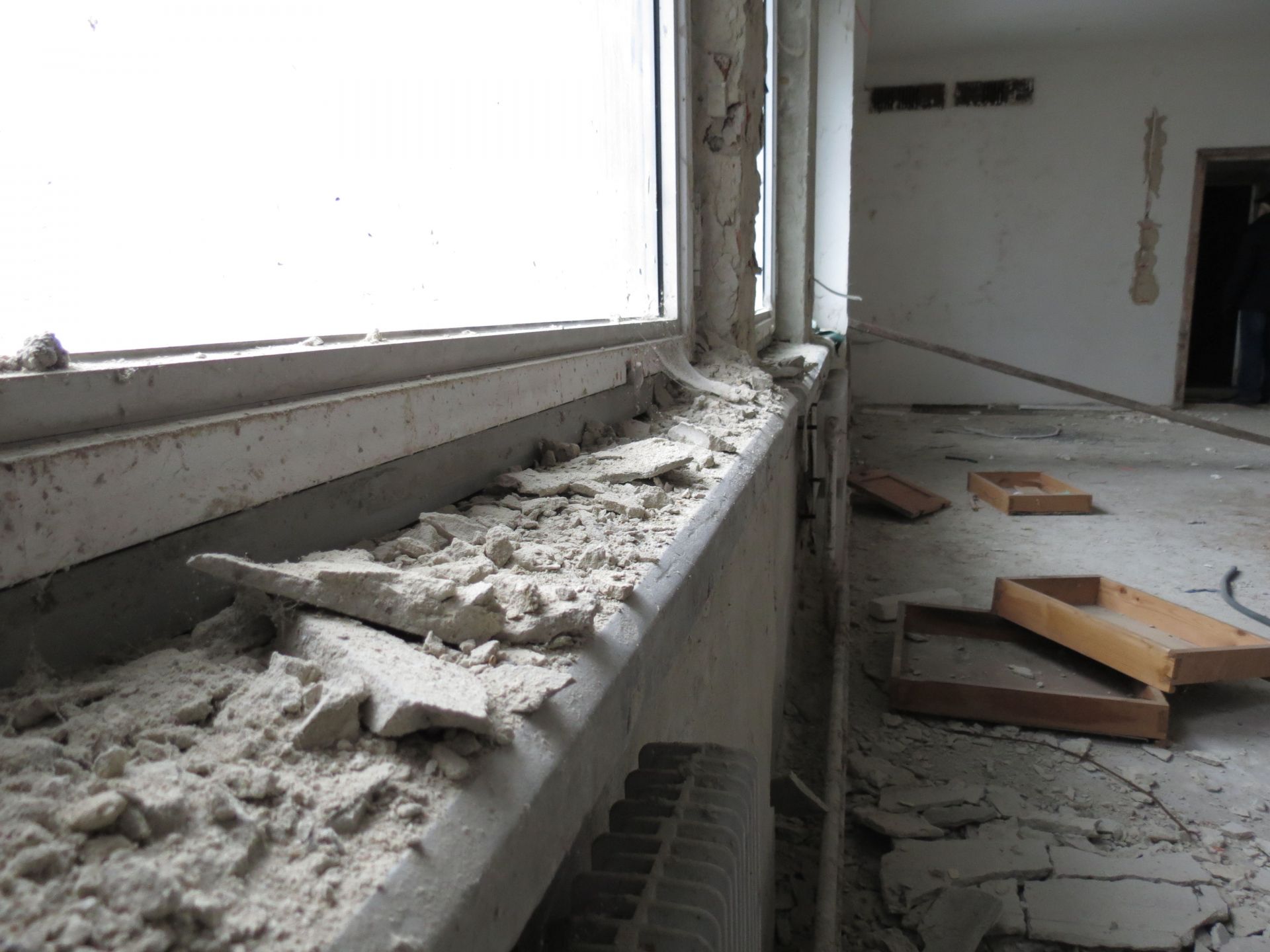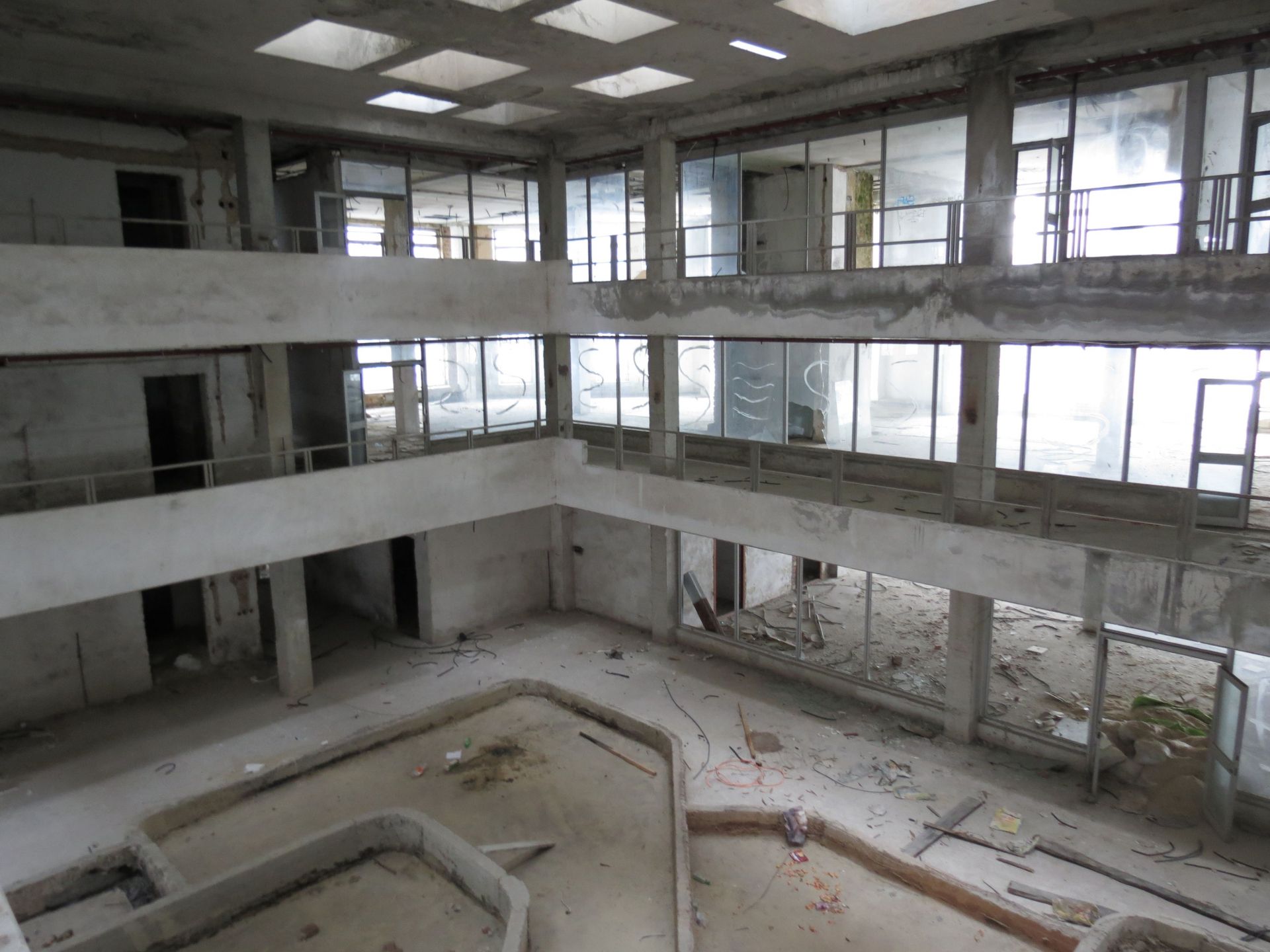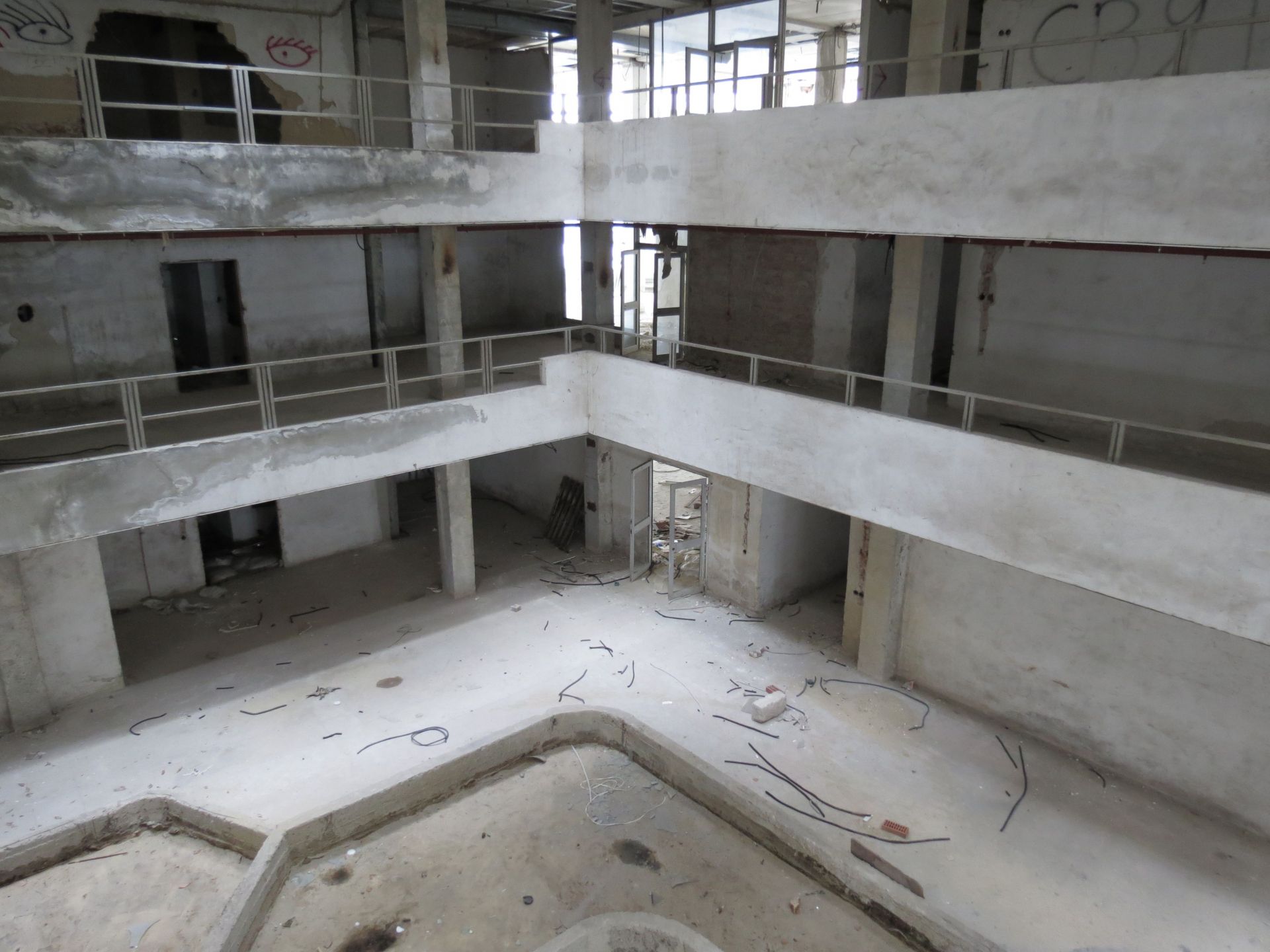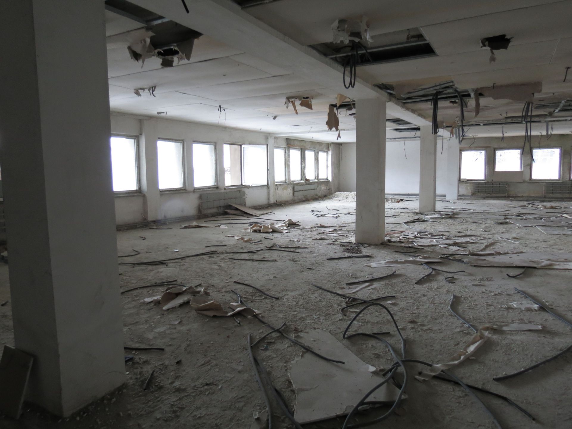 Всередині дуже просторо і дуже брудно, багато будівельного і не тільки сміття, розбиті вікна та пусті пляшки з-під алкоголю. А ще – дроти, що звисають зі стелі.