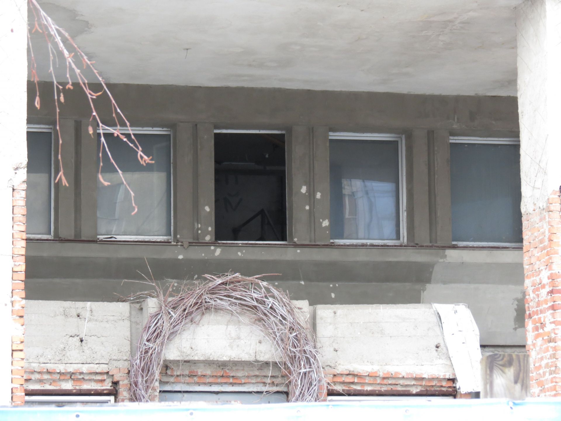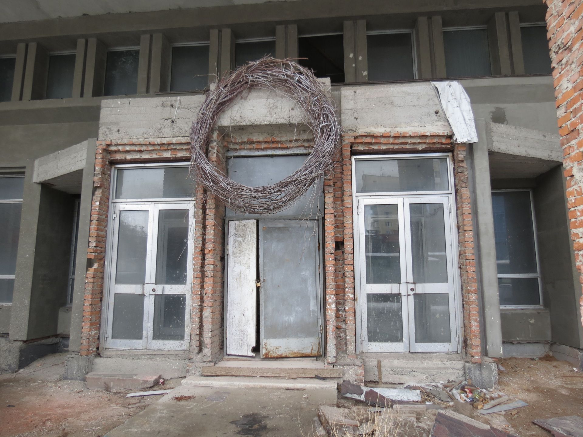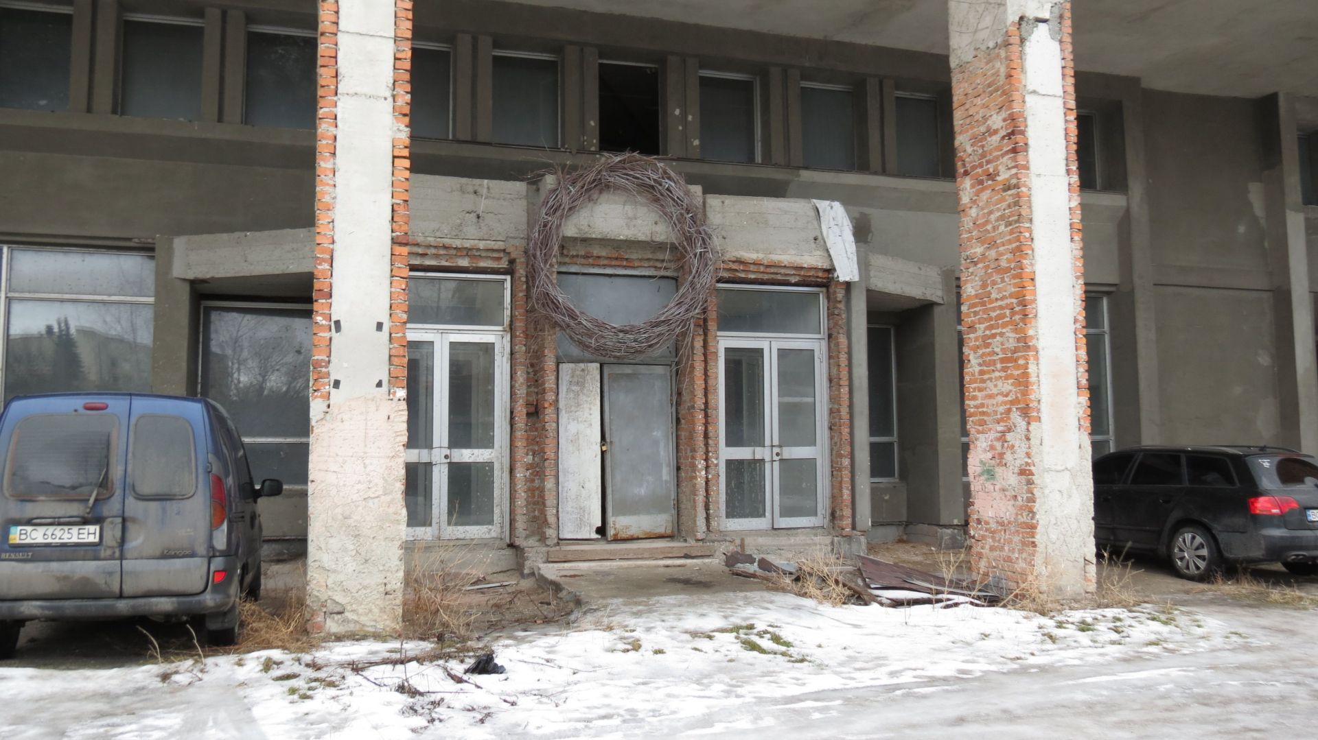 Найперше, що помічаєш, окрім обдертого фасаду, – величезний плетений вінок над вхідними дверима. Сергій Ковдриш каже, що не знає, для чого його тут розмістили, але припускає, що він слугує оберегом.