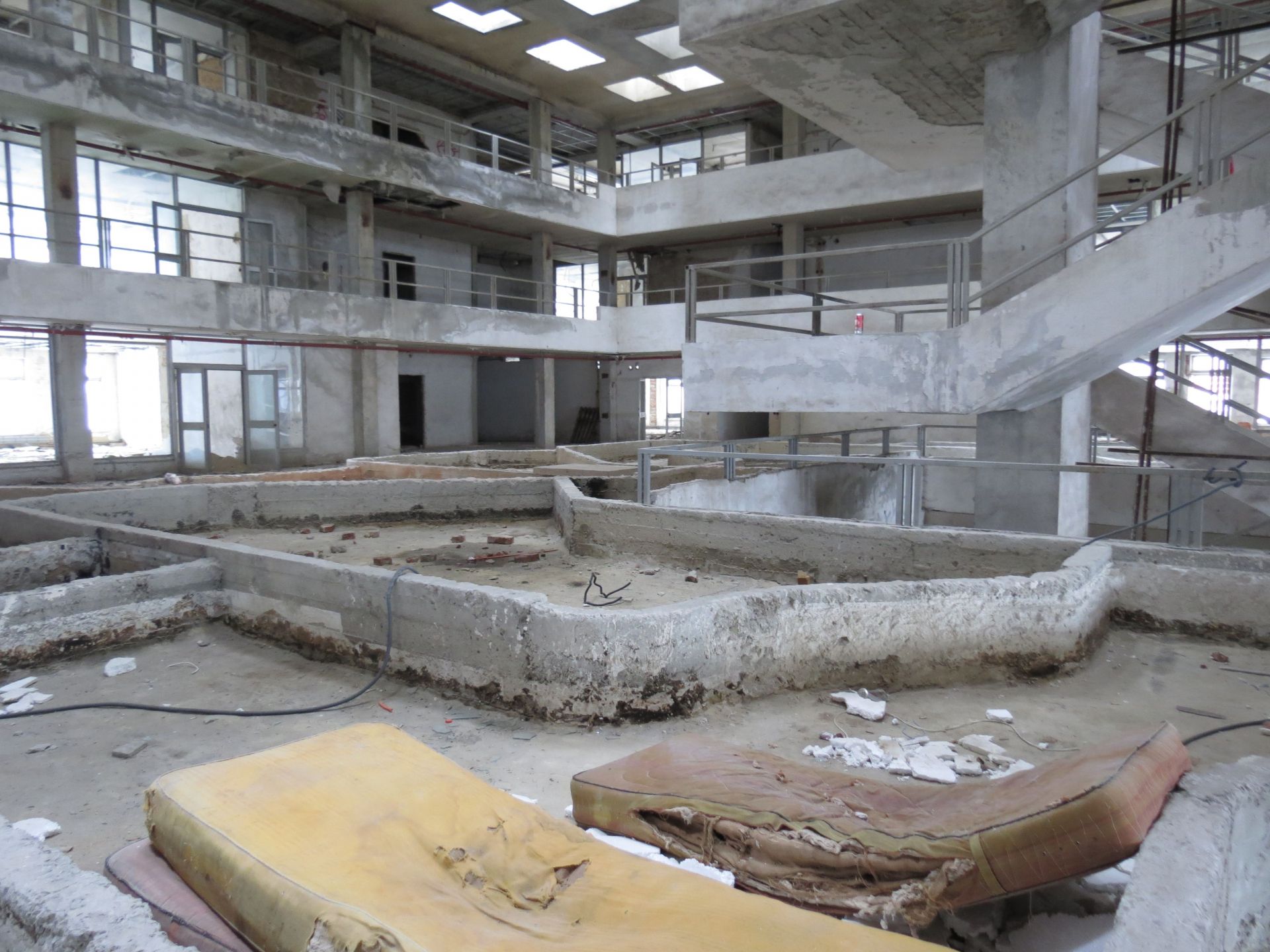Вище розташований хол, у якому навіть мав би бути зимовий сад. Та працівники встигли зробити тільки бетонні стінки. Тут же ми побачили старі матраци і поцікавилися у Сергій Ковдриша, чи не могли в цій будівлі раніше проживати безпритульні.