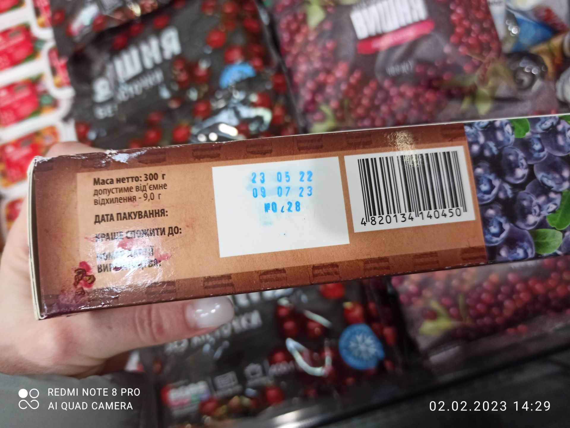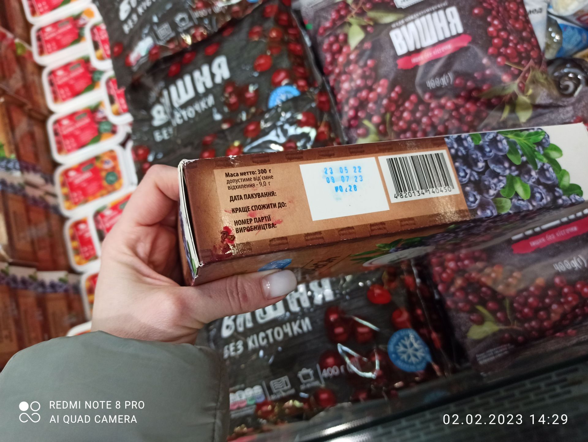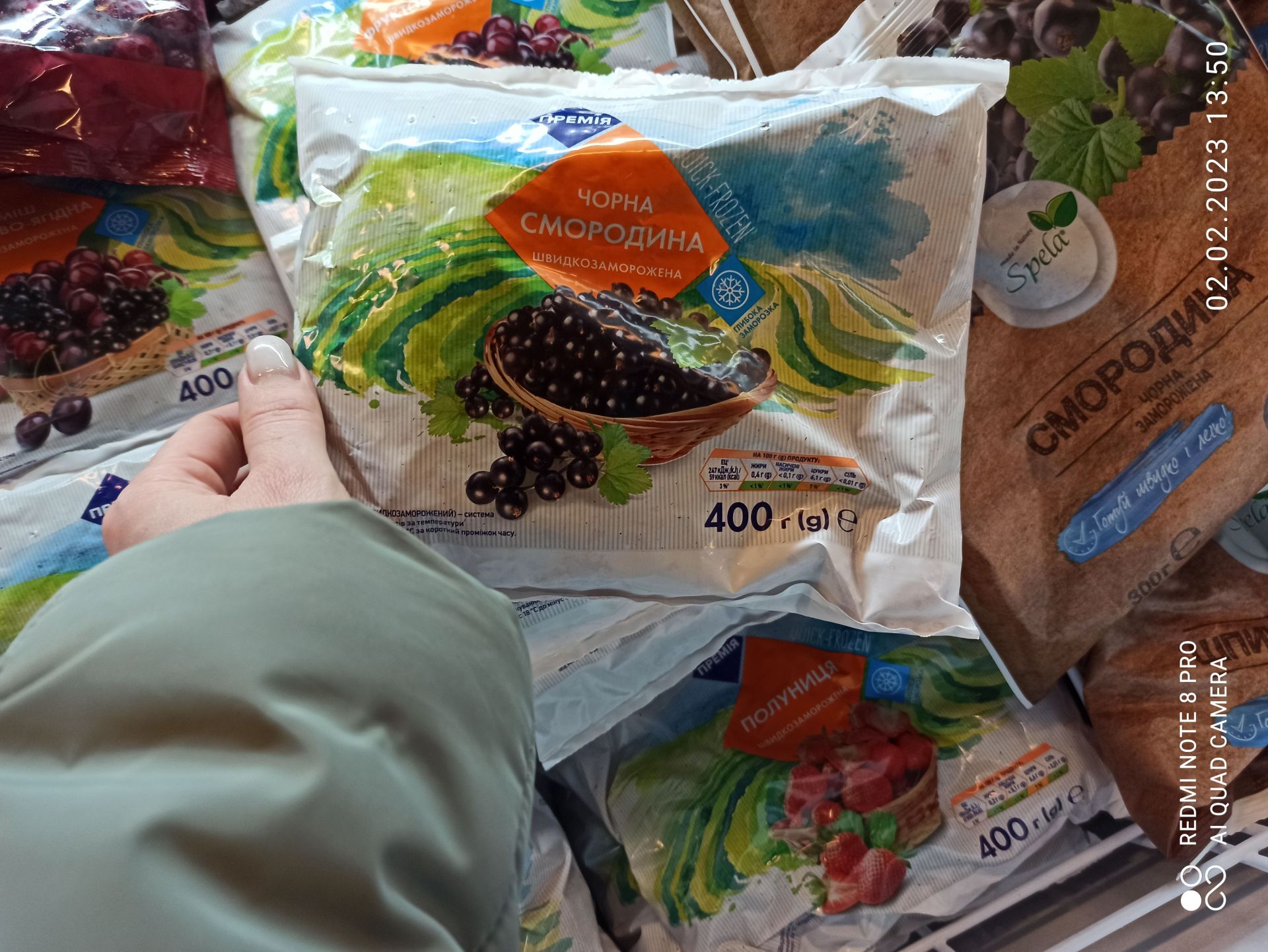 А от із замороженими ягодами проблема. Наприклад, «Вишня без кісточки швидкозаморожена» була напів розмерзла. Ми взяли пачку до рук, і вони залишились мокрими. Теж саме з чорною смородиною, полуницею і журавлиною. При цьому термін придатності ягід цілком нормальний.