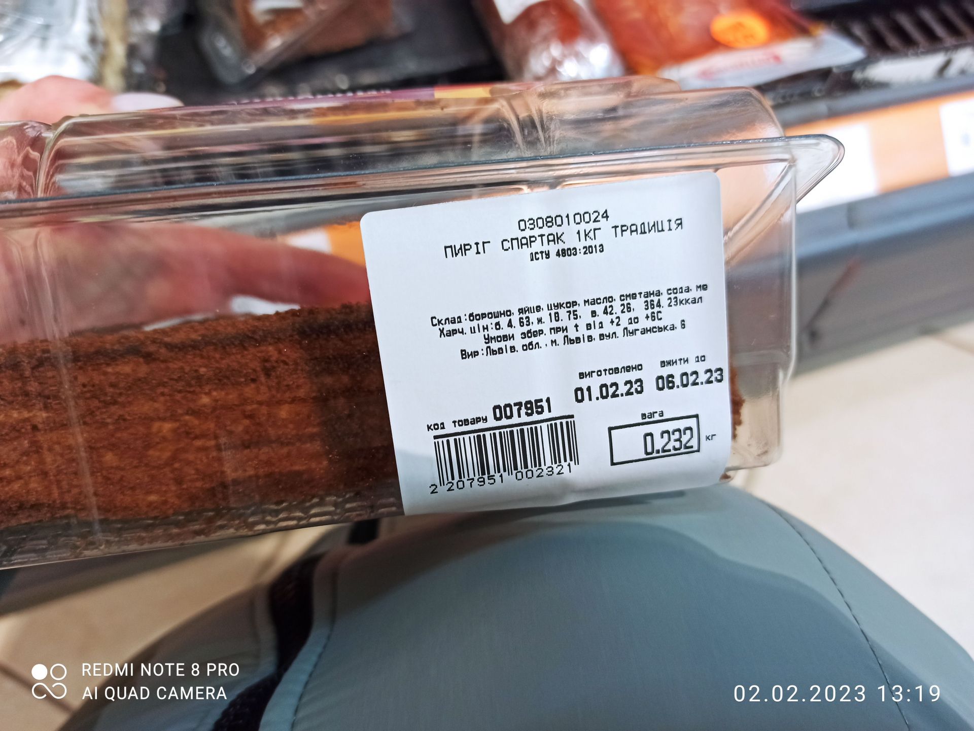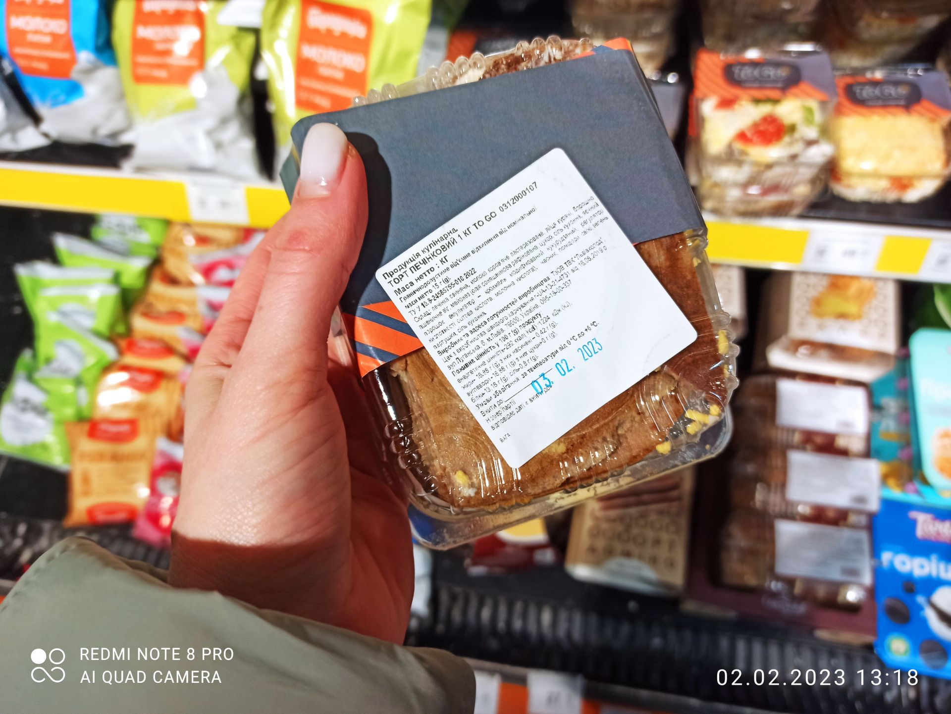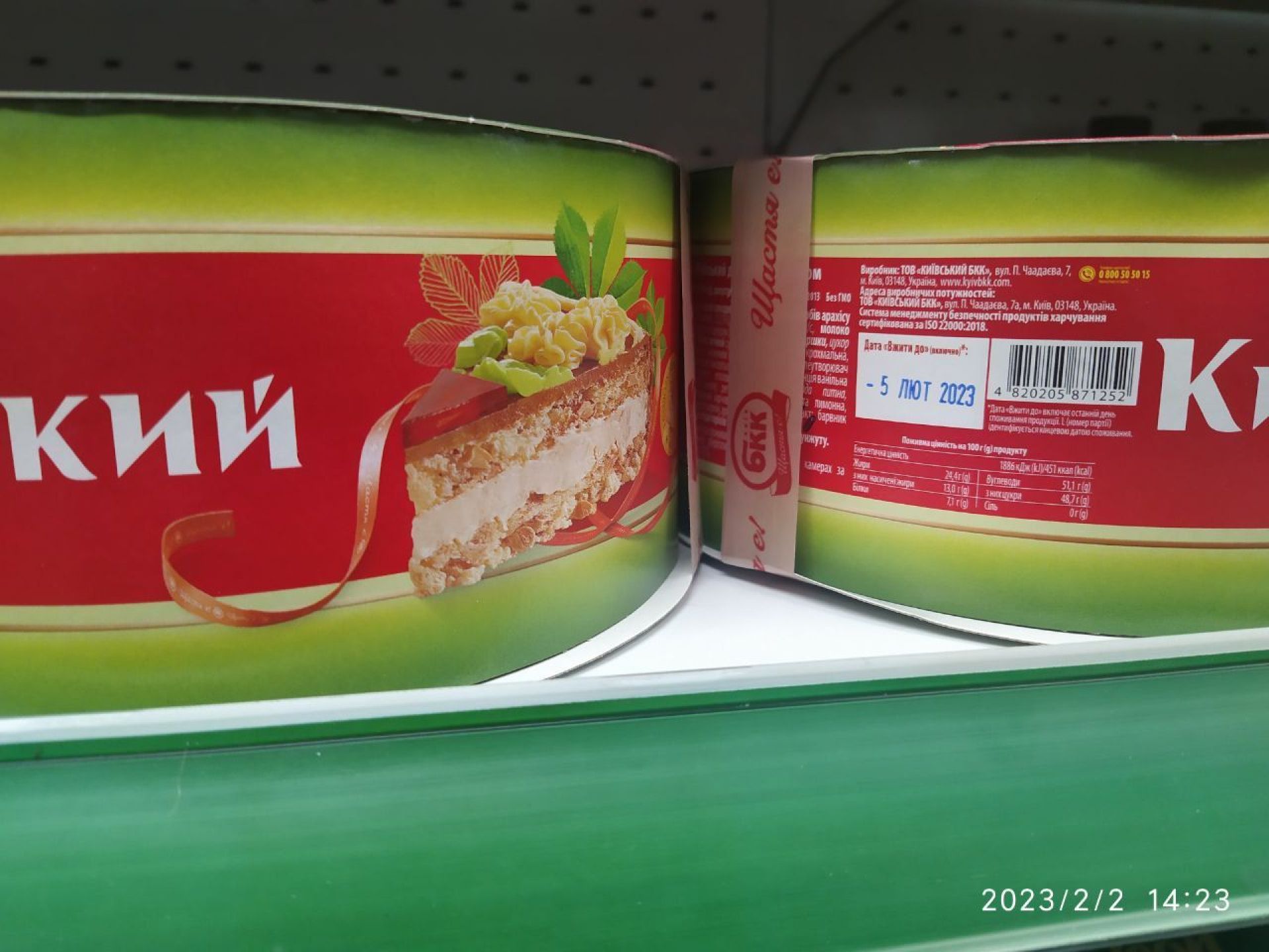 Насамкінець снеки і солодощі. На печінковому торті, салаті «Олів’є» й інших салатах стояла позначка «Вжити до 03.02.2023». Термін придатності ролу із сиром виходив 2 лютого (тобто на момент нашої перевірки до вечора товар був хорошим). Пиріг «Спартак» та сирник у пластмасових лоточках теж можна вживати.