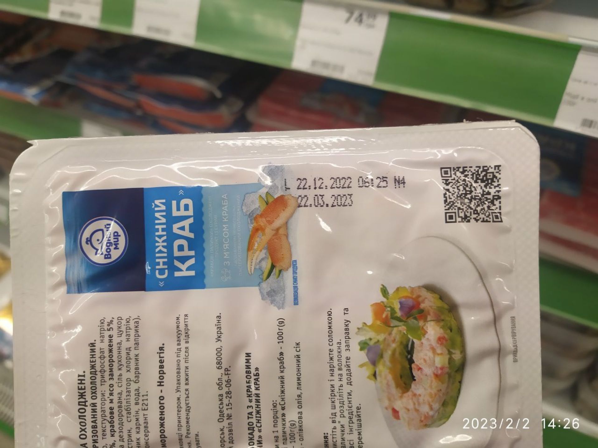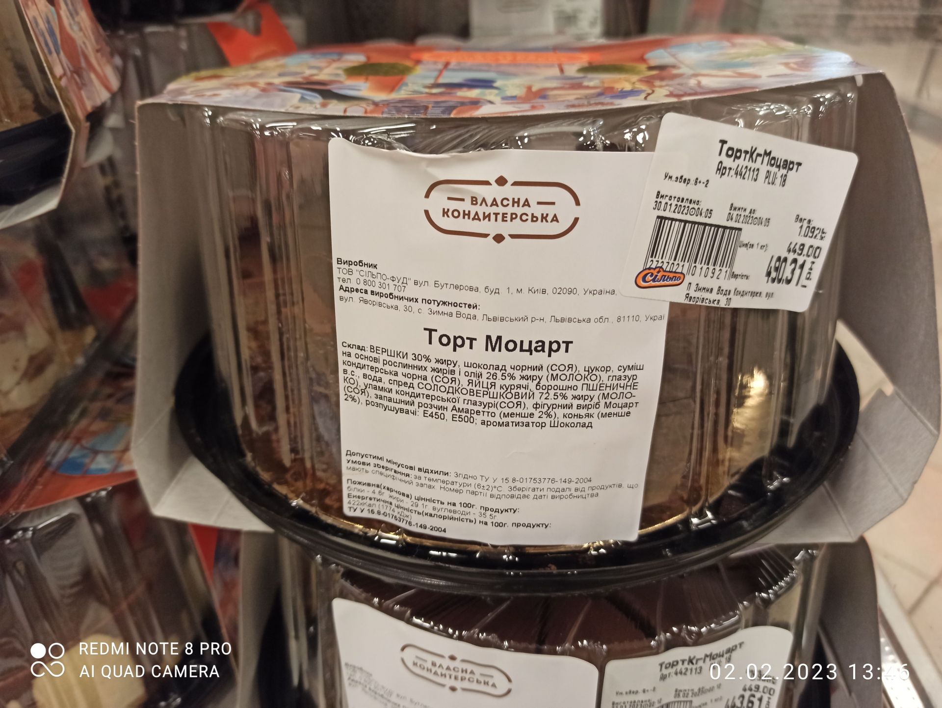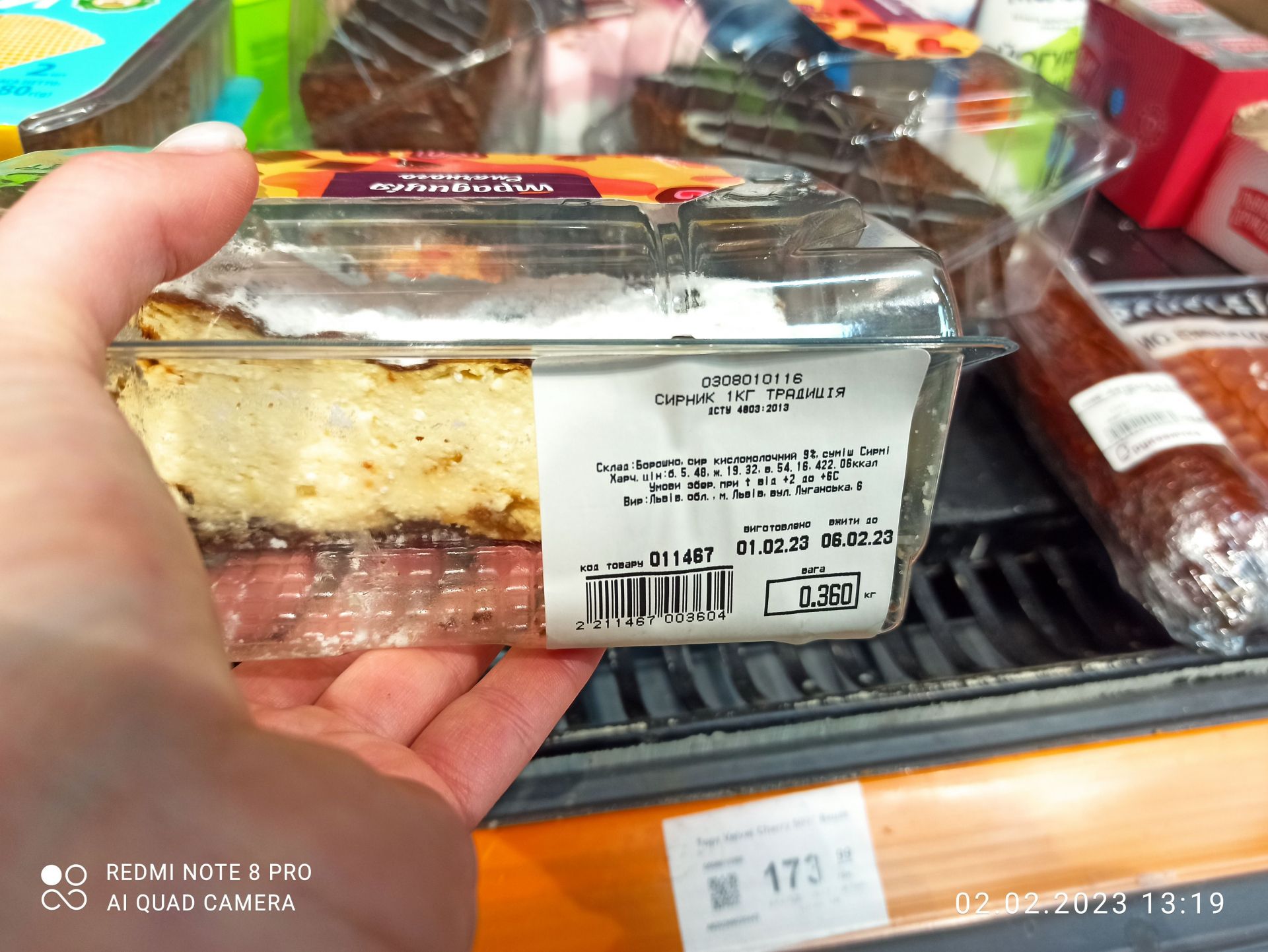 Насамкінець снеки і солодощі. На печінковому торті, салаті «Олів’є» й інших салатах стояла позначка «Вжити до 03.02.2023». Термін придатності ролу із сиром виходив 2 лютого (тобто на момент нашої перевірки до вечора товар був хорошим). Пиріг «Спартак» та сирник у пластмасових лоточках теж можна вживати.