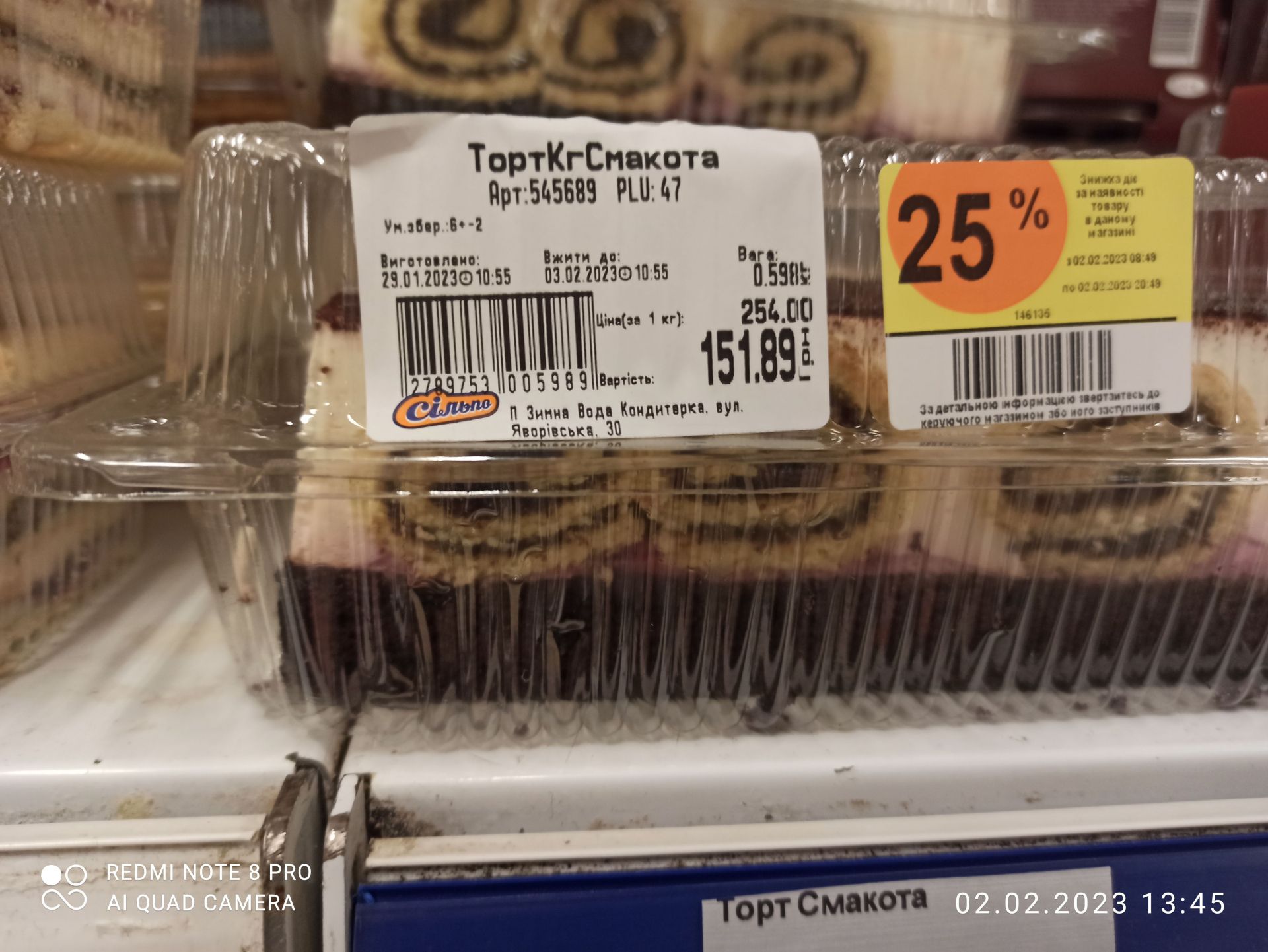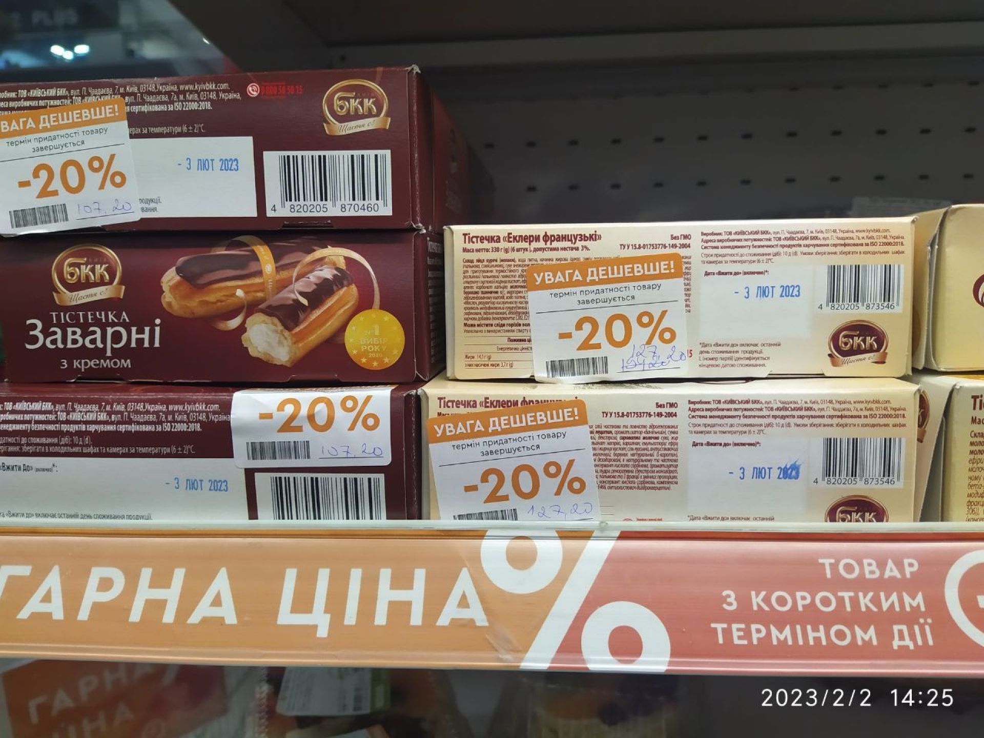 Торти, рулети й іншу випічку, яка швидко псується, зберігають окремо. Є чимало товарів зі знижками. Солодощі свіжі. На акційній продукції, де є наклейки «-25%», термін придатності закінчувався 3 лютого (тобто наступного дня після нашого перевірки). Та всі товари виглядають свіжими, на стінках немає «талого» шоколаду або крему, протермінованої продукції ми не знайшли.
