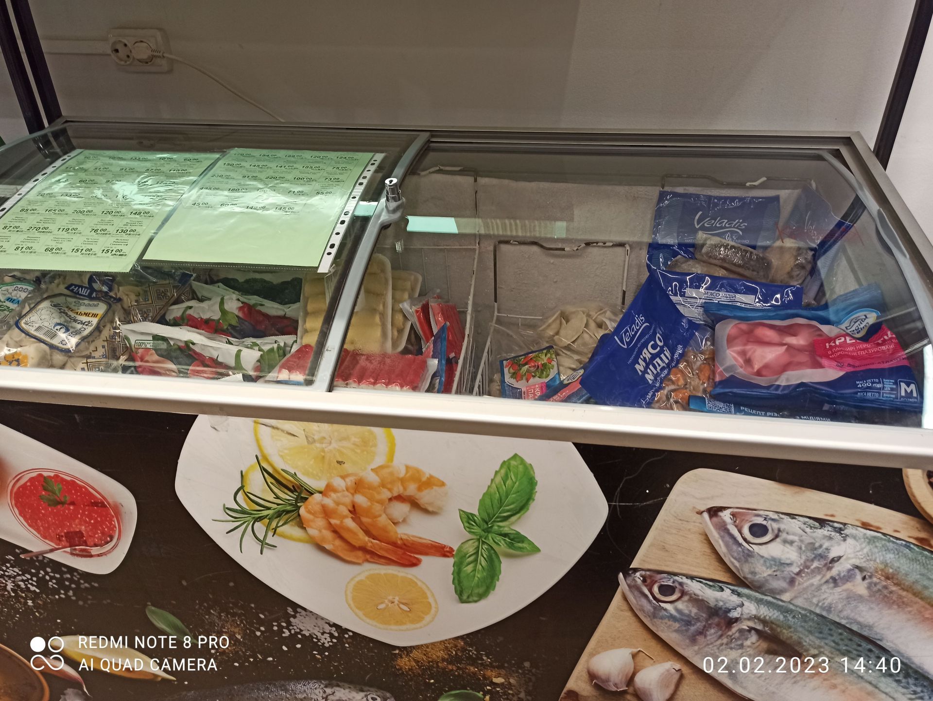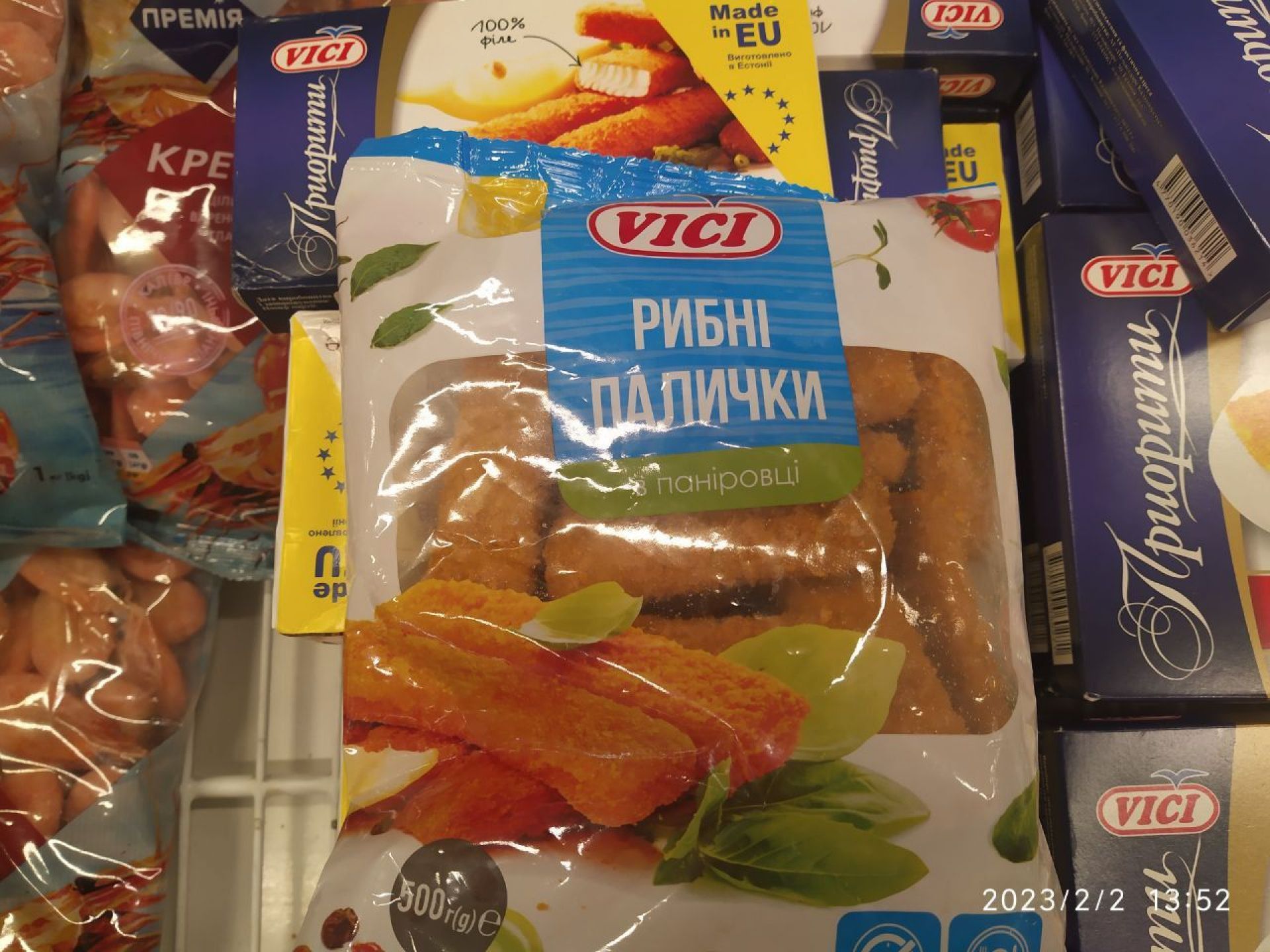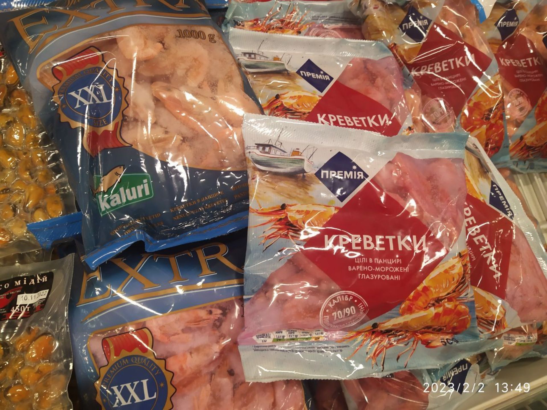 Рибні продукти (рибні палички, креветки, крабові палички, мідії, філе, цілі шматочки риби) теж не протерміновані, замерзлі й виглядають акуратно.