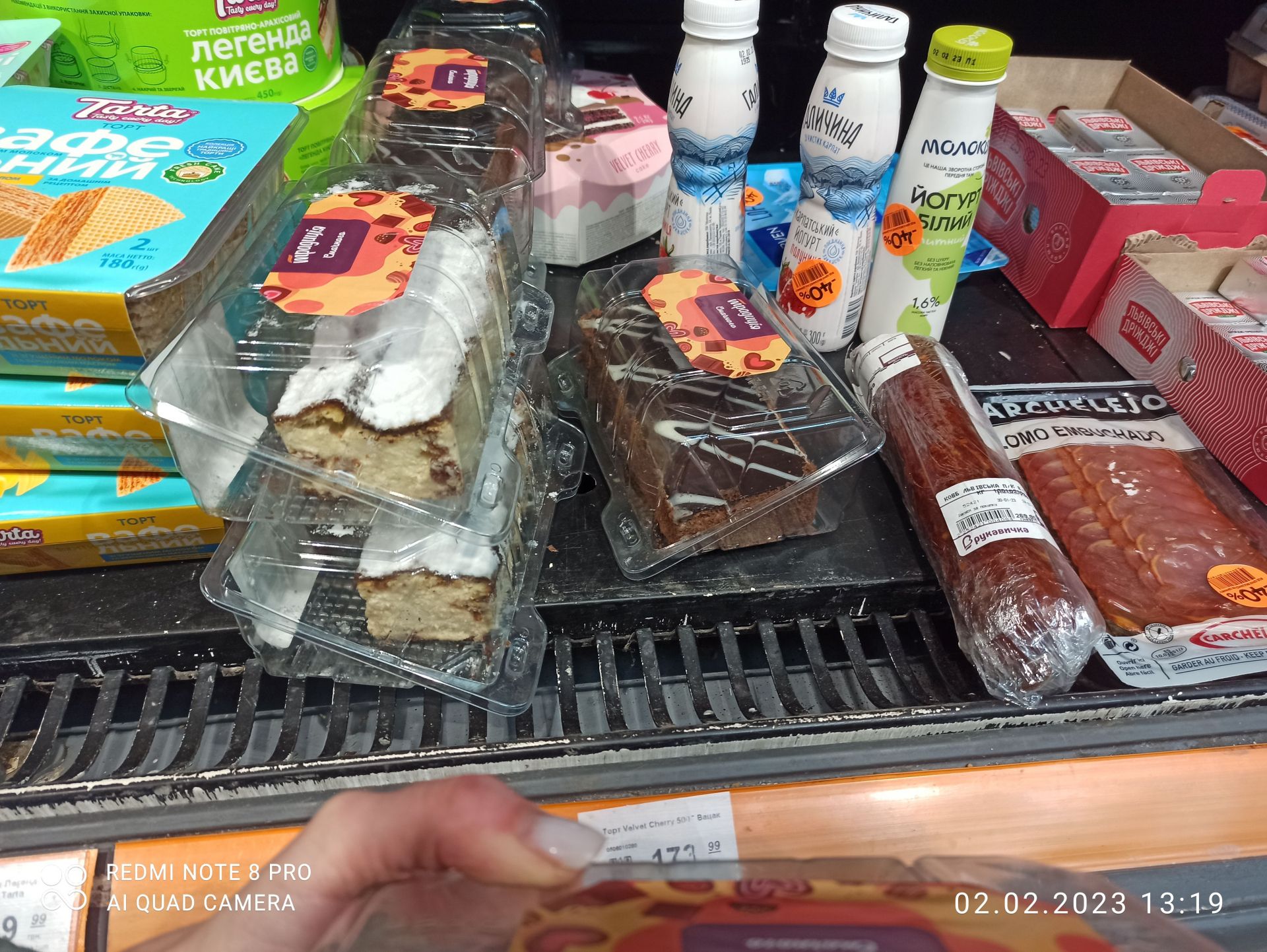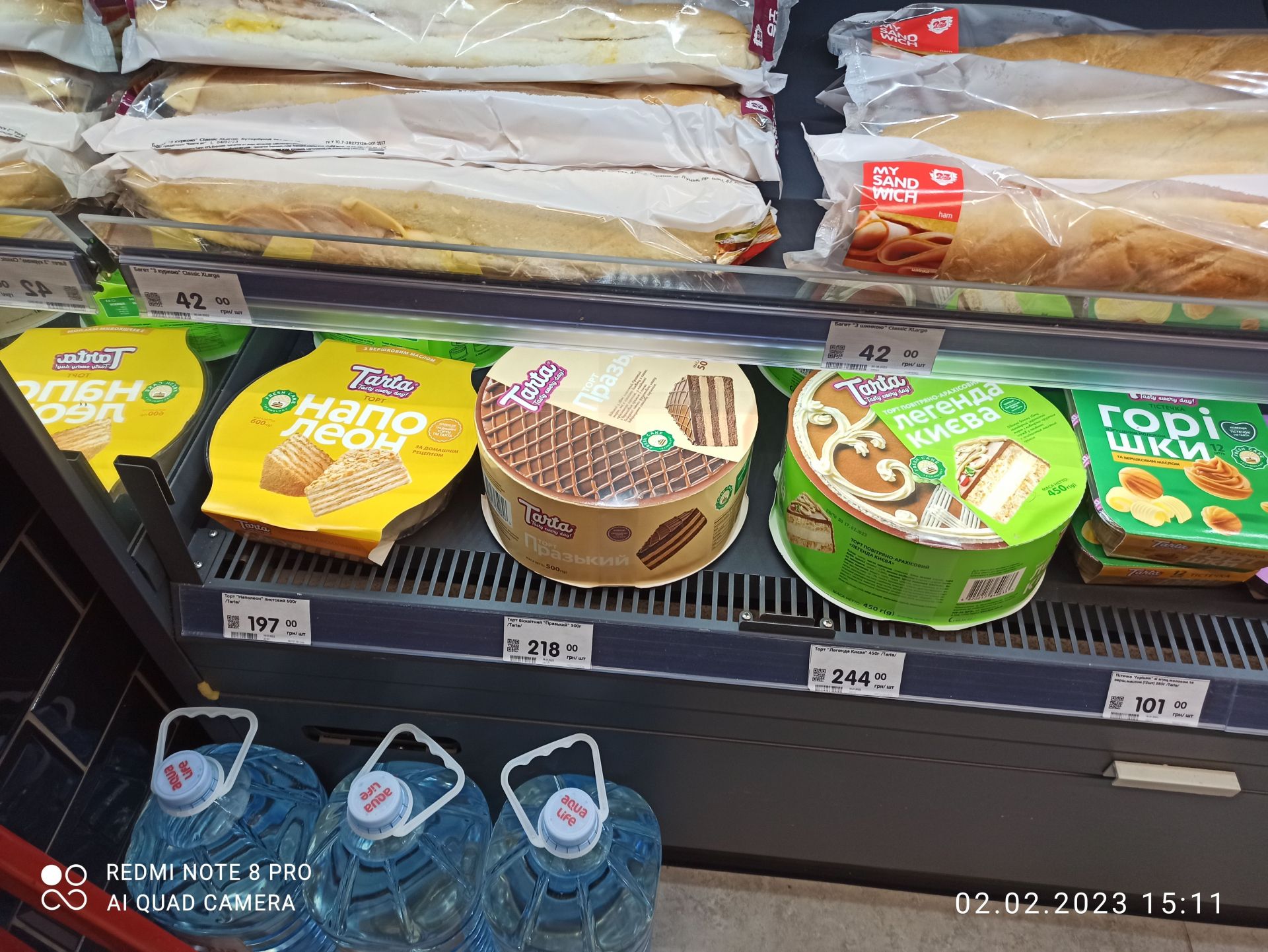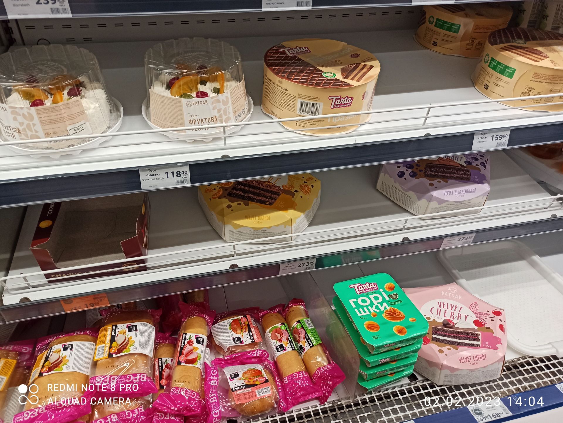 На час нашого візиту в цьому маркеті була електроенергія, отож усі холодильники працювали. Асортимент тортів та тістечок на полицях не надто великий, але вони свіжі й з актуальним терміном придатності, виглядають апетитно.