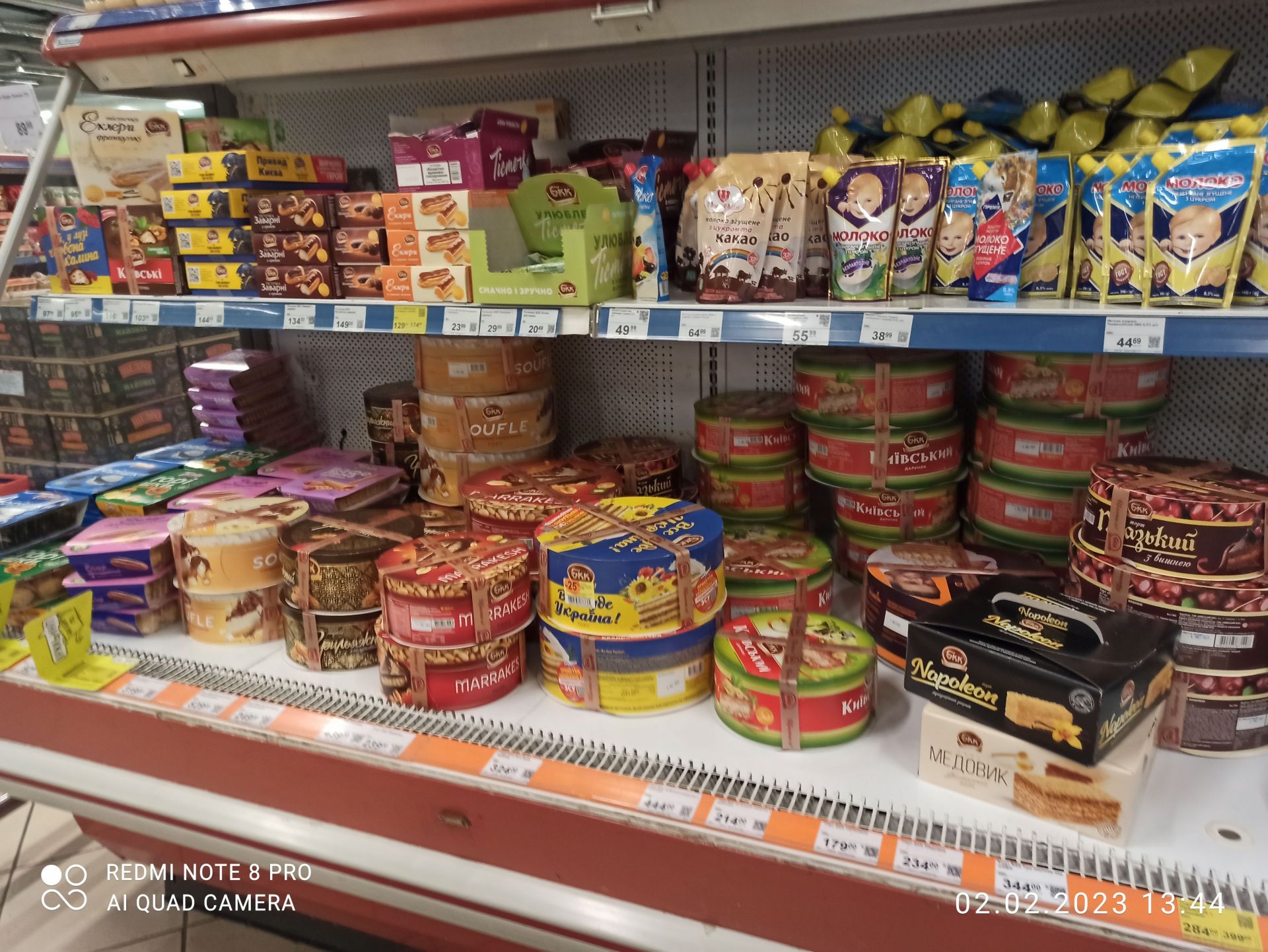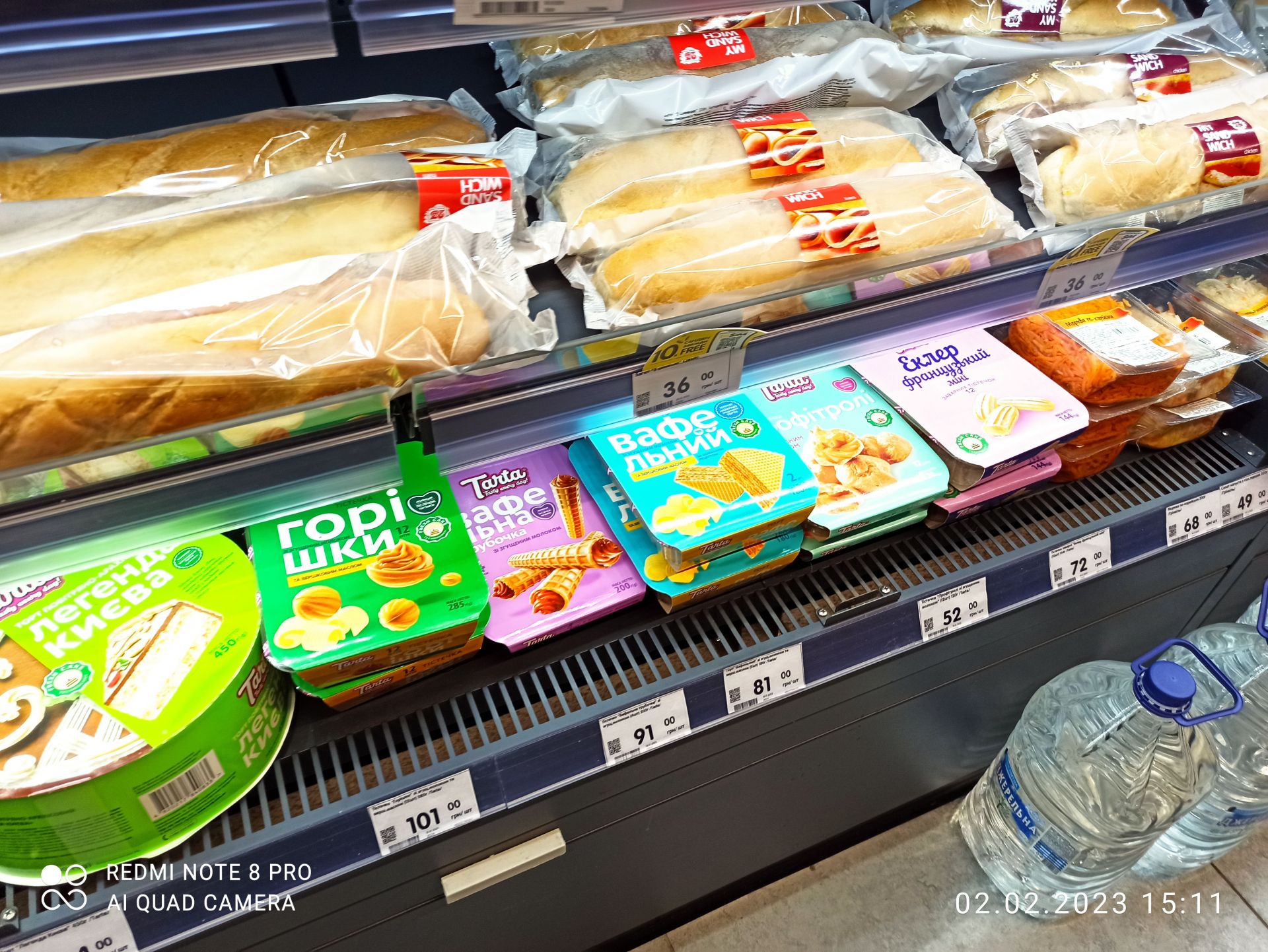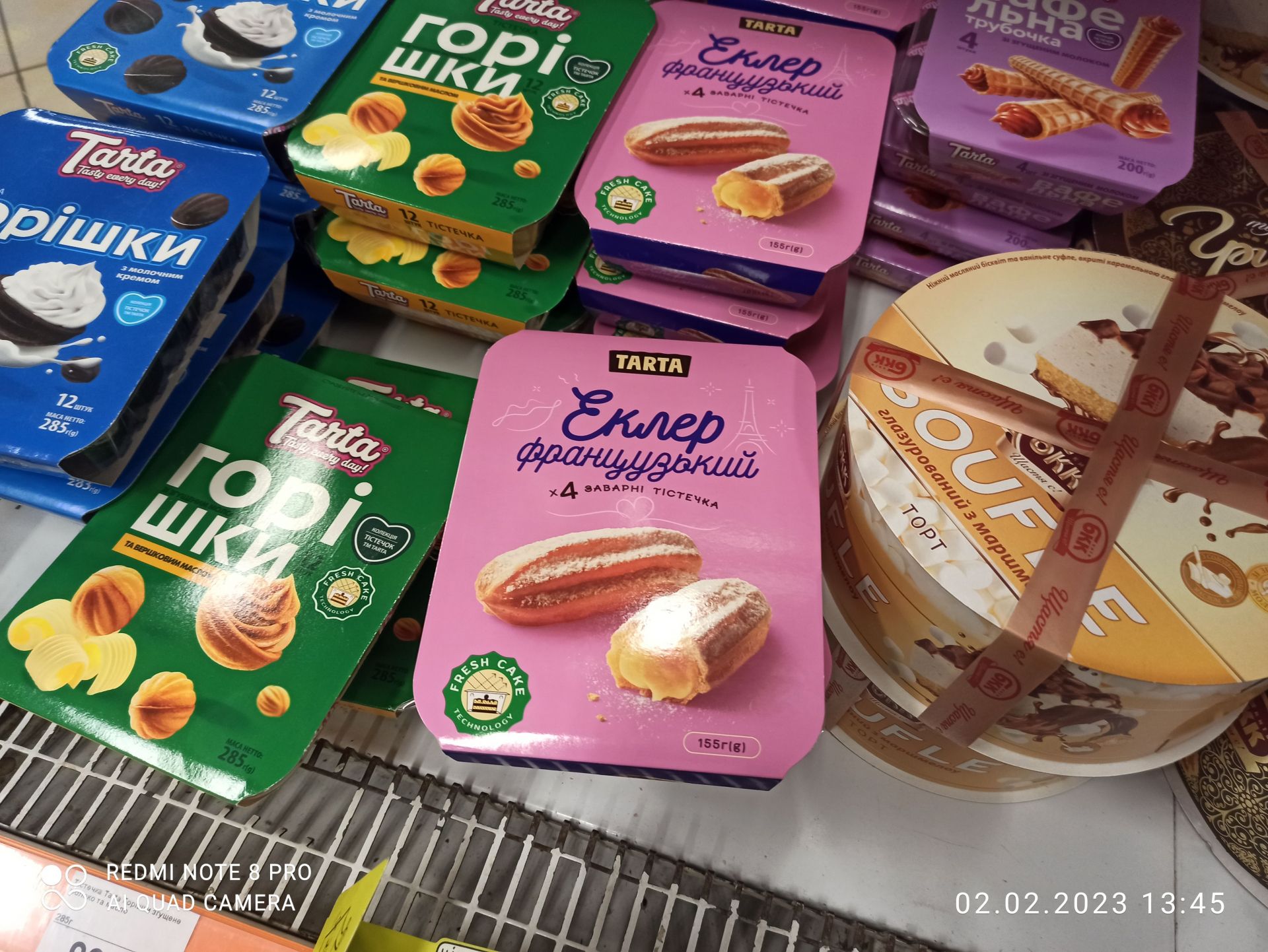 На час нашого візиту в цьому маркеті була електроенергія, отож усі холодильники працювали. Асортимент тортів та тістечок на полицях не надто великий, але вони свіжі й з актуальним терміном придатності, виглядають апетитно.