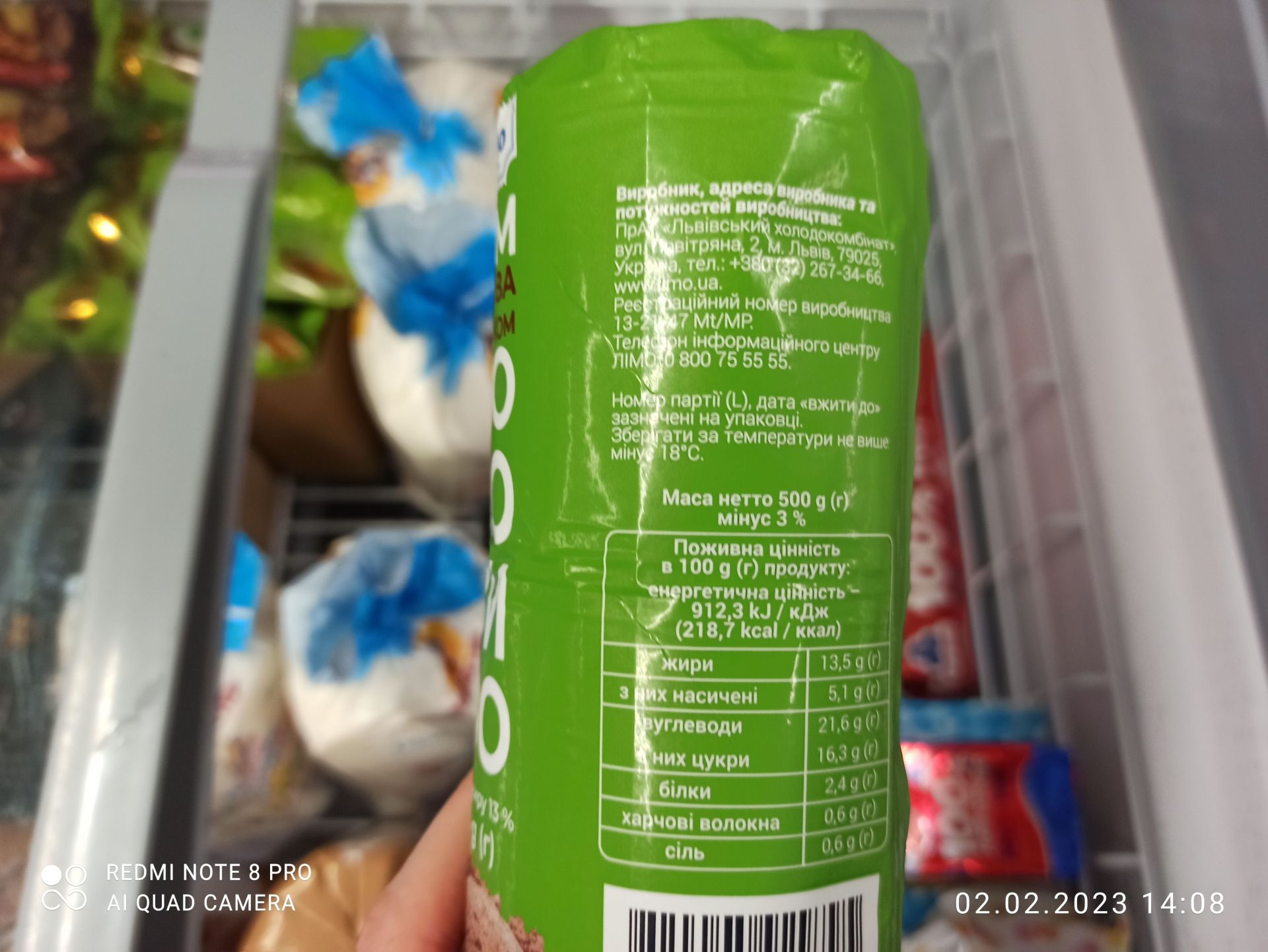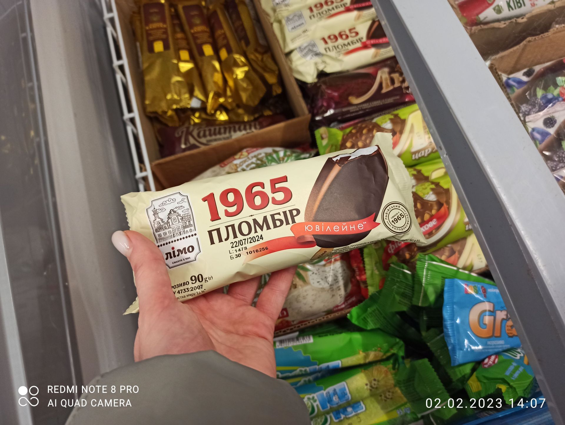 А ось пломбір «Белая Бяроза» (777 грам) у «циліндрі» – протермінований. Його термін придатності вийшов ще 5 вересня 2022 року. Тобто, понад п’ять місяців тому. Однак воно досі лежить у холодильнику. На пачці зверху наліпилось багато снігу.