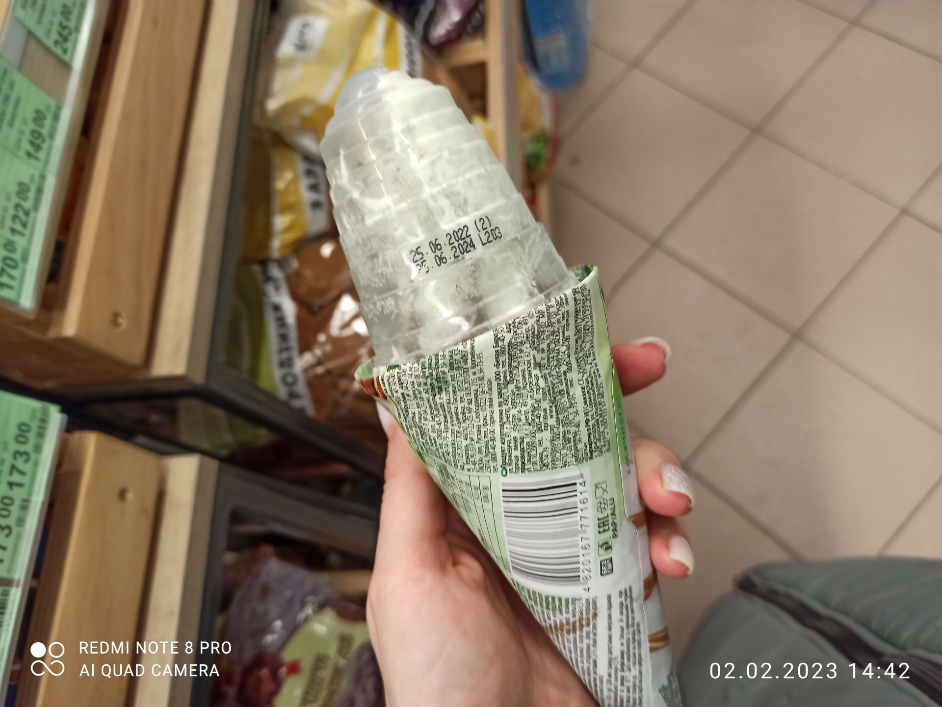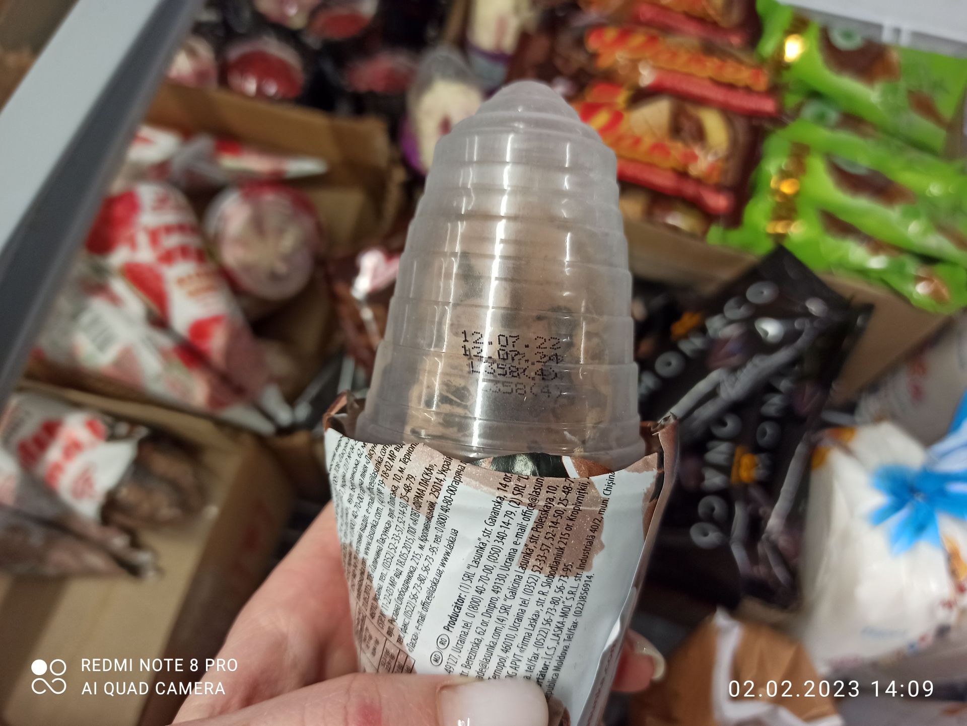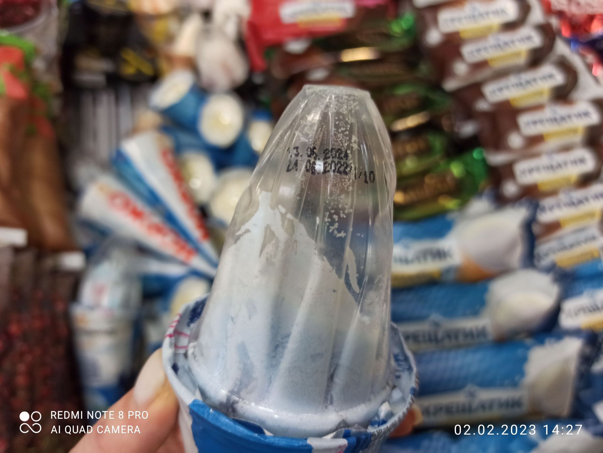 Аналогічна ситуація з морозивом. Особливо це стосується смаколиків у ріжку, адже відразу бачиш. Приміром, пломбір LASKA був скривлений, на пластиковому покритті напівстерлись терміни придатності, а всередині залишились намерзлі «патьоки». Зрозуміло, що солодощі вже танули і замерзали знову.