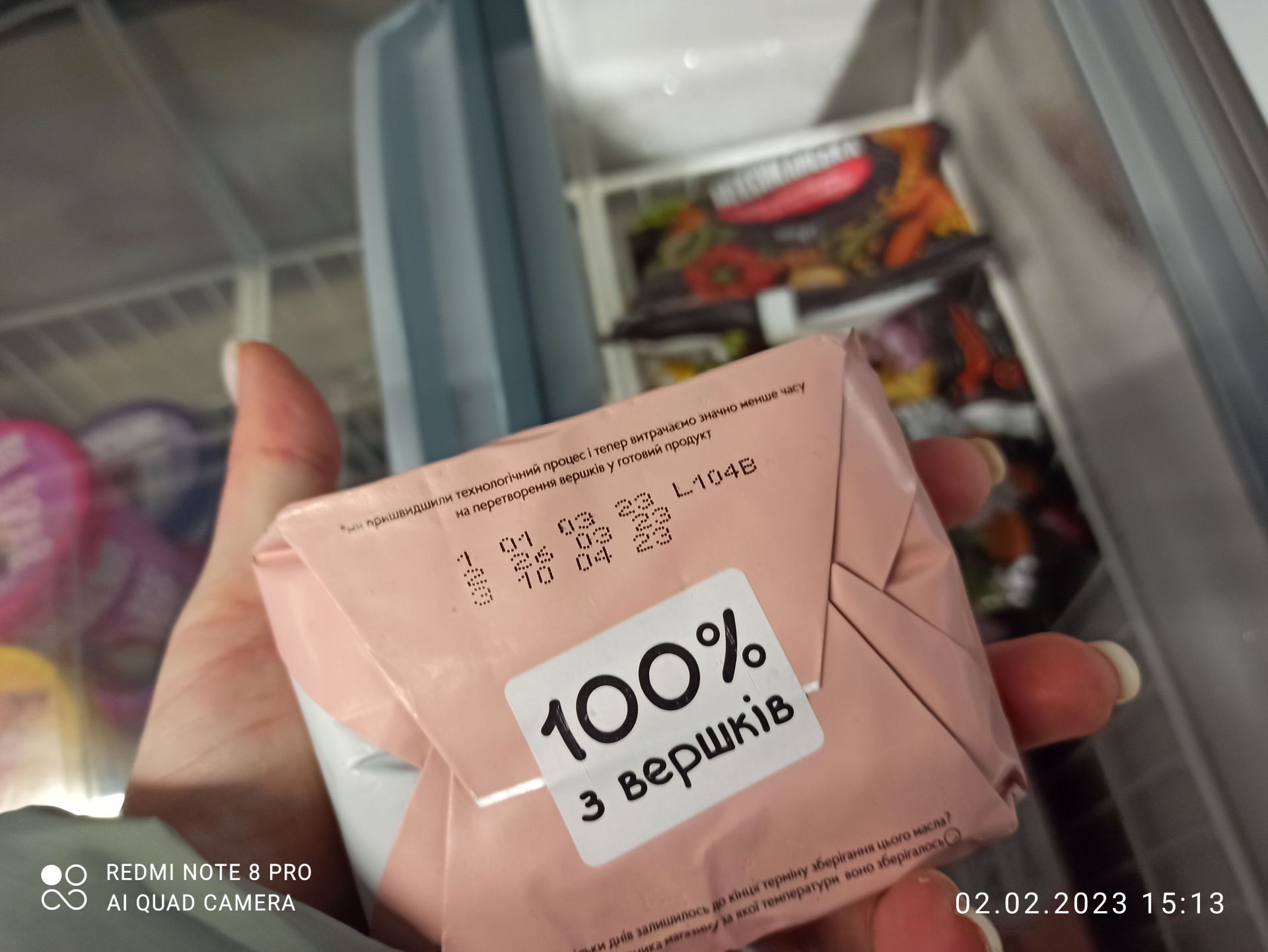 Це дві партії солодковершкового масла екстра від «Галичини». На старішій партії три дати: 29 грудня 2022 року, 23 січня 2023 року та 7 лютого 2023 року. Першою є дата виробництва, а друга і третя — «вжити до» за відповідних температур. На свіжішій партії дати, яка вже минула, ми не побачили. Масло старішої партії лежало у правому куті морозильної камери, а нової — посередині. Більше протермінованих товарів не знайшли.