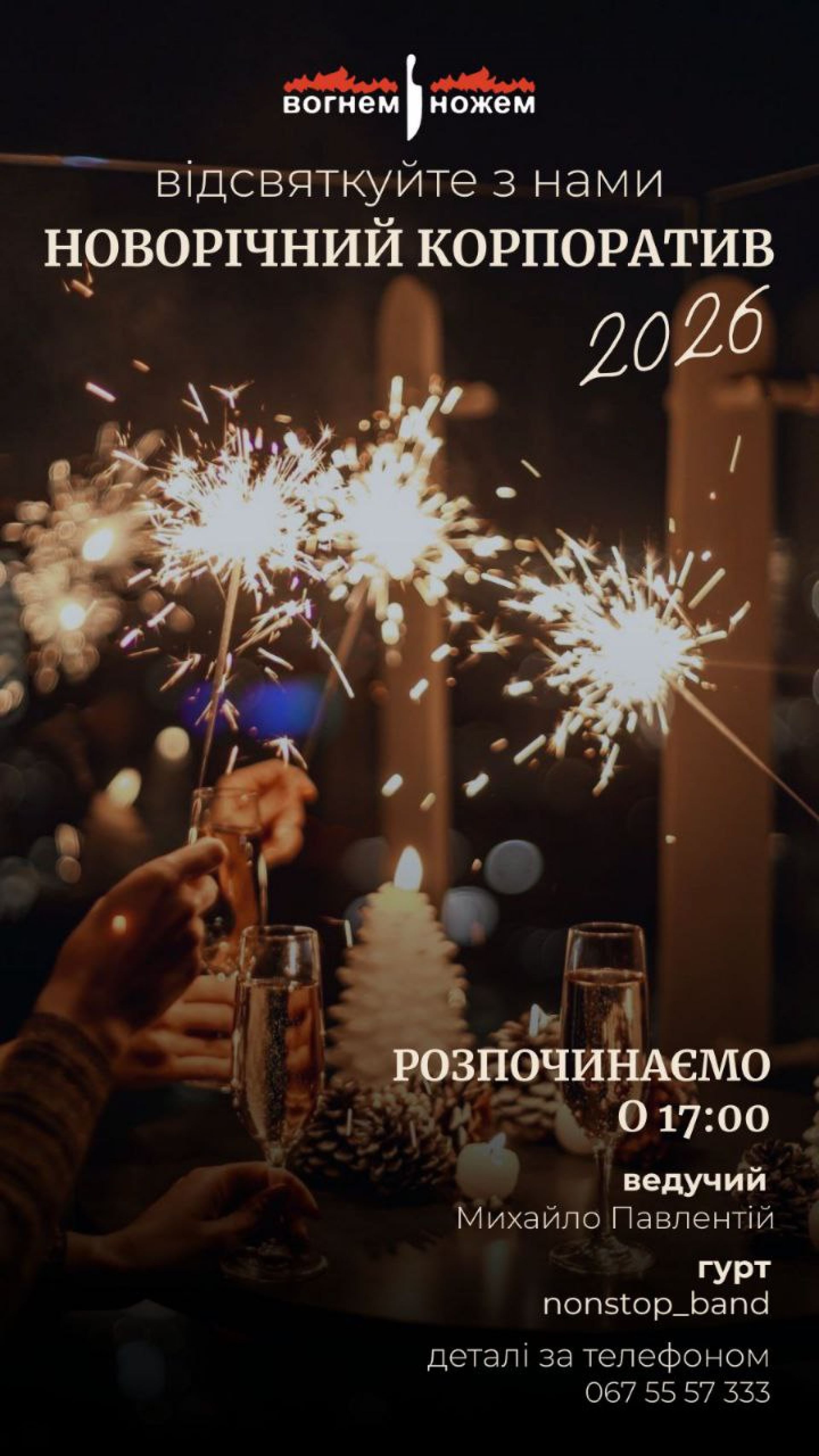 Ресторан «Вогнем Ножем» — це місце, де вогонь зустрічається зі смаком, а атмосфера створена для незабутніх подій. Сучасний інтер’єр, тепле освітлення, авторська кухня та бездоганний сервіс роблять наш заклад ідеальним простором для відпочинку, святкувань і бізнес-заходів.