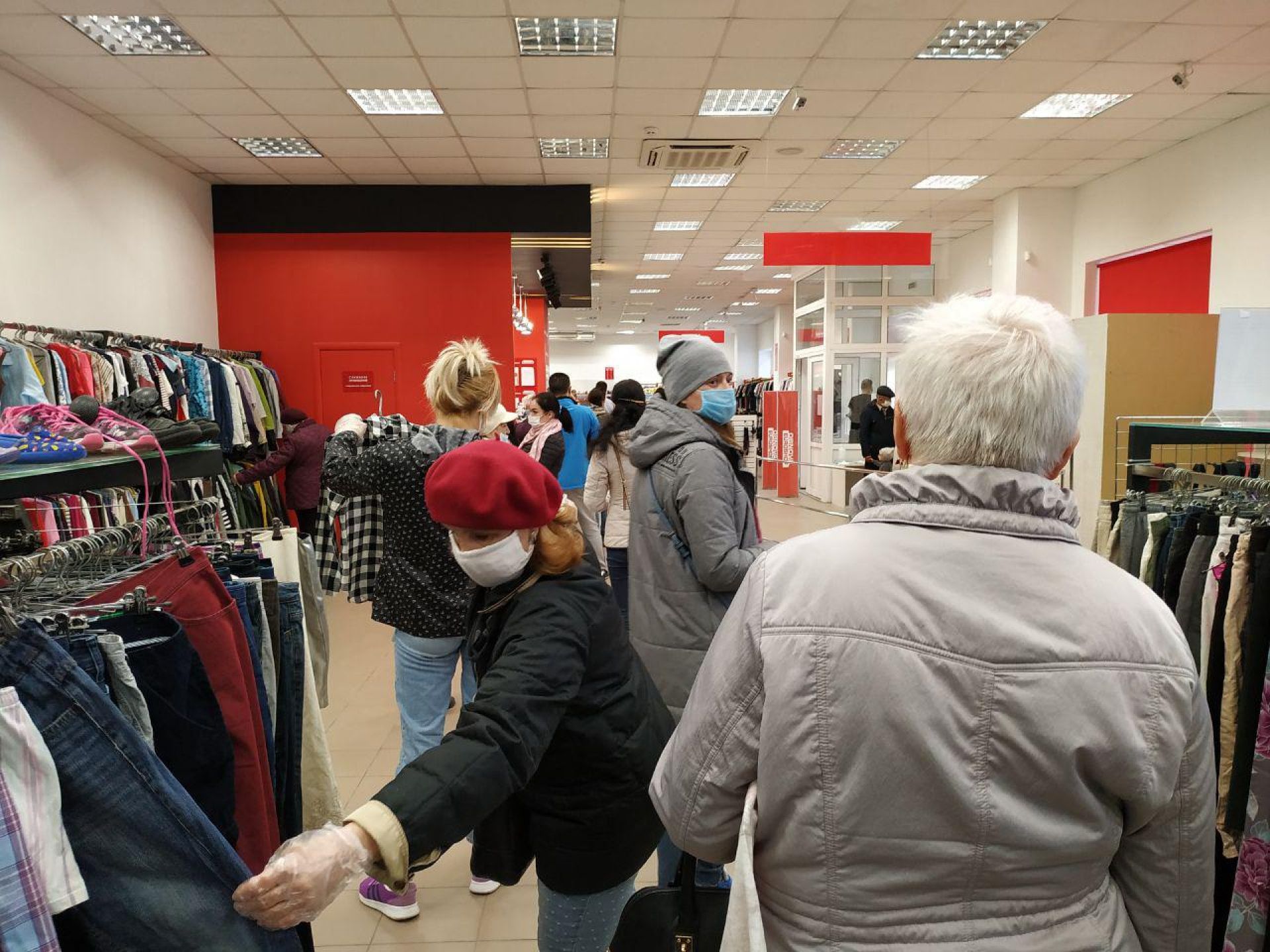 У магазині «Євро секонд-хенд», що знаходиться в центральній частині міста, одразу при вході стоїть працівниця та нотує в зошит кількість відвідувачів. Ймовірно, вона це робить для того, щоби покупців у приміщенні не було більше, ніж дозволено. Одразу біля входу є дезінфектор для рук та одноразові рукавички для відвідувачів.