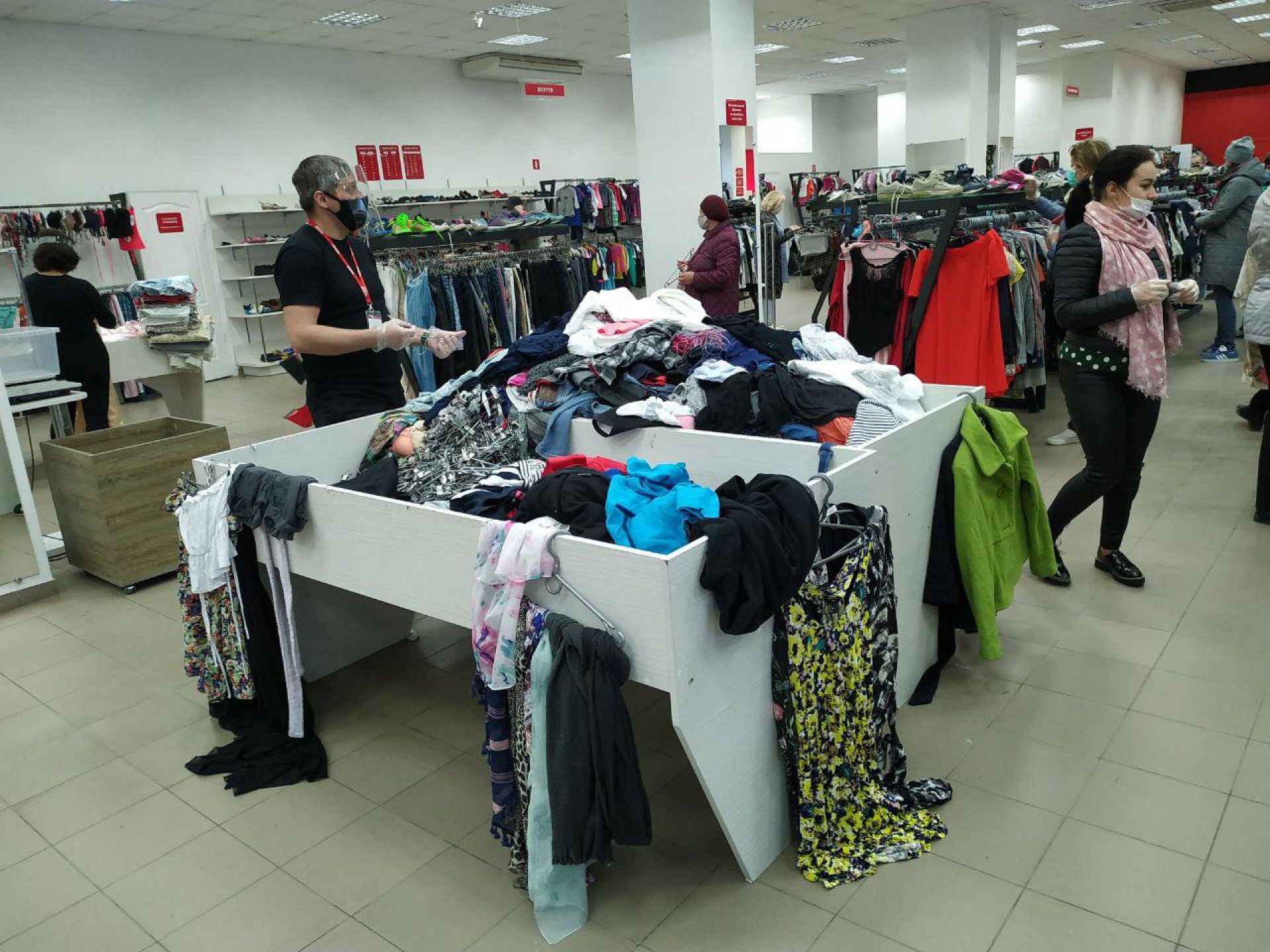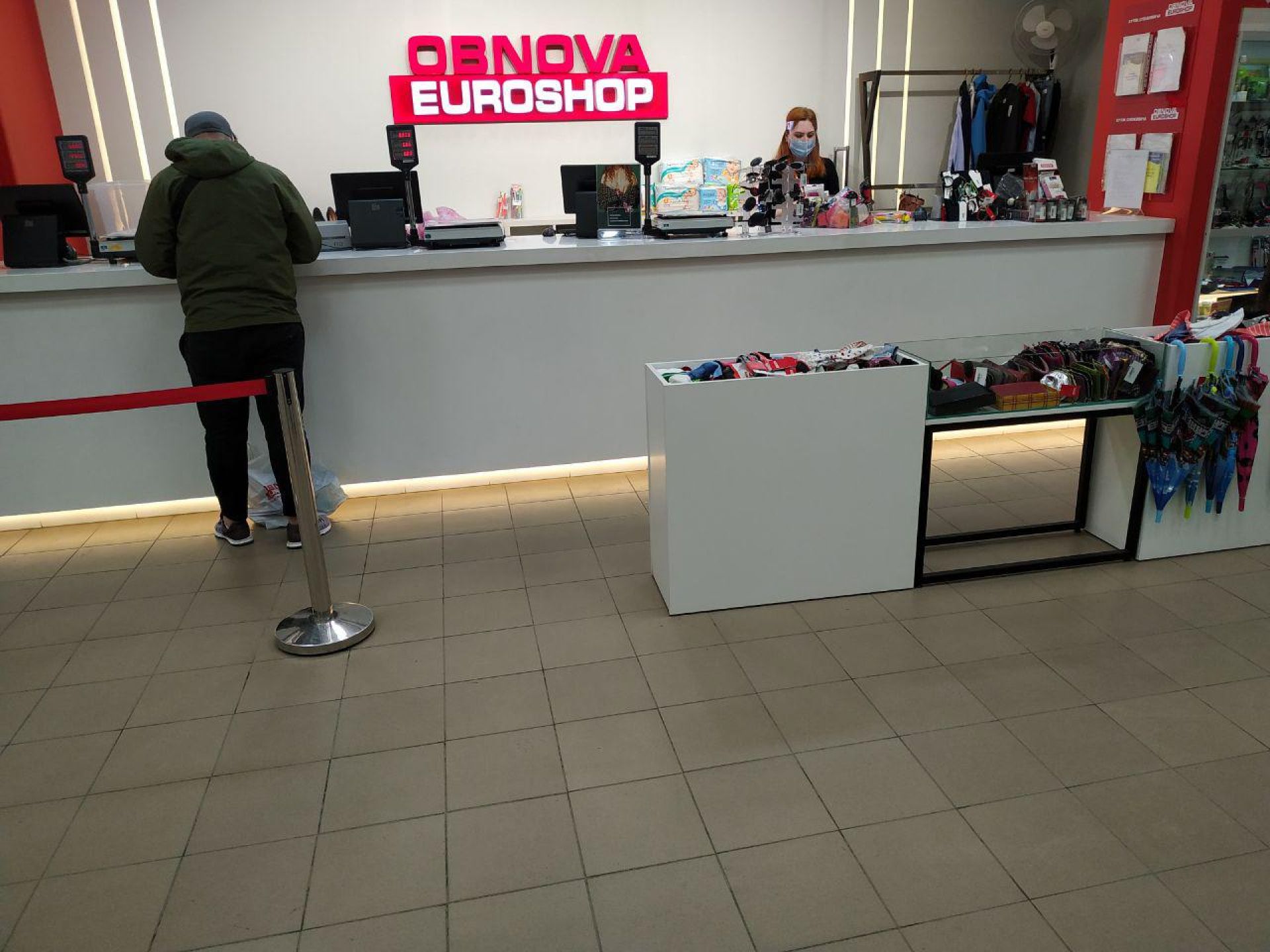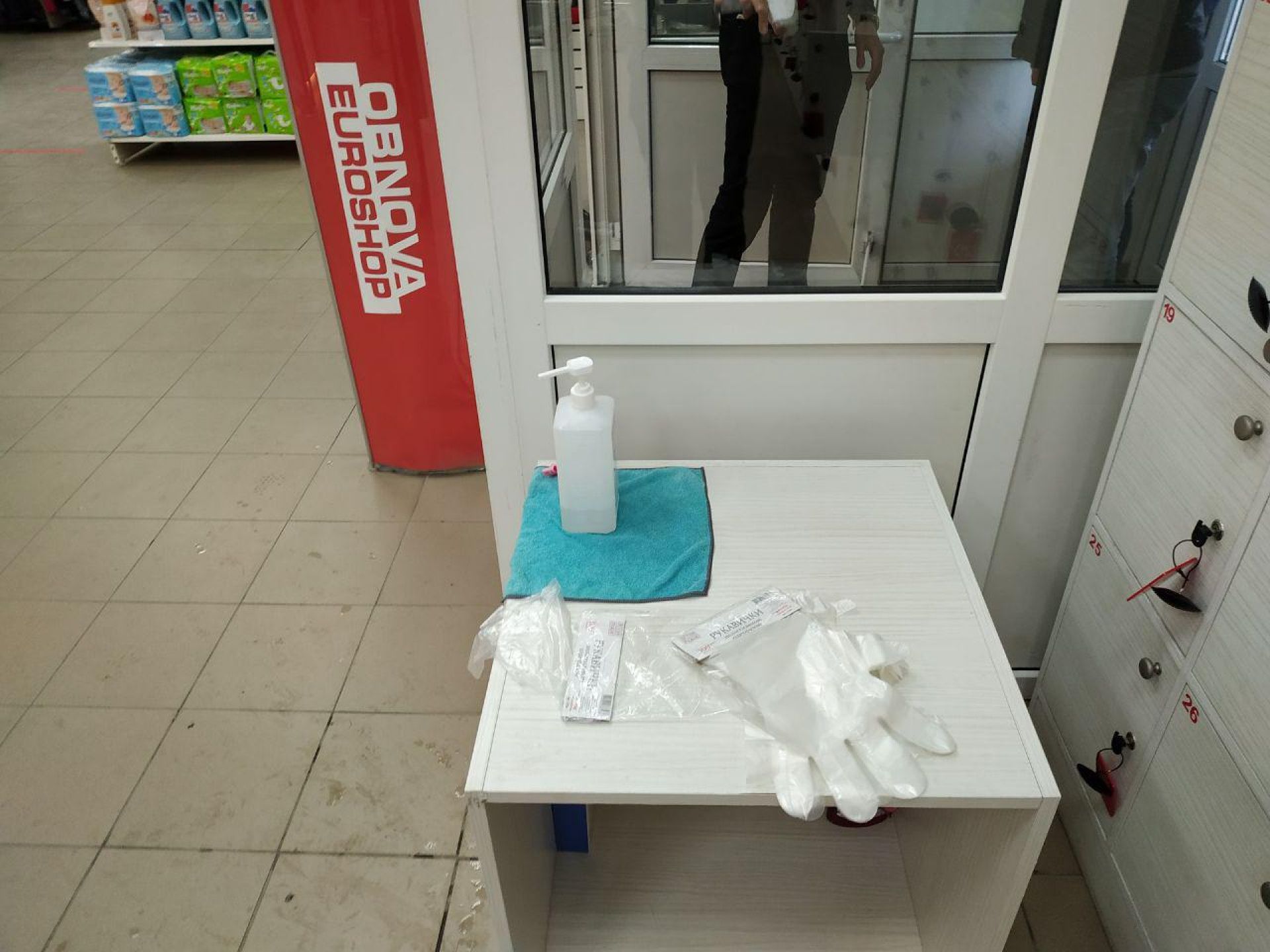 У магазині секонд-хенду «Єврошоп» одразу при вході стоїть охоронець та перевіряє наявність масок і міряє температуру усім відвідувачам безконтактним термометром. Також він вказує всім покупцям на спеціальне місце, де можна продезінфікувати руки та одягнути захисні рукавички.