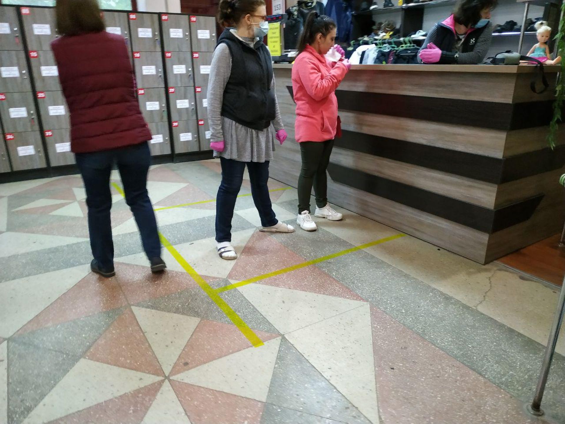 Як і в попередніх магазинах перед касами та примірочними на підлозі наклеїли скотч. У всіх працівників є захисні маски та рукавички.