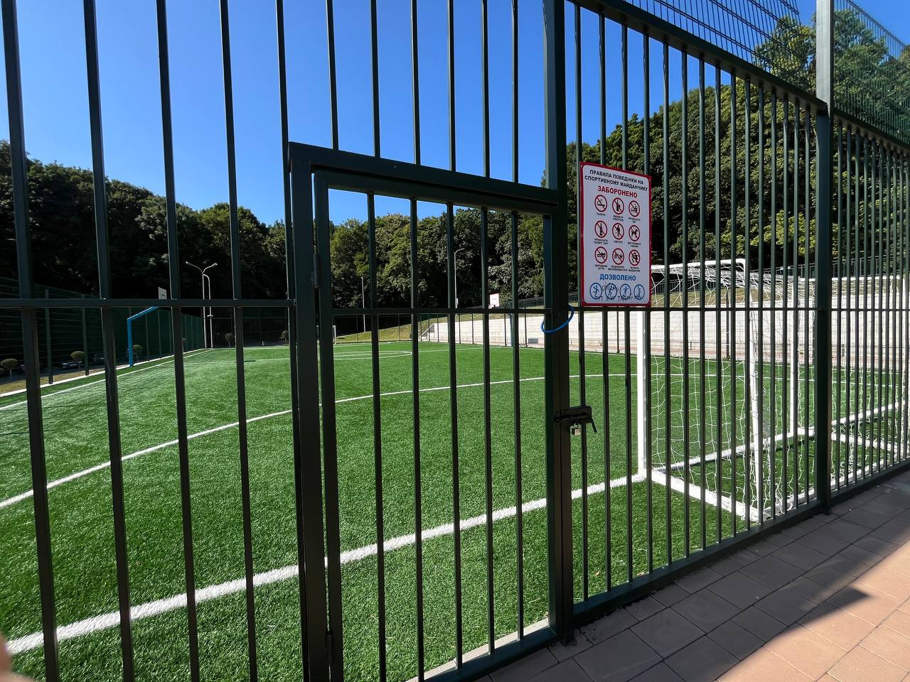 А ось на спортивний майданчик потрапити не вдасться, адже на воротах повісили металевий замок. Жодних номерів телефону для відпочиваючих не залишили.