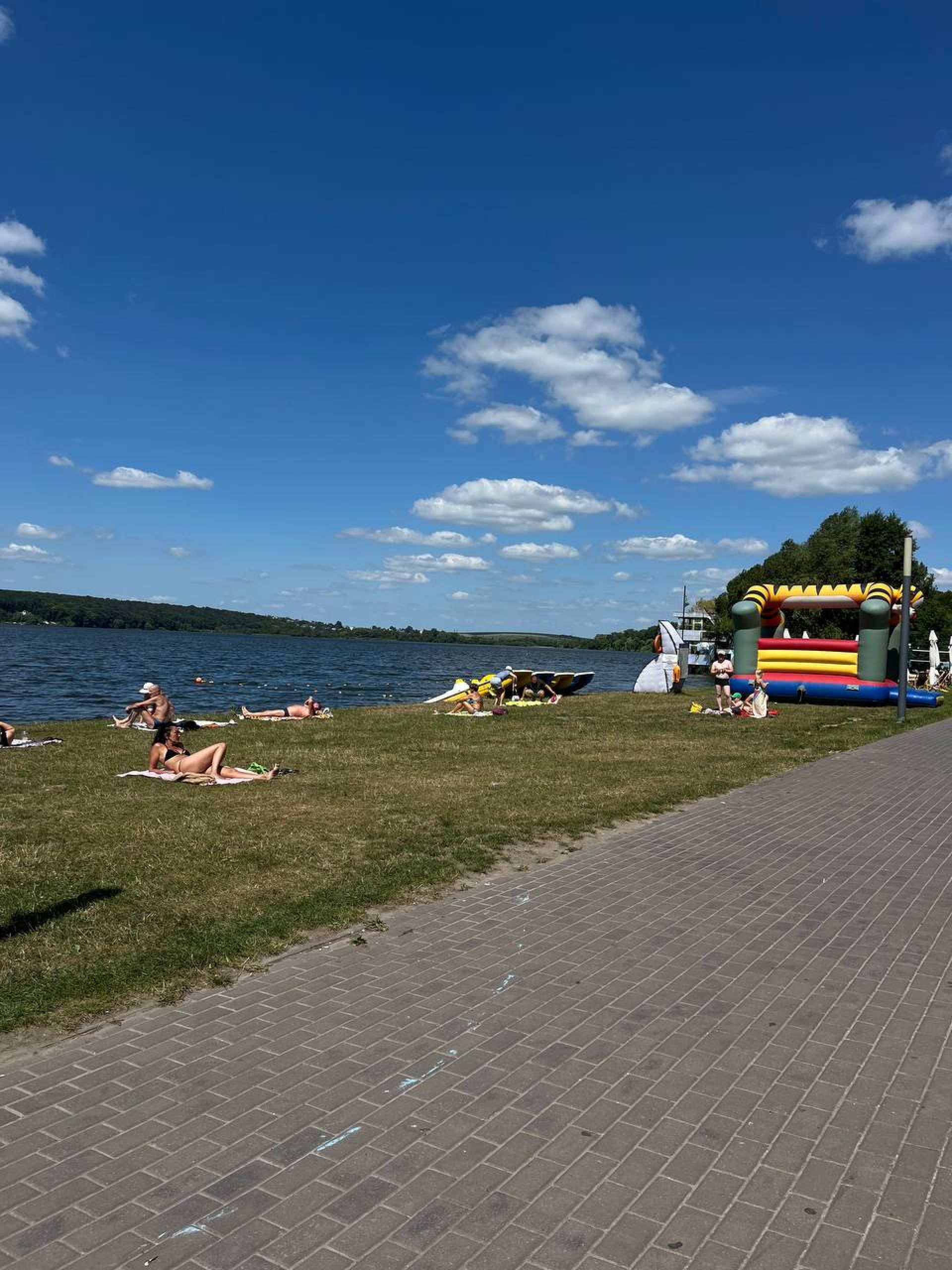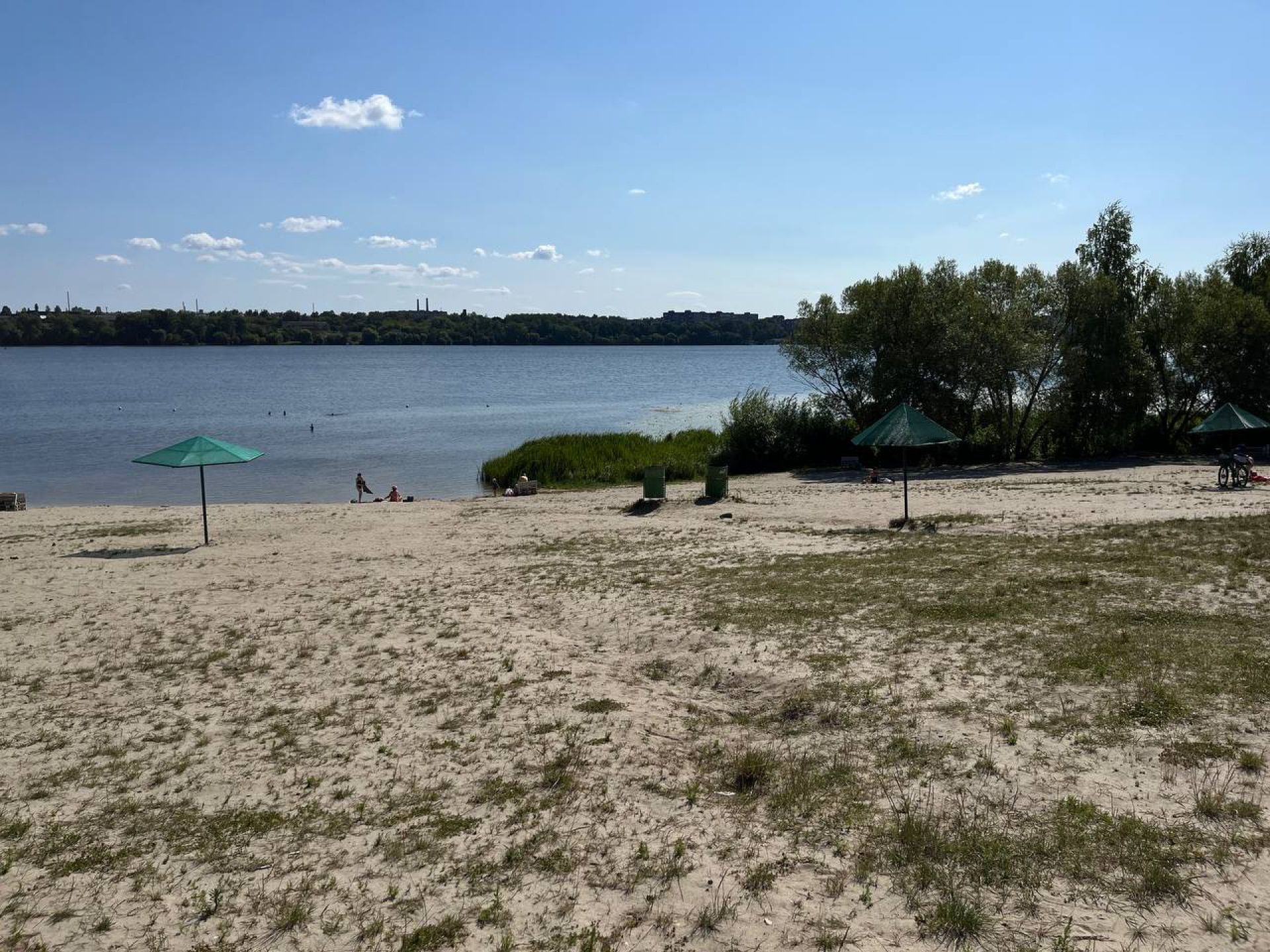 На пляжі піску майже немає, переважно дрібна трава. Там люди розстеляють рушники, ковдри та відпочивають. 30 липня переважно були дорослі.