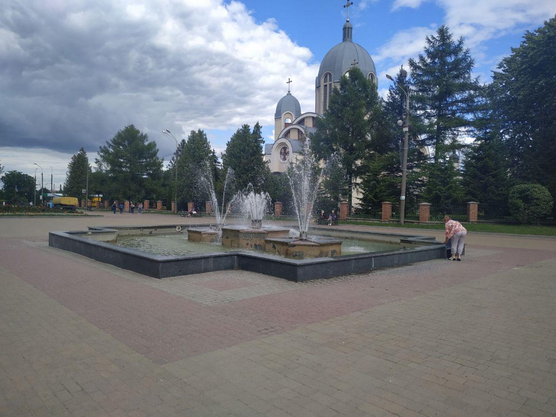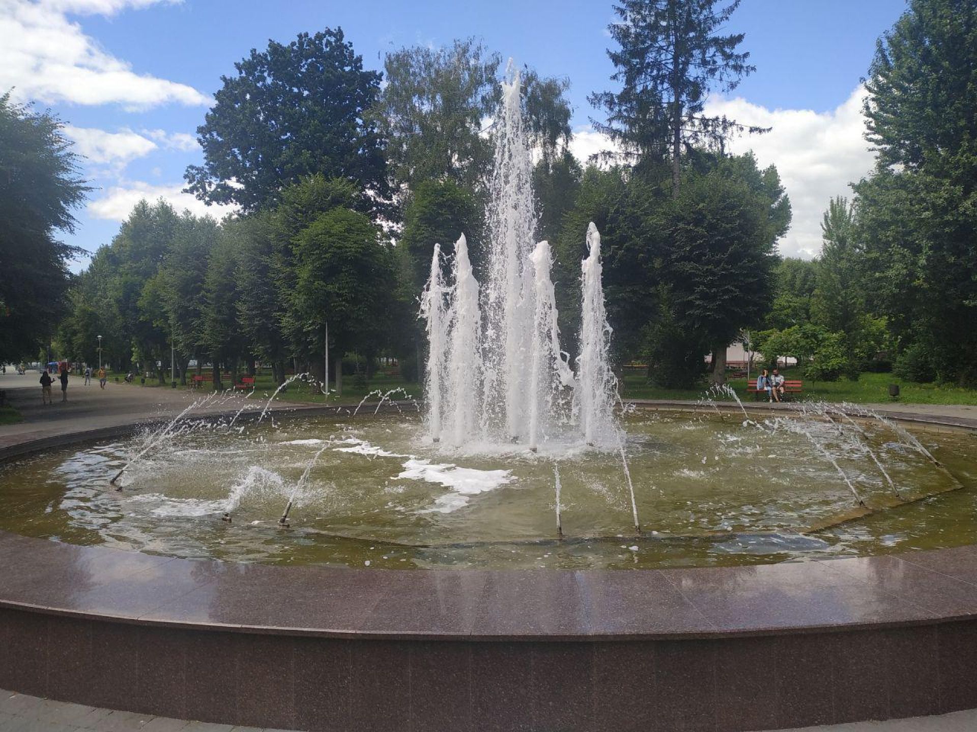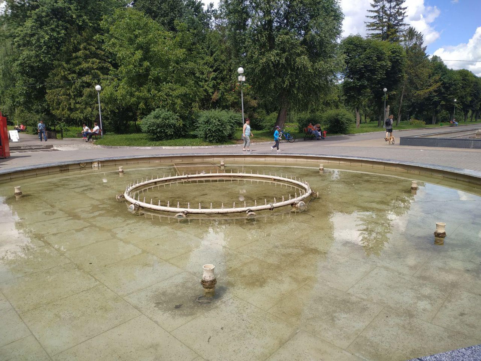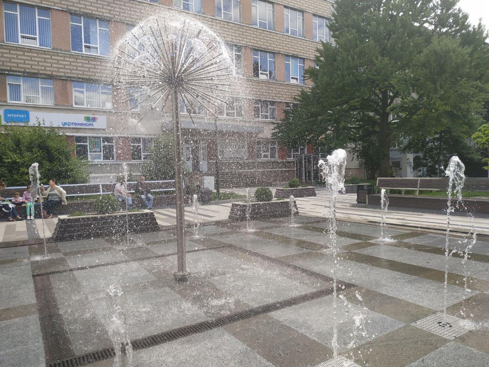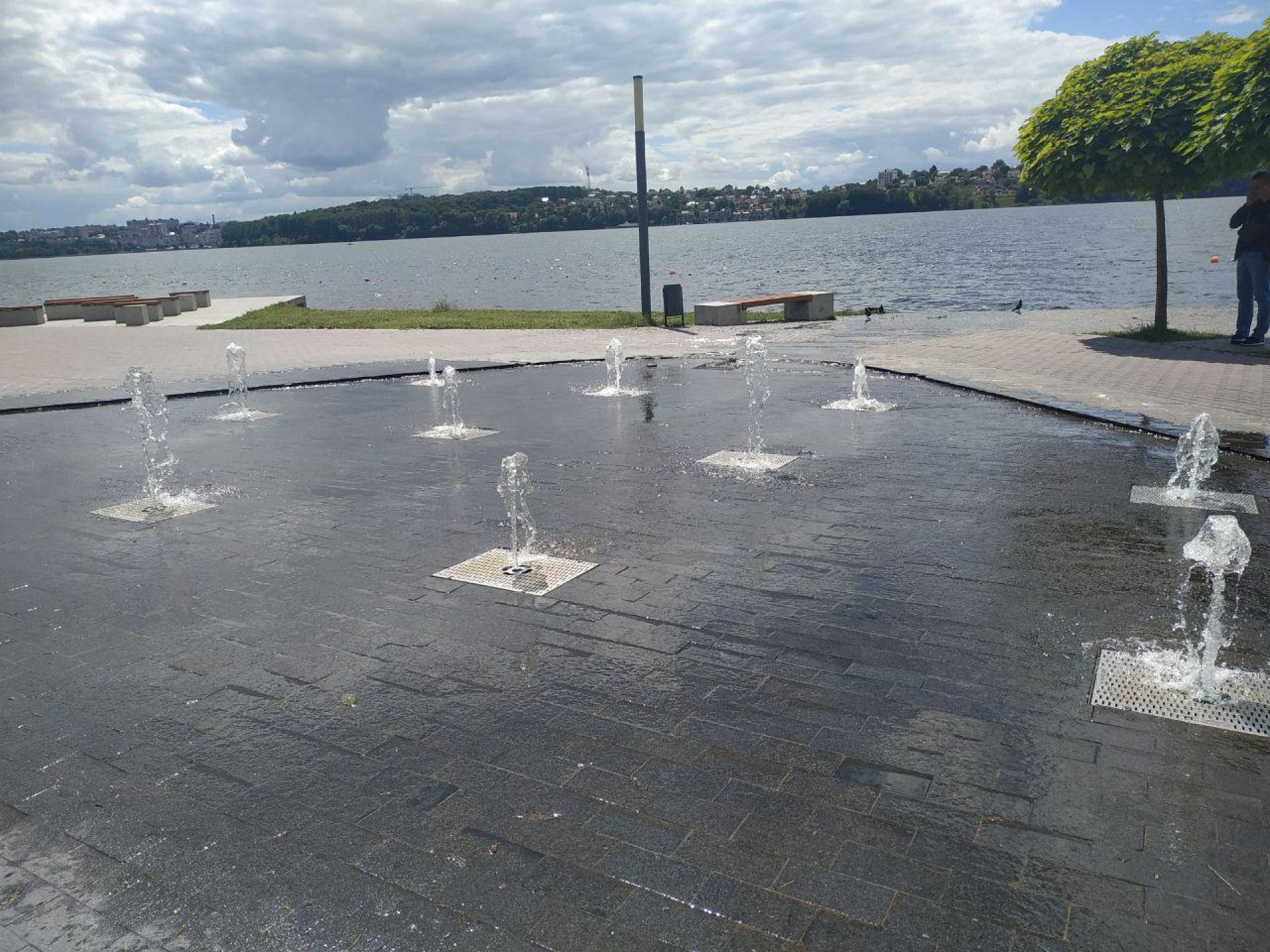 Такі ж справи і з фонтанами в парку «Національного відродження» та на «Циганці». Вони також працюють справно, а вода в них виглядає чистою. Проте в парку вода від фонтану неповністю стікає у водовідвідну яму, а розтікається по асфальту та до лавок, де сидять люди.