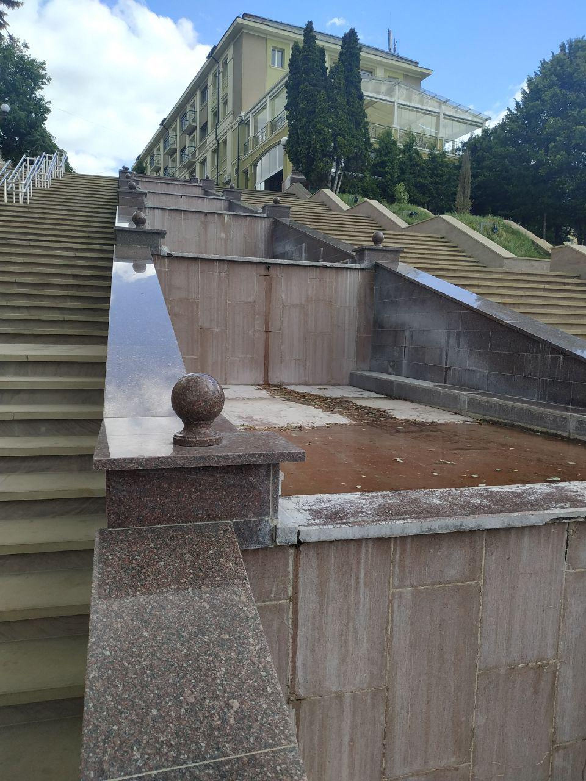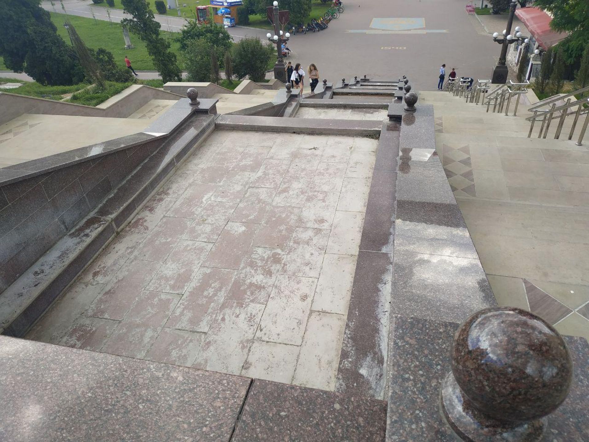 Фонтан «Каскад» складається з двох частин: верхній водограй та «Каскад на сходах (у народі – «Сльози Гронського»). Проте жодна з цих частин не працює. Хоч і сходи вздовж «Каскаду» нещодавно реконструювали, сам фонтан виглядає занедбаним. Води в ньому майже немає, а та що є – це залишки дощу.