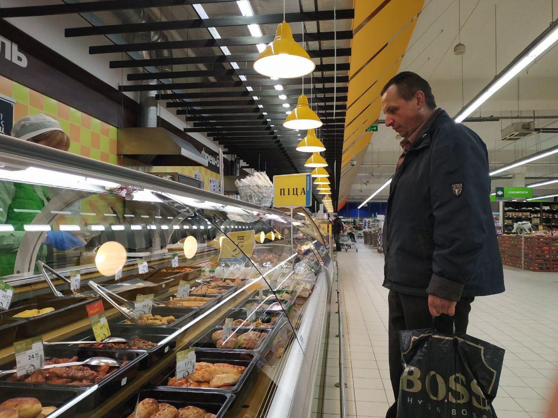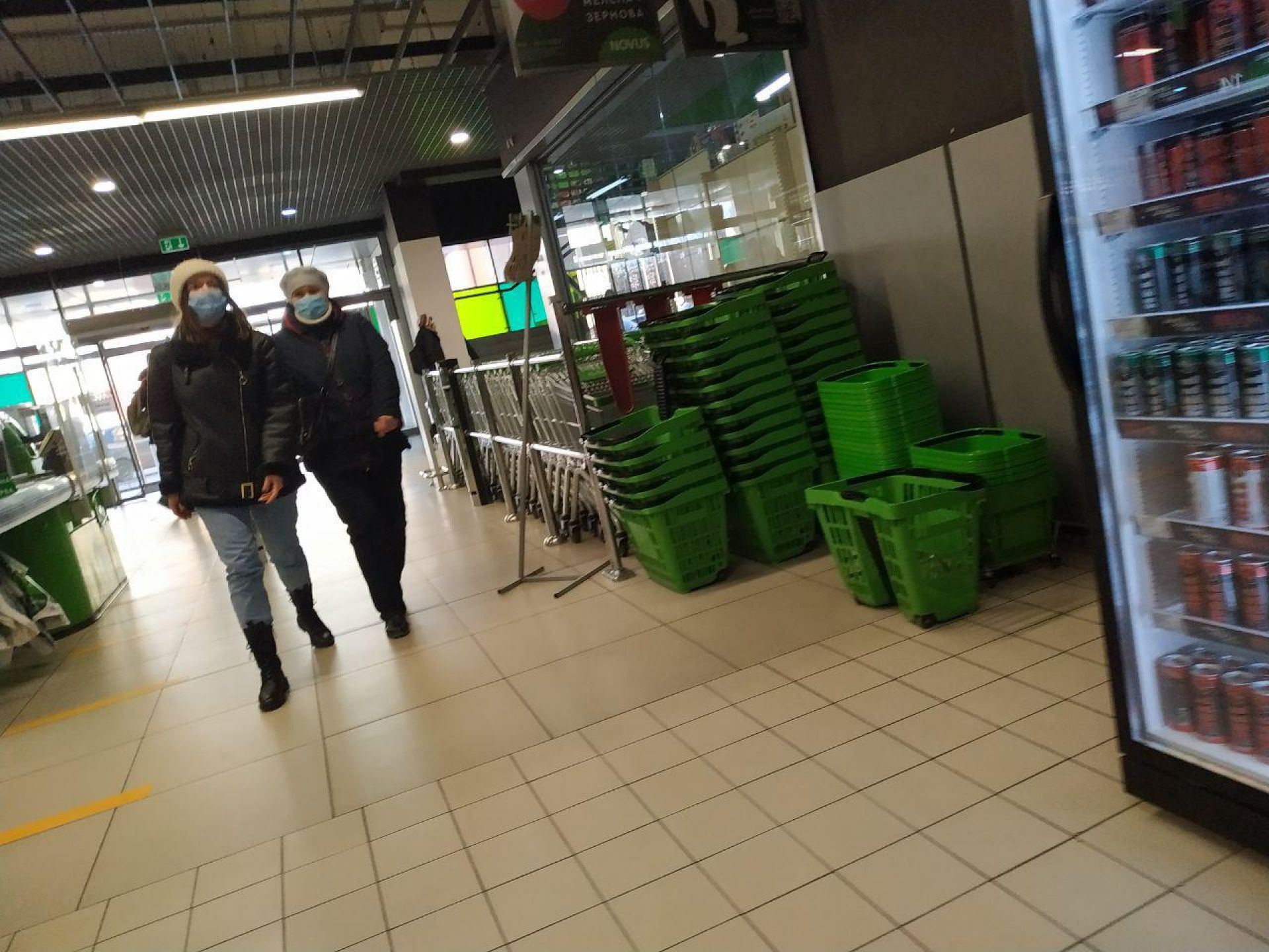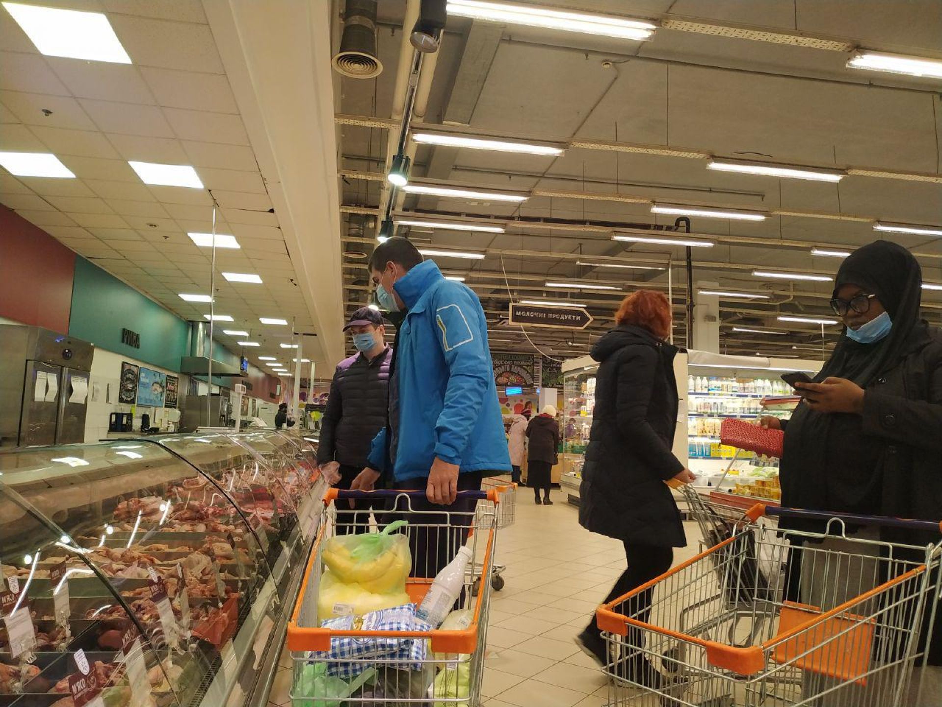А от в супермаркетах людей значно менше. Втім, вони перебувають в масках, щоправда не всі, а дехто маску одягнув лише на рот.
