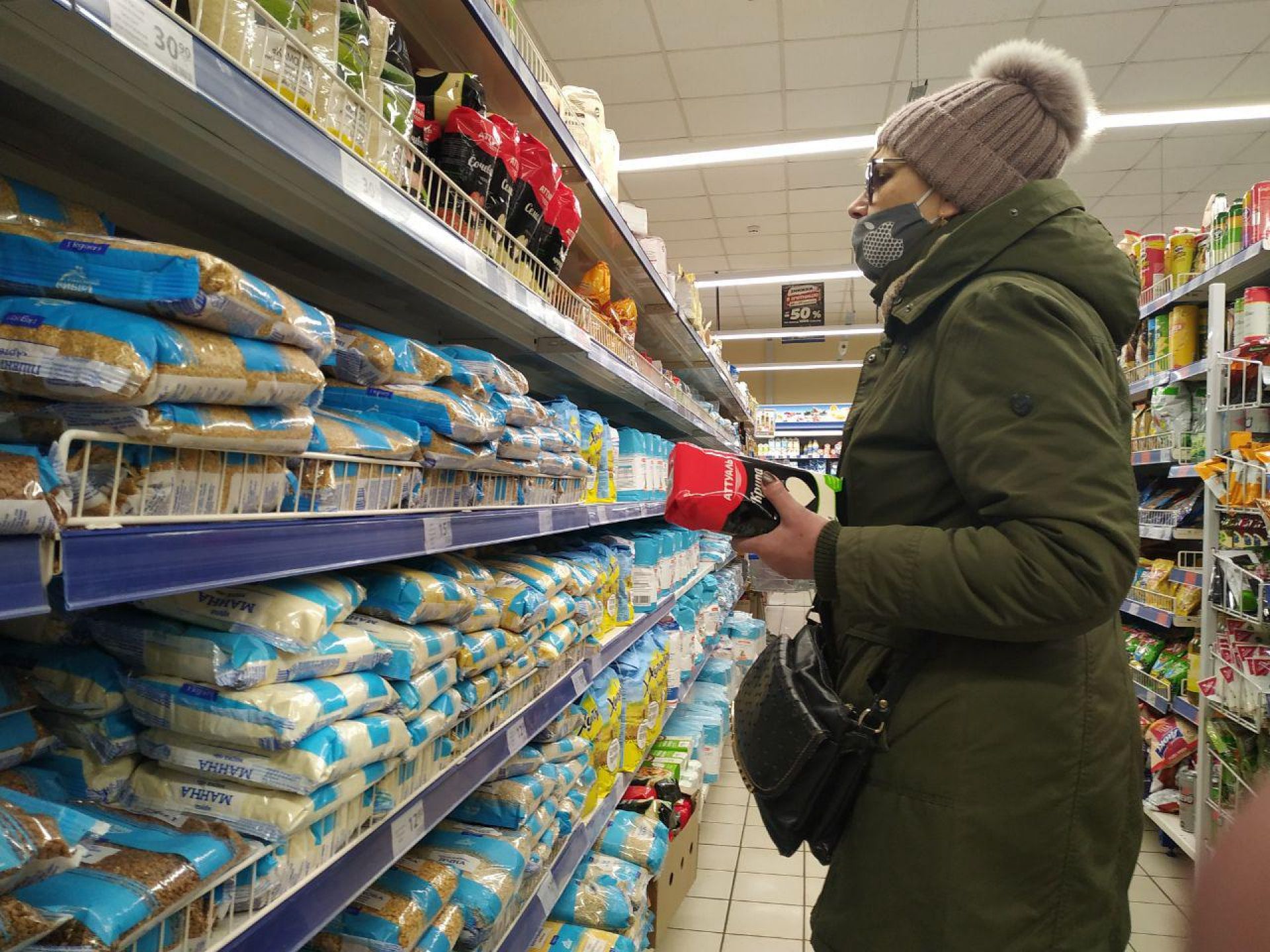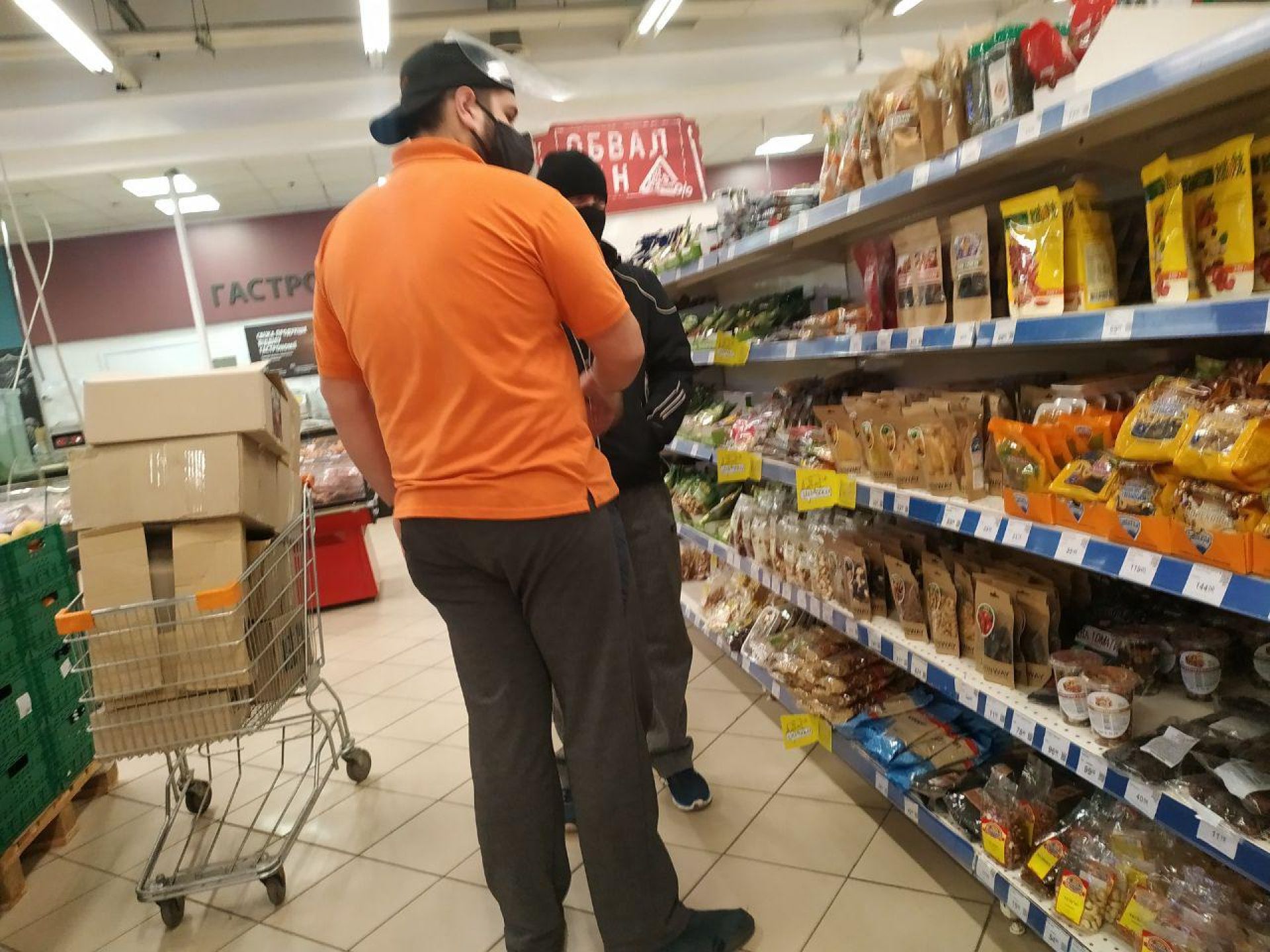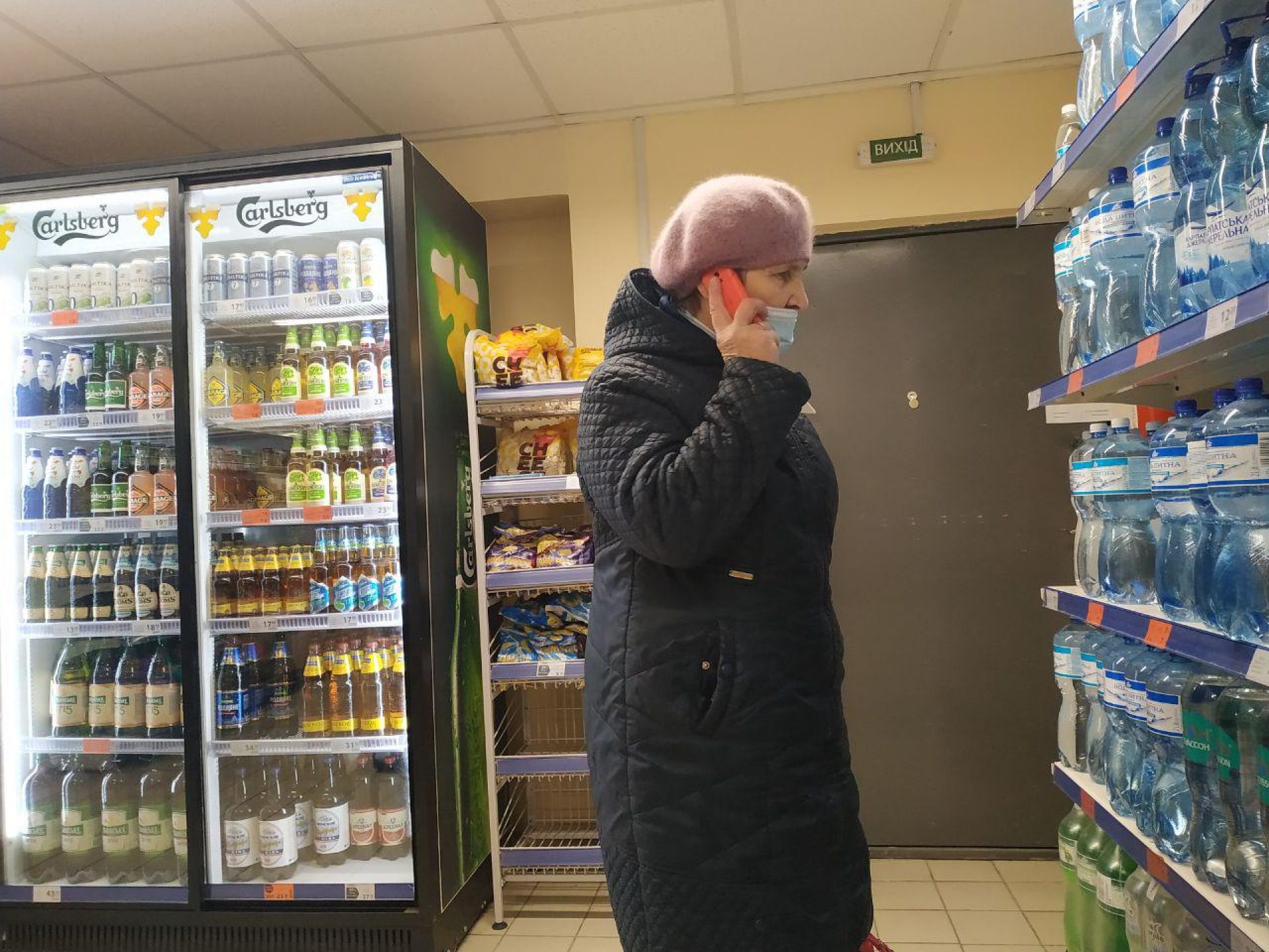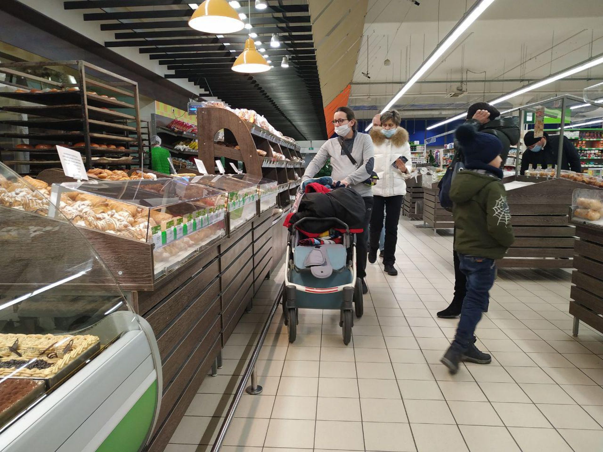 А от в супермаркетах людей значно менше. Втім, вони перебувають в масках, щоправда не всі, а дехто маску одягнув лише на рот.