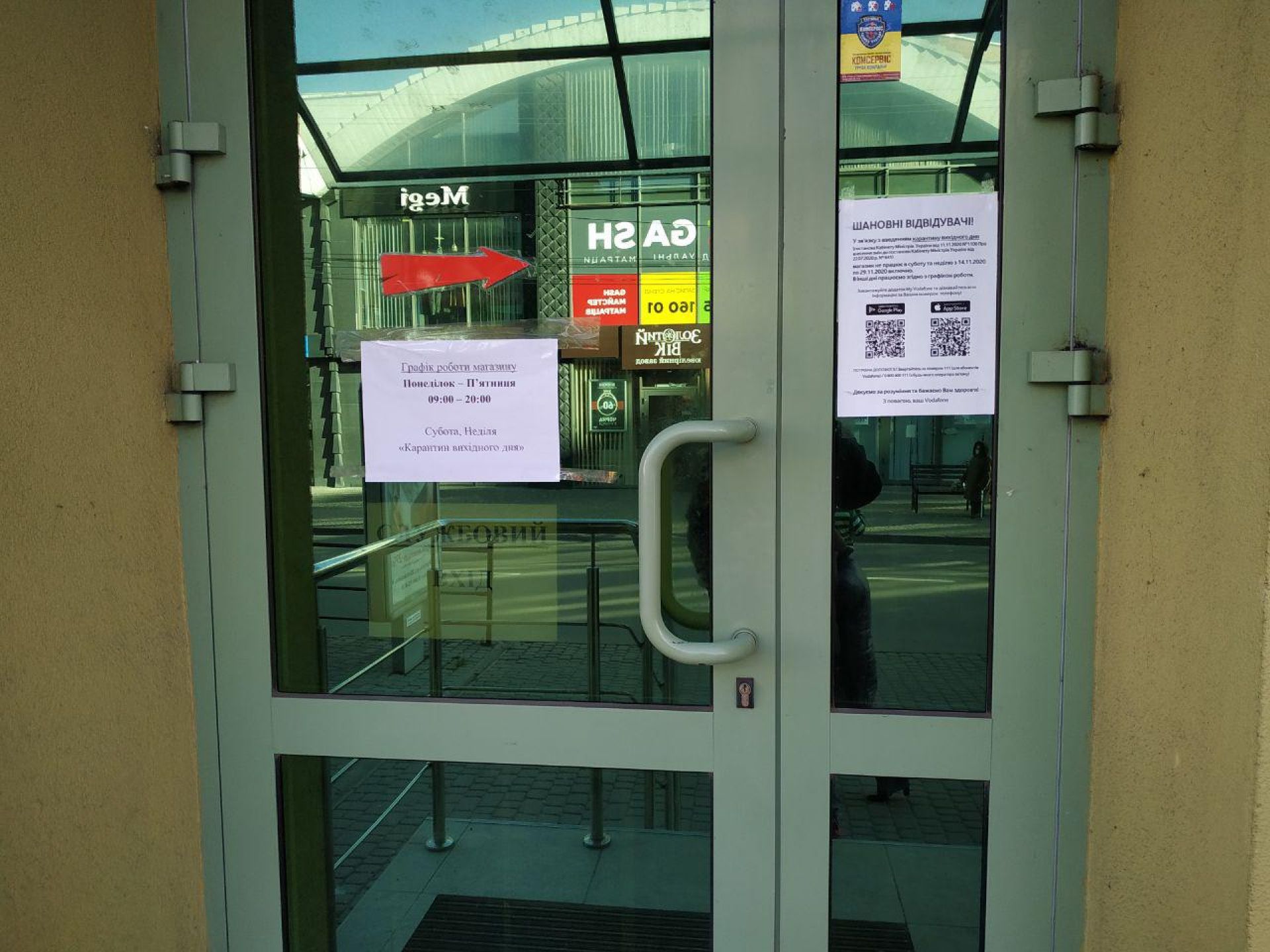 Магазини працюють, але не всі. В центральній частині міста у вихідні свою роботу продовжили досить багато магазинів. В решти вже при вході є інформація про графік своєї роботи, а також про те, що через карантин вихідного дня, свої двері для покупців вони відкриють лише з понеділка.