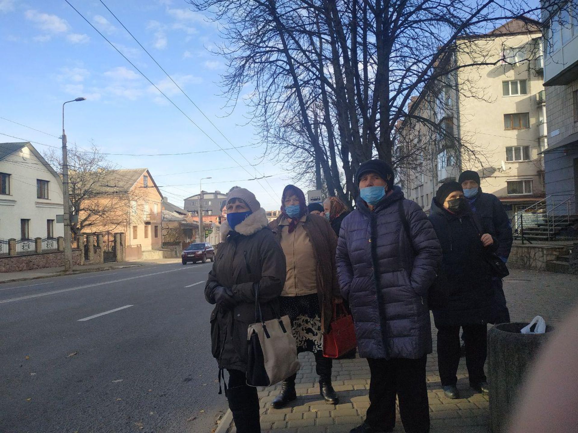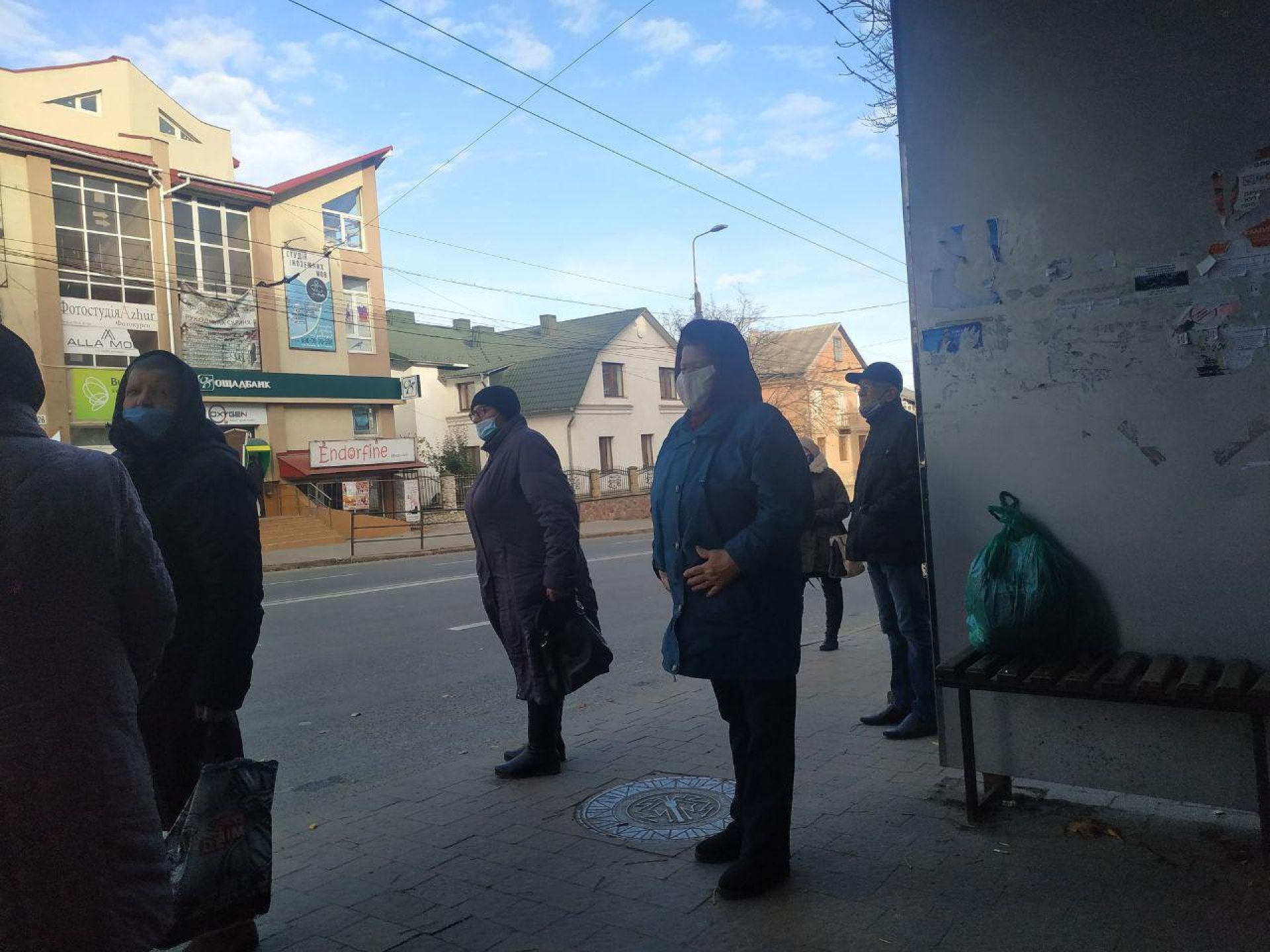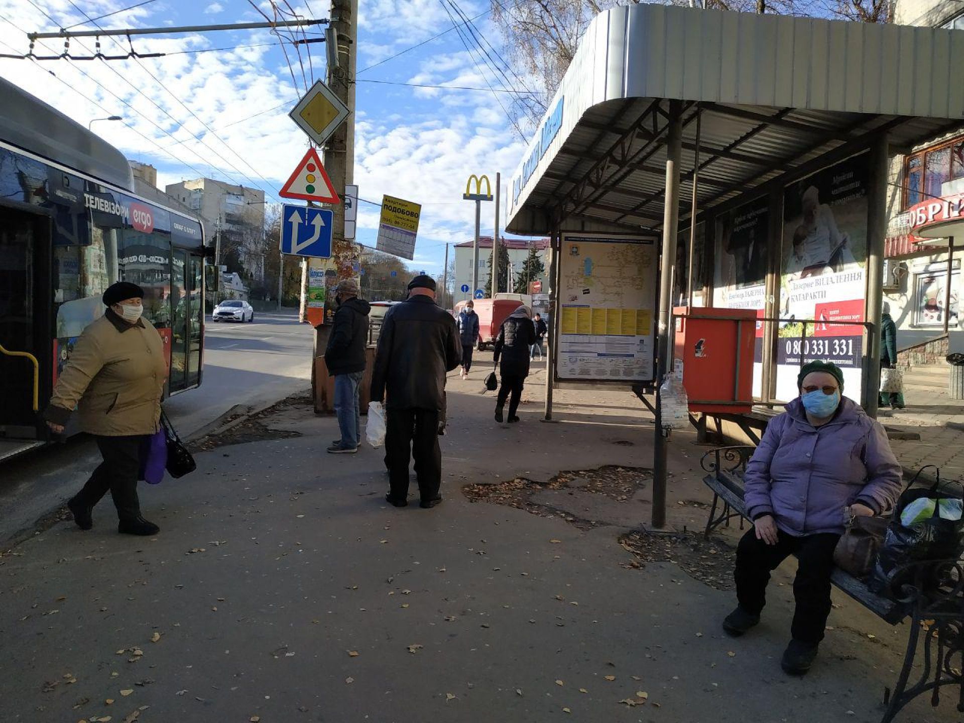 На зупинках тернополян також вдосталь. Не всі вони в масках, але одразу помітно, що чим більше скупчення людей на зупинці, тим менше серед них тих, хто без маски.