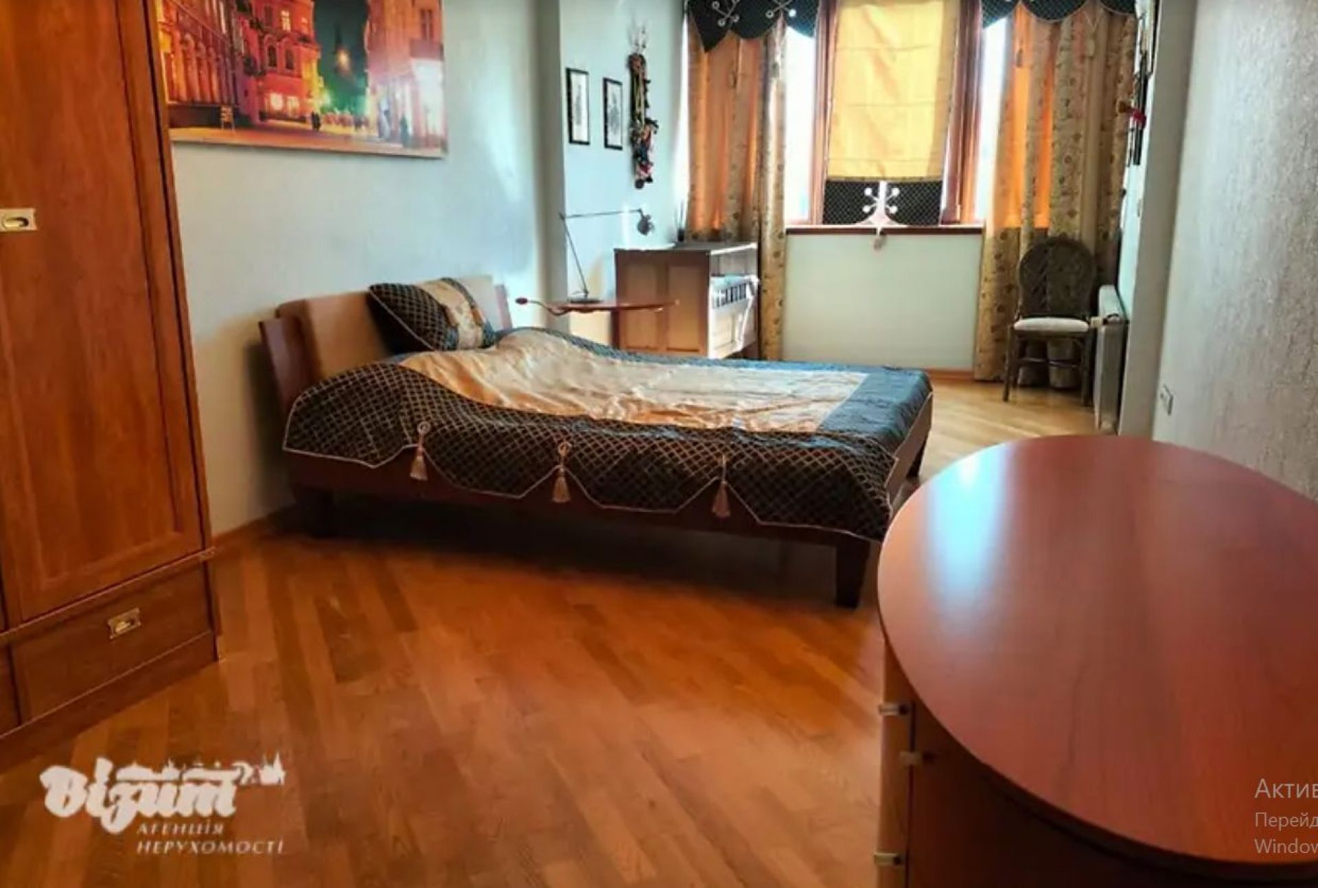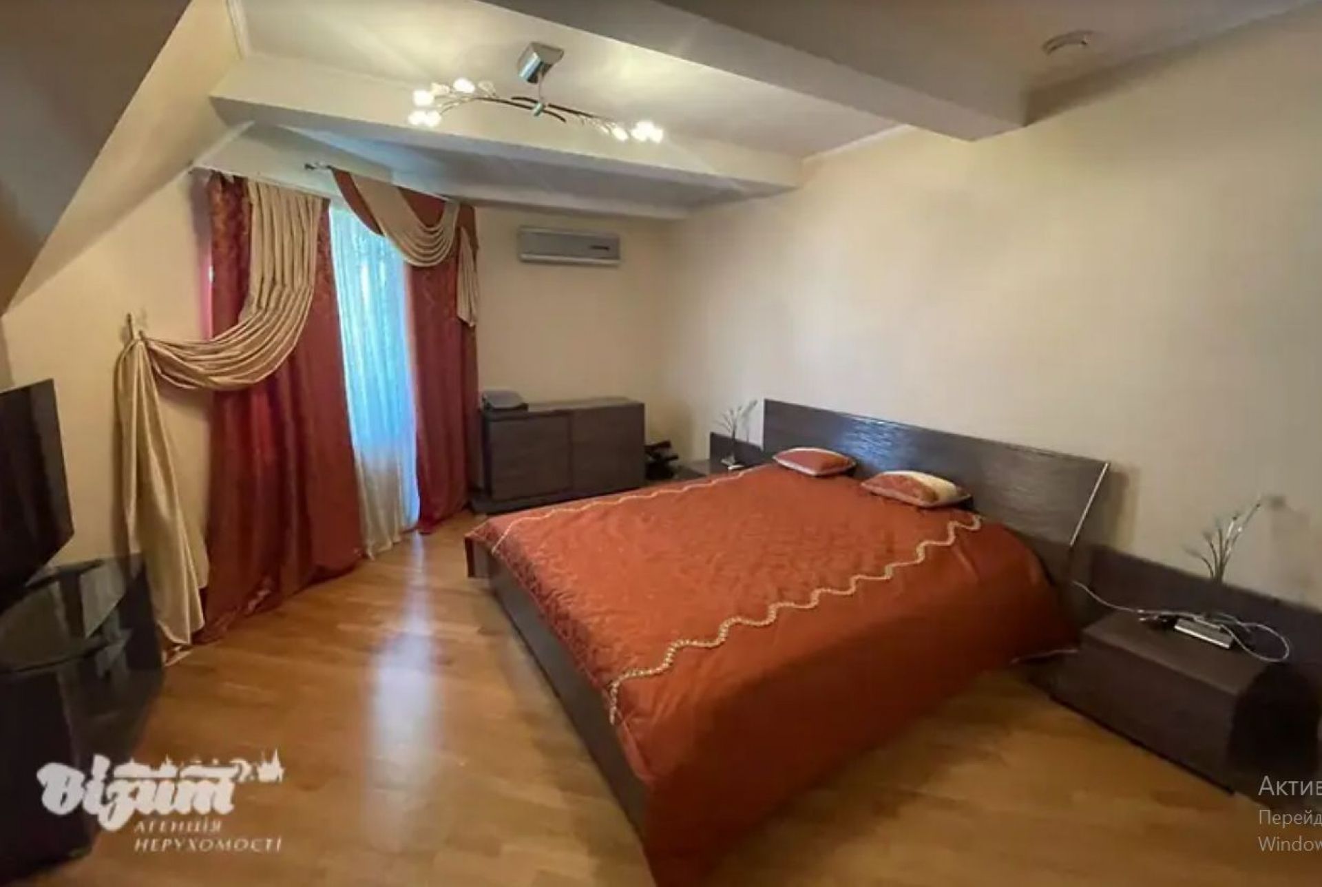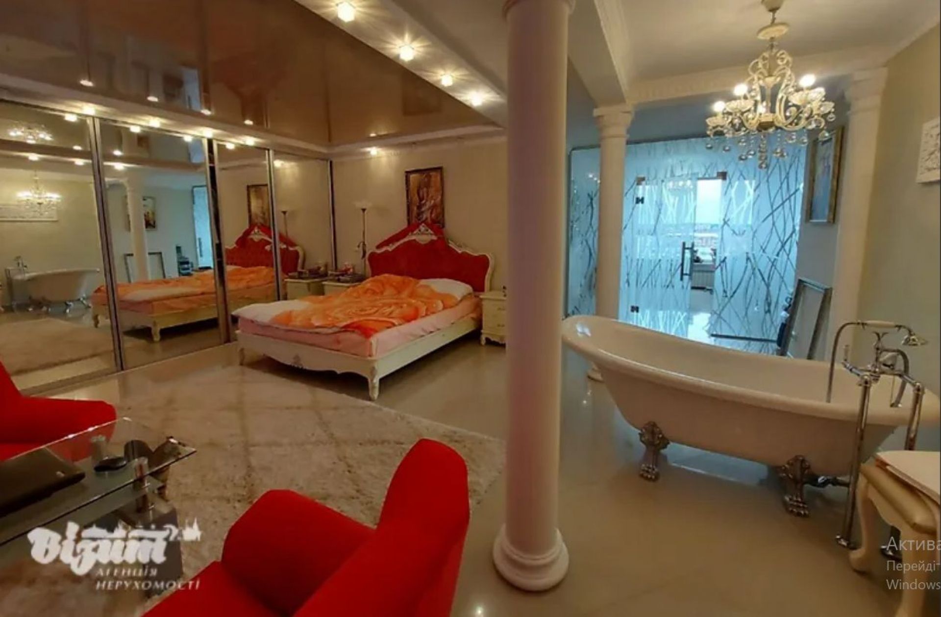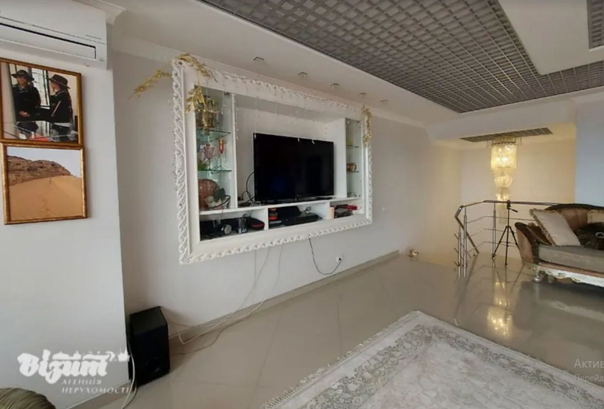 Продається двоповерховий пентхаус через дорогу від парку Шевченка на березі ставу. З трьох балконів і тераси відкривається вигляд прямісінько на водойму. Власники вказують, що квартира готова до проживання, але потребує невеликого косметичного ремонту. Можливий продаж з меблями, чи нескладне перепланування на дві окремі квартири, або перепланування на трирівневу квартиру або дві квартири : однорівневу і дворівневу. Всередині є 2,5 санвузли, робочий камін і сауна, дубові сходи між поверхами. Опалення централізоване, стіни цегляні. До будинку зручний під’їзд, поруч магазини, аптека, школа тощо.