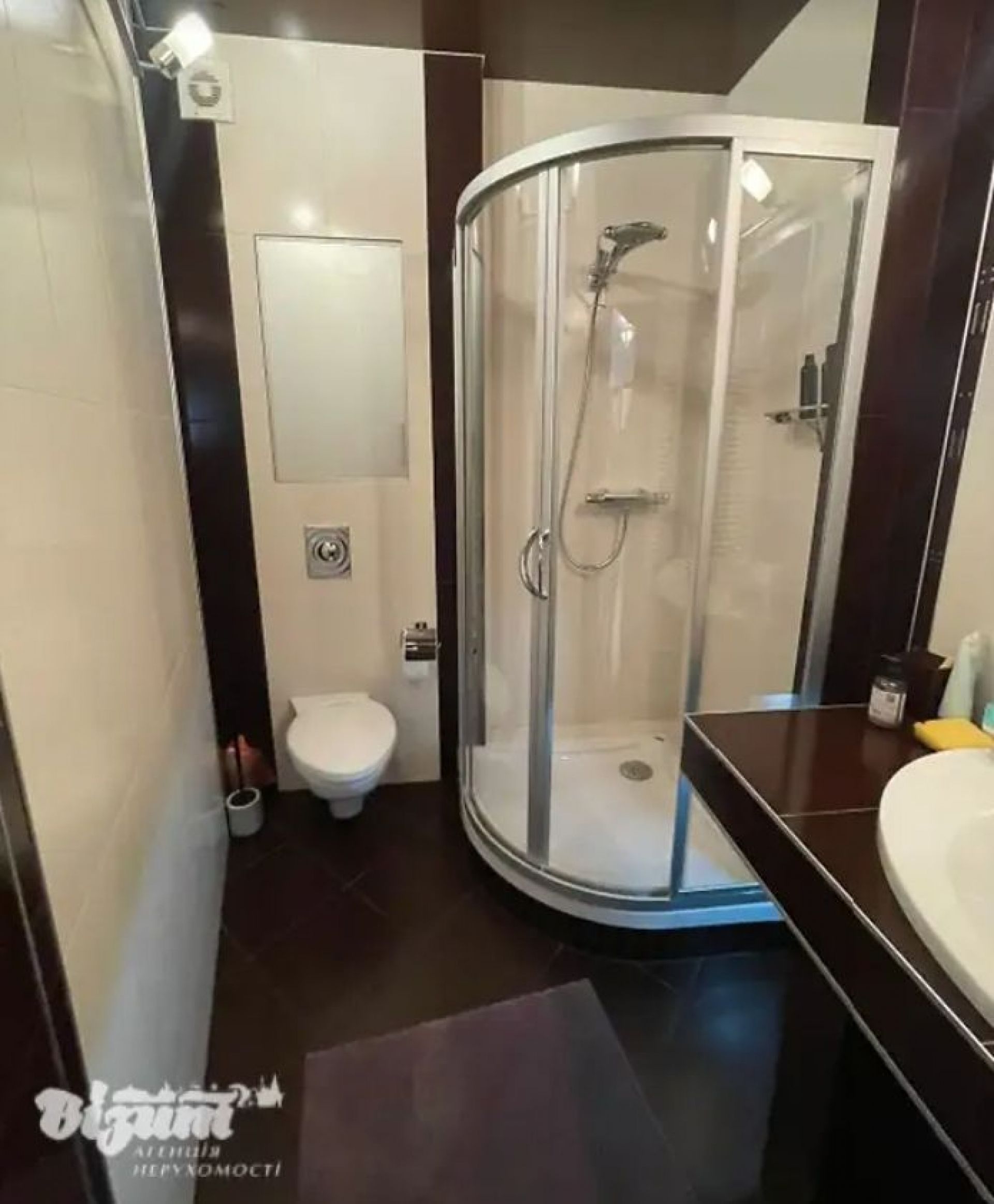 Продається оселя з вишуканим дизайнерським ремонтом. Має позначку «Преміум клас». Вона у будинку закритого типу в престижному мікрорайоні, є підземний паркінг для авто. Опалення індивідуальне, стіни з цегли. Щодо меблів та зручностей, є плазмовий телевізор, посудомийна машина, душова кабіна, ванна, система очищення питної води, вбудована шафа-гардероб, мебльована кухня, охоронна сигналізація, кондиціонер тощо.