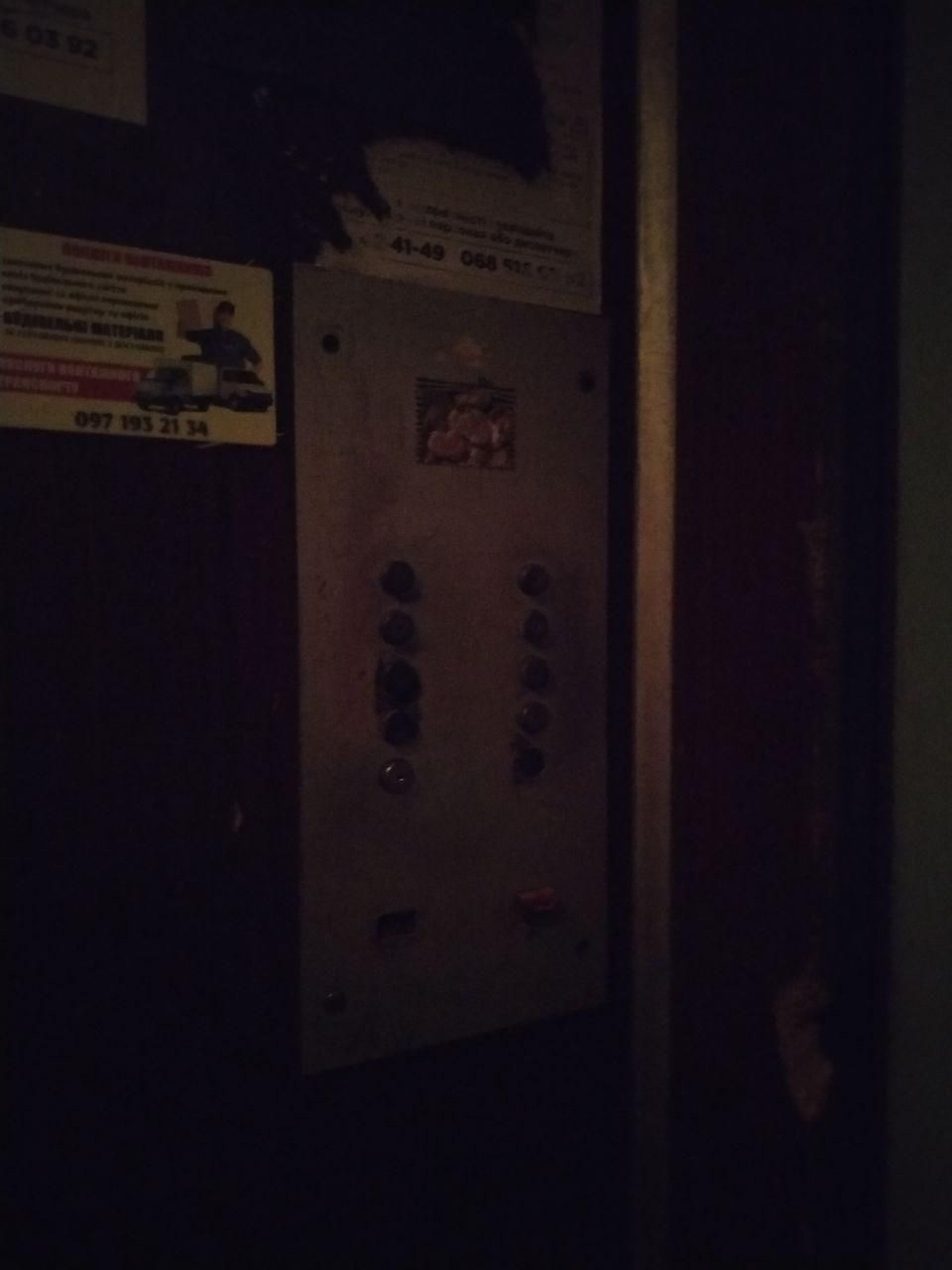 Розгледіти себе в дзеркалі важко через тьмяне світло, як і розгледіти кнопки. Можливо, жителі вже звикли до темряви в ліфті і навіть з закритими очима можуть вибрати потрібний їм поверх, але їхнім гостям годі і розгледіти, куди вони підіймаються.
