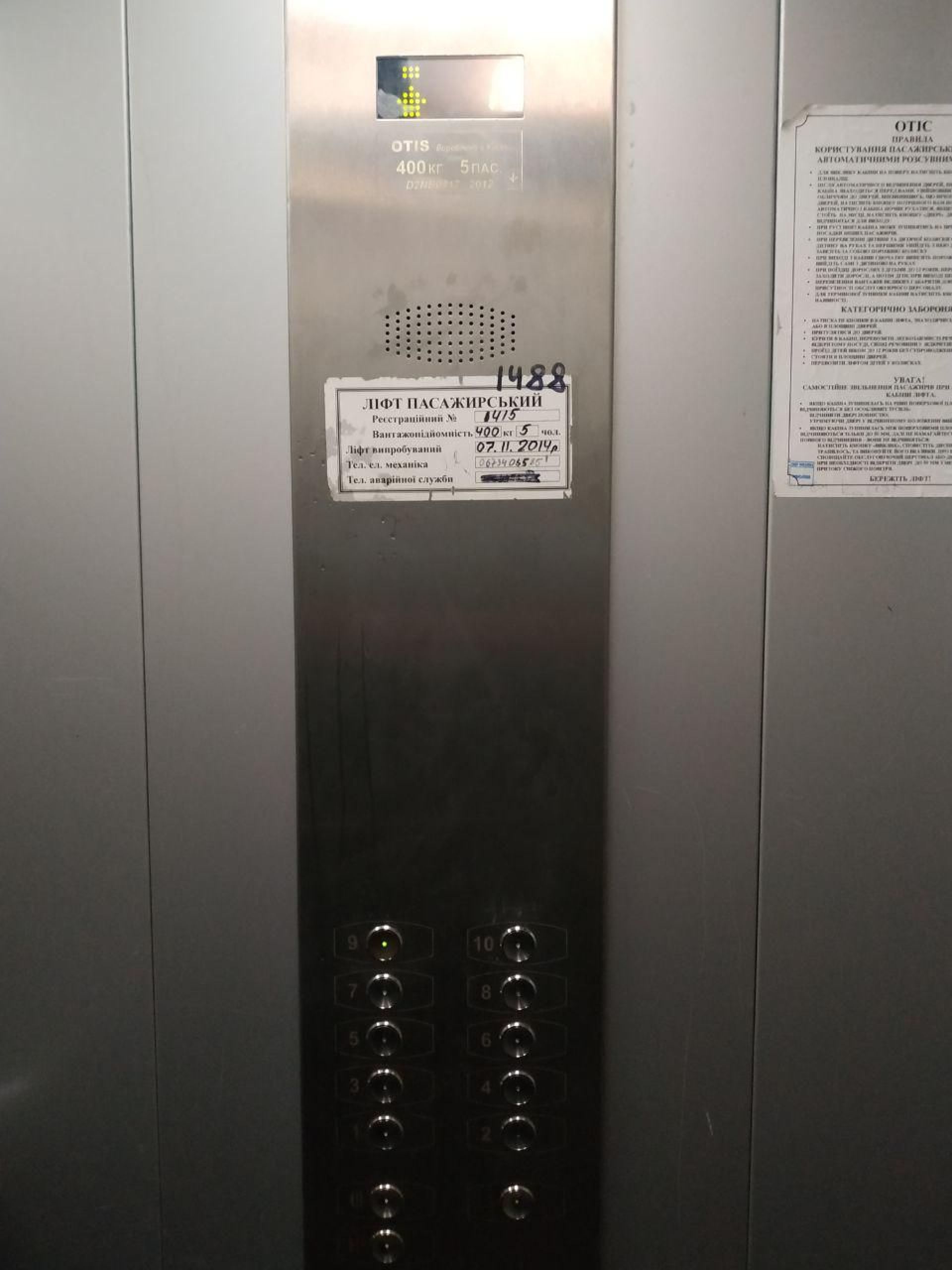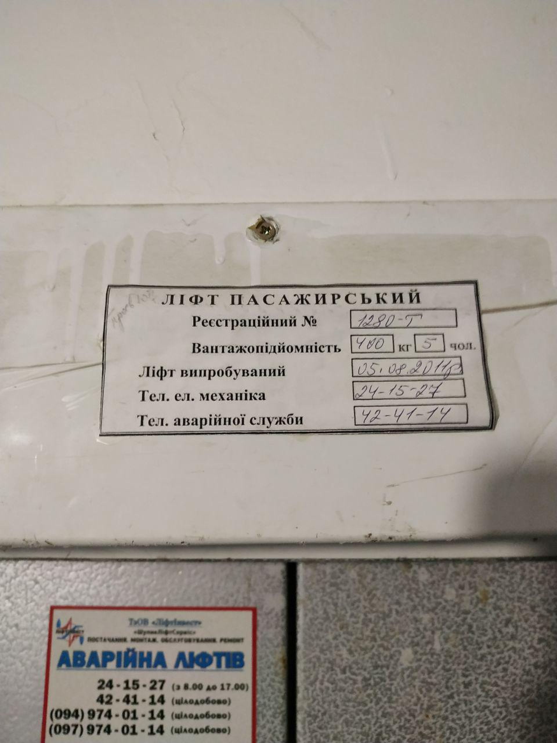 Ліфт виглядає новішим за попередні, але на ньому вже є графіті. До слова, випробували його в 2011 році, принаймні, це написано над дверима. Також там є інформація про вантажопідйомність, а також телефон механіка та аварійної служби.